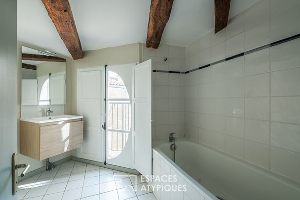 This level, topped with an exposed roof frame, benefits from two porthole windows. The apartment is located in a small, very well-maintained condominium, within a stone building accessible through a gate overlooking a quiet interior courtyard. The location is ideal, allowing immediate access on foot to shops, restaurants and the Niort market.