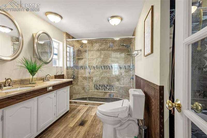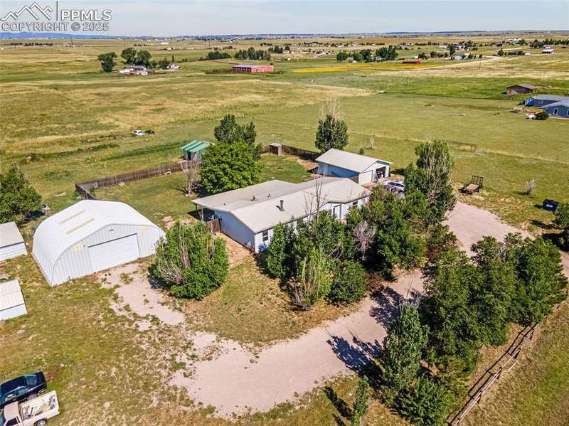 Welcome to where peace, privacy, and panoramic views come together. This beautifully maintained 3-bedroom, 2-bath ranch-style home sits on 5 acres and offers the perfect blend of comfort and functionality. Step inside to discover an open, inviting layout with spacious bedrooms-each featuring its own walk-in closet. The kitchen is a chef’s delight with a gas range, a newer dishwasher, ideal for everyday meals or entertaining with a eat-in kitchen as well as space for a formal dining space! The primary bedroom features a large walk in closet as well as a dual vanity, storage space and a custom tiled large shower. The finishing features add a luxurious touch to your private retreat. Step outside to your backyard oasis where a covered patio, included jacuzzi, and breathtaking Pikes Peak views await. A 40x30 Quonset shop and oversized 2-car garage—both with 200-amp service—offer ample space for hobbies, storage, or even a home-based business. Additional highlights include steel roofs on the home, porch and outbuildings, plus a brand-new septic system for peace of mind. Whether you're looking for space to roam, room to work, or a place to unwind, this one checks every box.