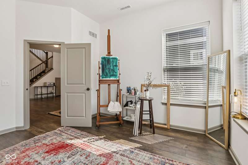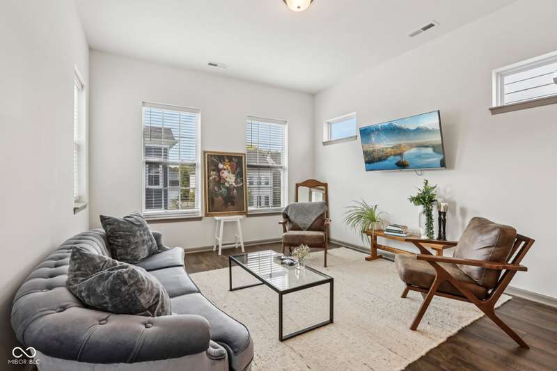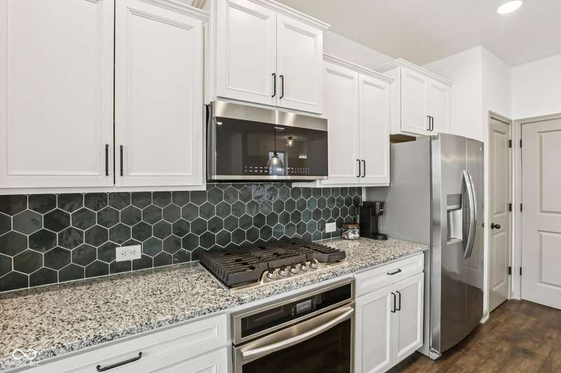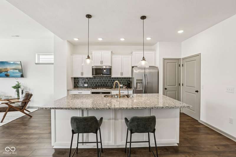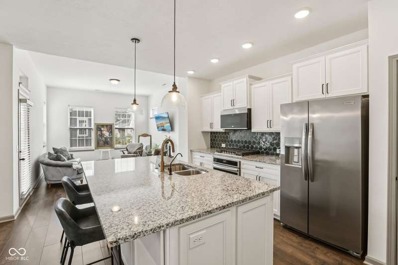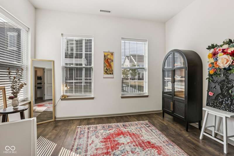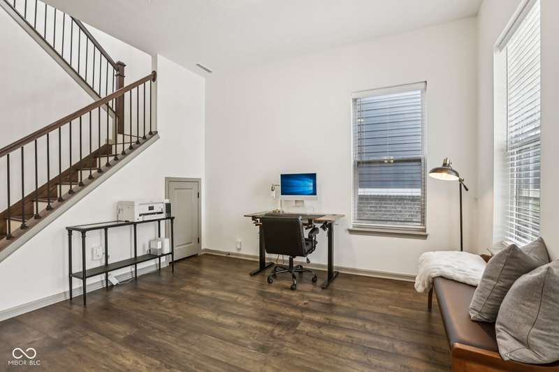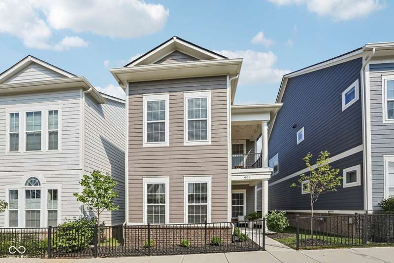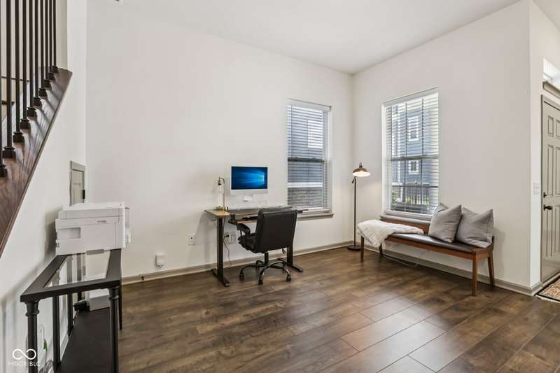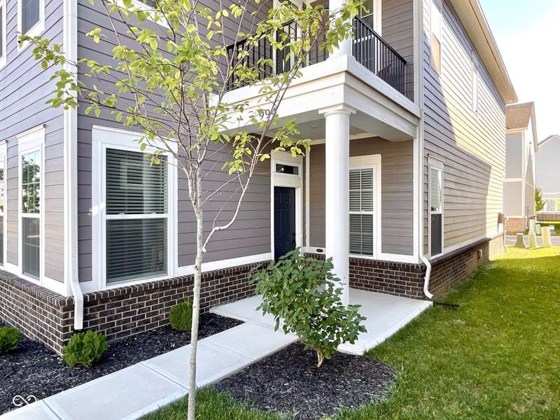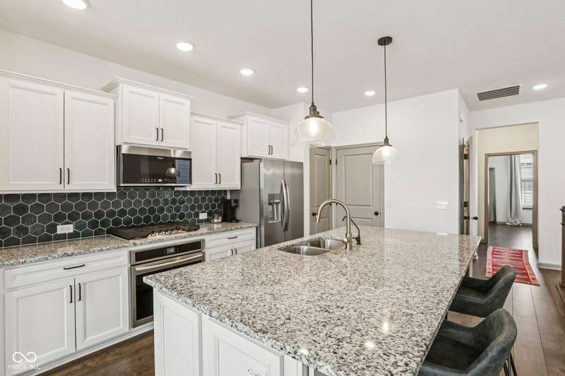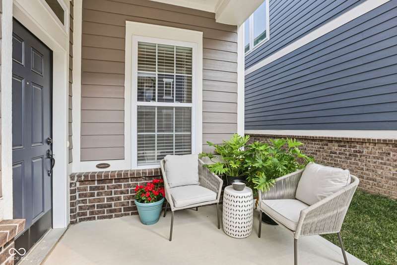 Nearly new and full of thoughtful upgrades, this home is move-in ready with style and comfort in mind. The established, manageable yard and window treatments mean you can settle right in and start enjoying the space. On the main floor, you'll find a comfortable bedroom with full bath, plus a flexible room that adapts to your needs-perfect as an office, workout space, art studio, or craft room, and easily convertible into a third bedroom if desired. Upstairs you'll find upgraded cabinets, an oversized island (larger than others in the same floorplan), a spectacular tiled backsplash, stainless steel appliances, and granite counters to create a show-stopping kitchen. Durable laminated wood floors flow throughout-no carpet to worry about. The primary suite is a true retreat with a gorgeous tiled walk-in shower, upgraded cabinets, dual walk-in closets, and a separate water closet for added privacy. A water softener is included for everyday comfort. Additional features include a 2-car attached garage, neighborhood pool, and sidewalks for easy strolls. Just 1 mile from Carmel's thriving downtown, you'll have quick access to restaurants, shopping, the Monon Trail, and the Arts District.