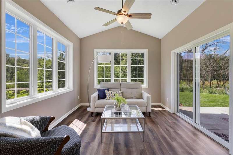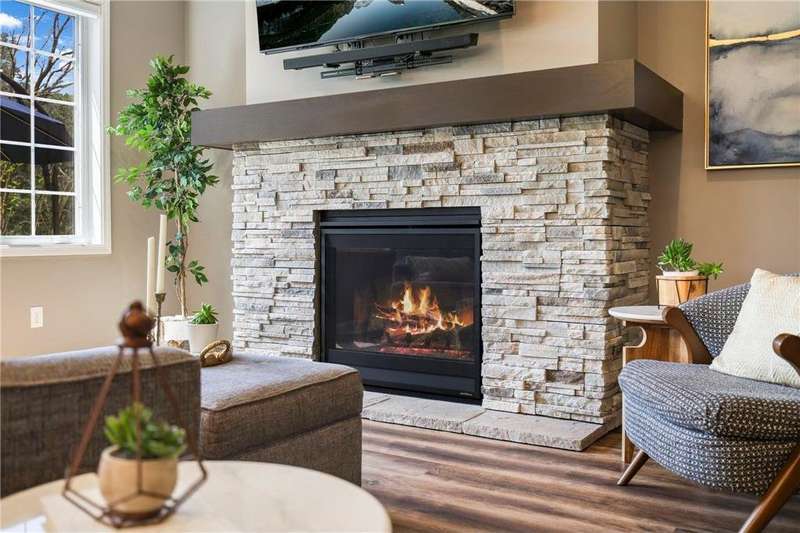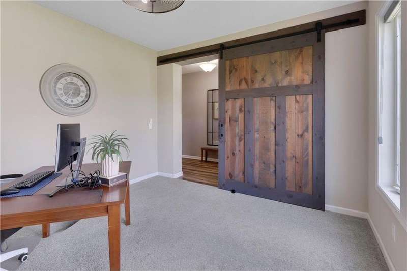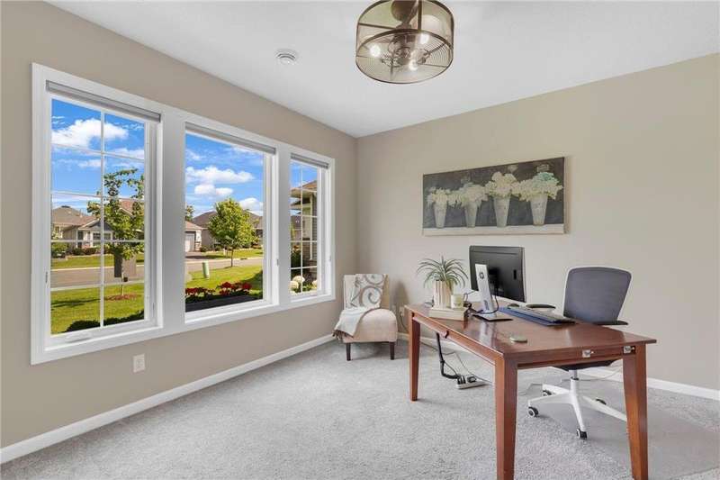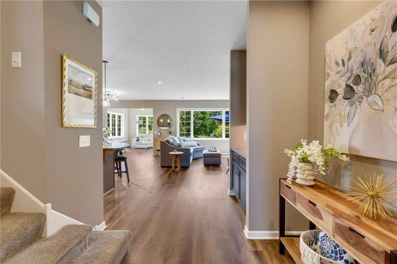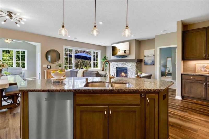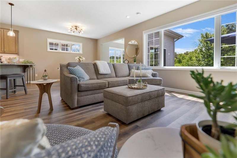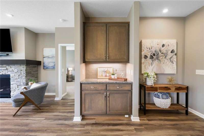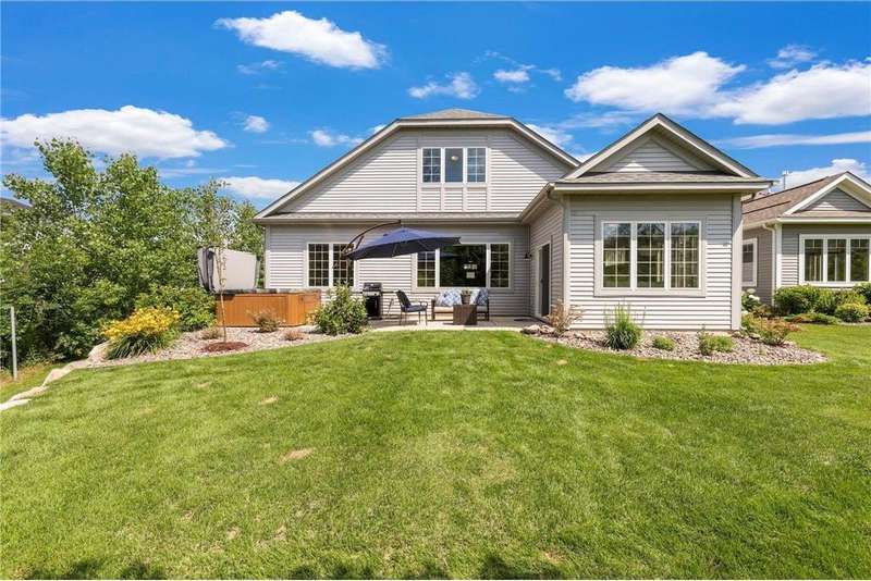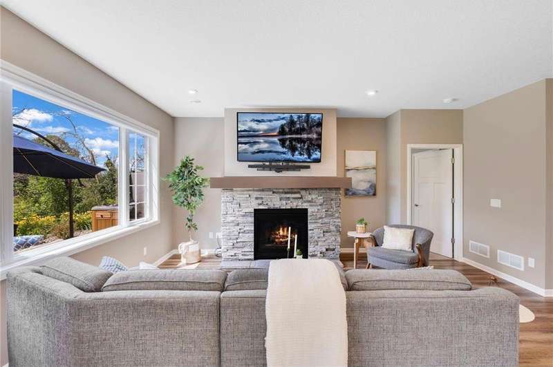 Tucked at the end of a quiet cul-de-sac, this beautifully designed home offers serene one-level living with inspiring views and effortless comfort. The open-concept main level is perfect for everyday living and entertaining, featuring a chef’s kitchen with a large center island, stainless steel appliances, a walk-in pantry, and a custom built-in buffet ideal as a wine or coffee bar. The great room is anchored by a cozy stone gas fireplace and flows seamlessly into the dining area, enhanced by transom windows that let in extra natural light. The sunroom is wrapped in windows and opens to an expansive patio with a hot tub, perfect for relaxing while enjoying views of the peaceful wetlands and mature trees. The main-level primary suite is a true retreat, offering a large picture window, a spacious walk-in closet, and a luxurious en suite bath with a custom tiled shower, separate soaking tub, and dual vanities. A main-level office or den with a stylish barn door provides flexible living space and added privacy when needed. Upstairs, you’ll find a spacious family room, two generous bedrooms, a full bath, and an additional storage room. Best of all, snow removal and lawn care are taken care of for you—offering low maintenance living in a naturally beautiful setting. With thoughtful design, upscale finishes, and a quiet location that blends privacy with convenience, this home is a must-see!