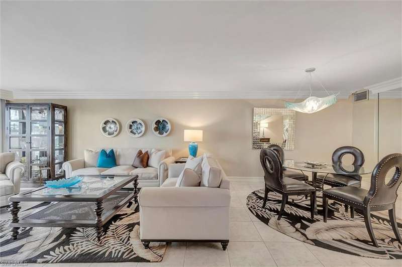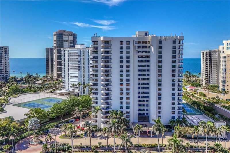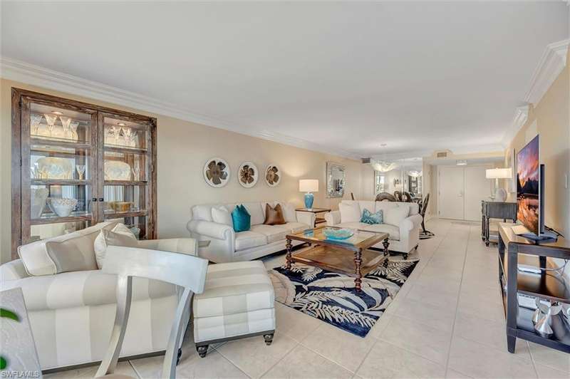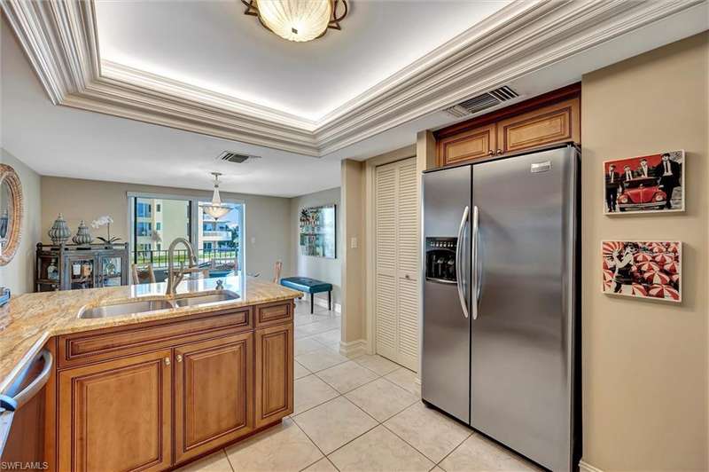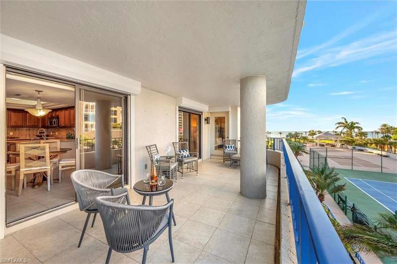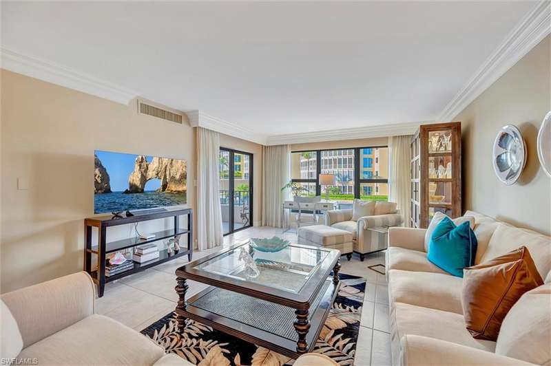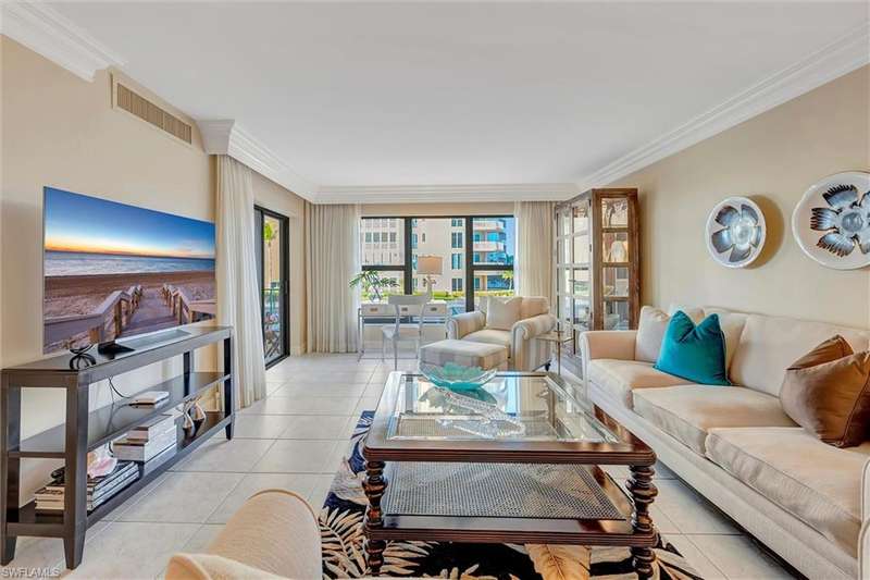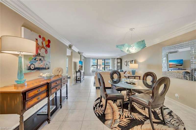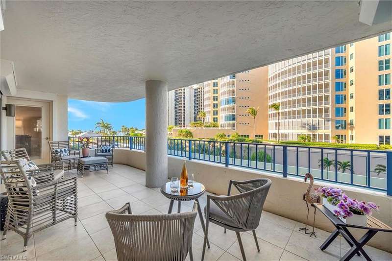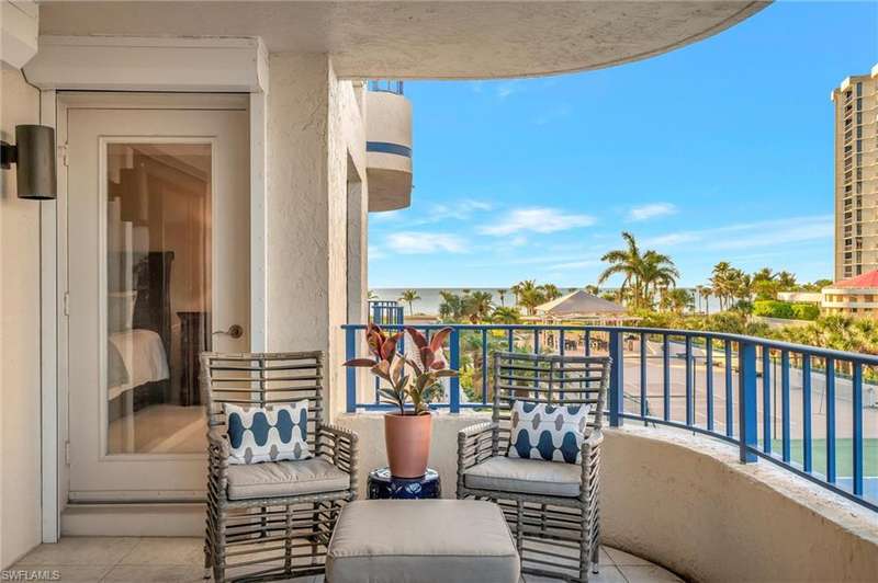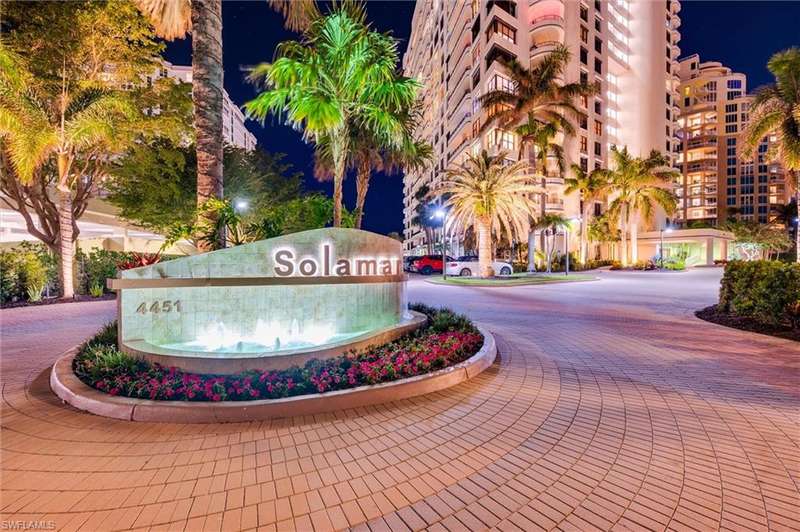 Best Value in Park Shore! Come and enjoy the gulf view from the oversized balcony of this beautiful 2 Bed/2 Bath with 1750 SF u/ac located on the 4th floor of the Solamar in the heart of Naples' premier neighborhood, Park Shore. This perfect and spacious condominium features tile flooring throughout the living areas, a remodeled kitchen with striking granite countertops, full granite backsplash, stainless steel appliances, and pantry. Updated chandeliers and recessed lighting, tiled lanai/balcony, full-size laundry room, extra-large storage closet, custom crown and base moldings, walk-in closet and 2 closets in the primary. You will love the magnificent primary bath with double vanity adorned with marble countertops, separate water closet with bidet, soaking tub & walk-in master shower. Important features for the snowbird are a whole-house dehumidification system, hurricane shutters for doors, impact glass windows, and smart thermostat. Decorated with a cozy modern flair and offered TU