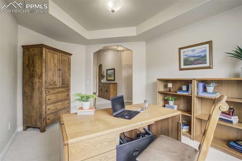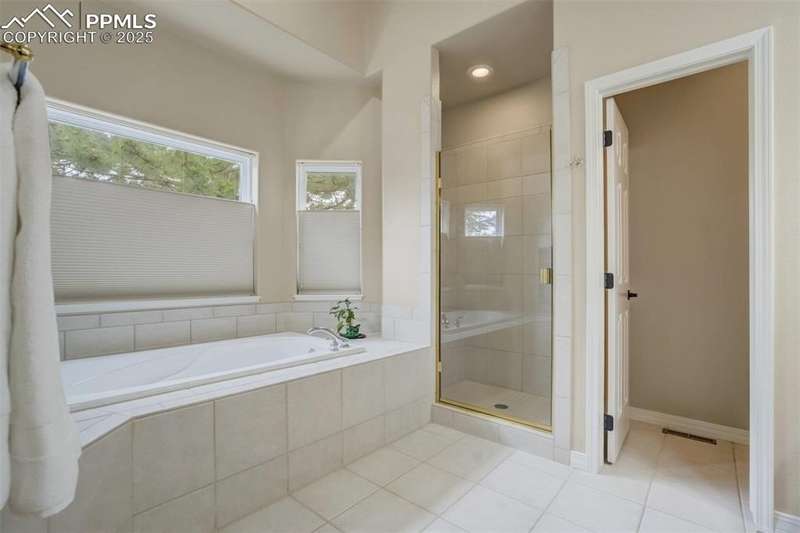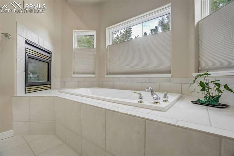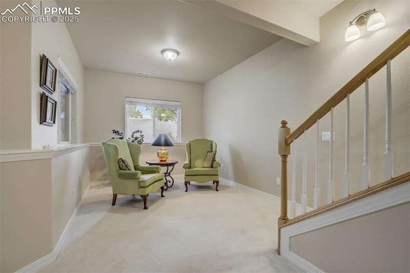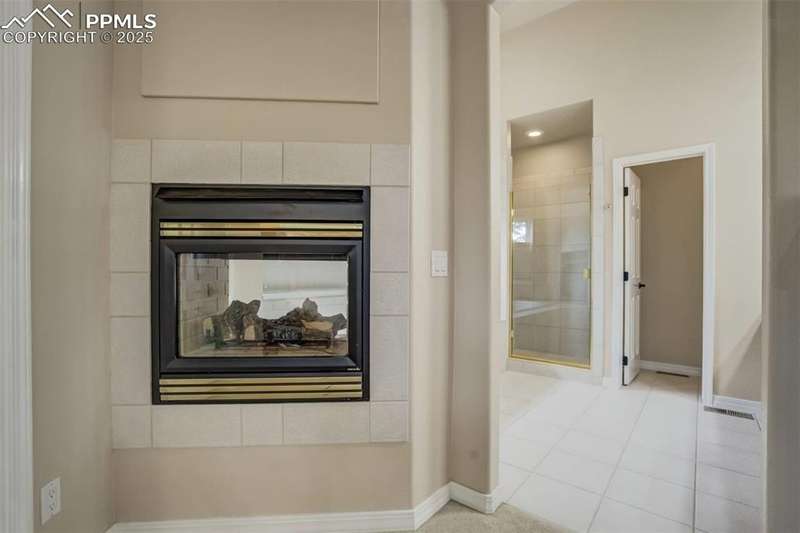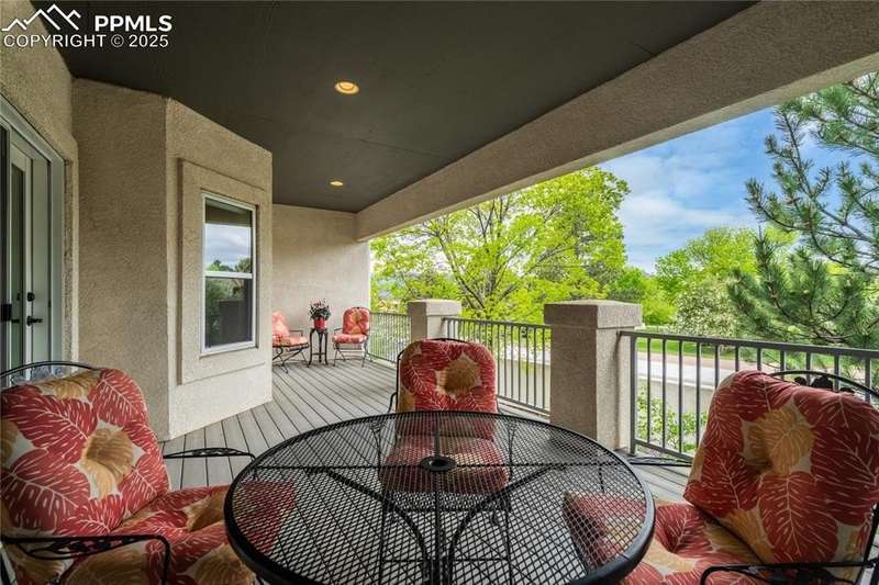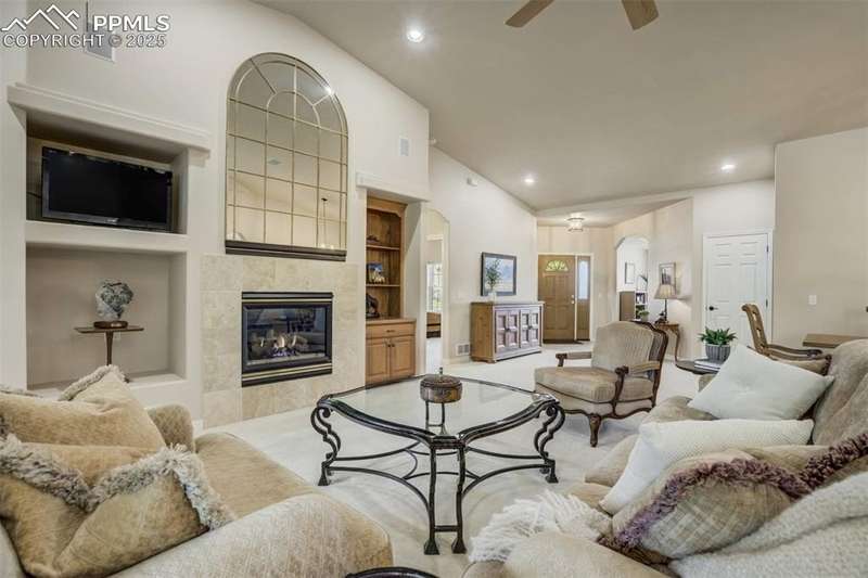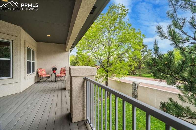 Set in the gated Eagle Villas enclave near Gleneagle & Northgate, this end-unit townhome offers low-maintenance living in D-20 with quick access to I-25, the Air Force Academy, shopping, & dining. The HOA handles exterior maintenance, snow & trash removal, lawn care, & more—ideal for lock-&-leave living. Inside, vaulted ceilings extend across the main level, beginning in the Great Room where a gas fireplace, built-in shelving, & in-wall surround sound create a welcoming, open space. The adjacent kitchen features solid-surface counters, updated hardware, ample cabinet storage, & flows into the dining nook with solid oak floors & walk-out access to a composite-covered deck overlooking the community. French doors open to the primary suite, which includes a fireplace, private deck access, walk-in closet, & a five-piece bath with soaking tub, freestanding shower, double vanity, tile flooring, & upgraded cabinet hardware. A second bedroom sits nearby, while the dedicated office—finished with a tray ceiling—looks out over the open space. The main level also includes a formal dining area & a laundry room with tile floor, built-in sink, upper cabinets, & direct garage access. The finished basement offers a bright family room with garden-level windows, built-in ceiling surround sound, a gas fireplace, & wet bar. Two large bedrooms with walk-in closets share a full bath—one of them revealing a hidden room behind the closet, perfect for a studio, podcast setup, music space, or concealed storage. A separate flex room adds more versatility. Additional highlights include upgraded door hardware throughout, 9-ft+ ceilings, energy-efficient vinyl windows, central A/C, radon mitigation, & an attached two-car garage with a painted epoxy floor, finished walls, & full-length cabinet storage. A front porch sitting area offers mountain views, while tile roofing, stucco siding, & a quiet private road complete the setting.