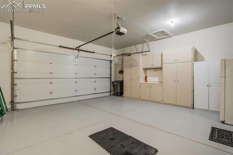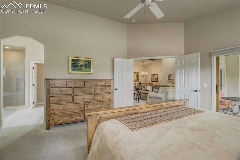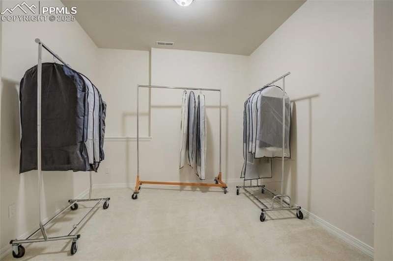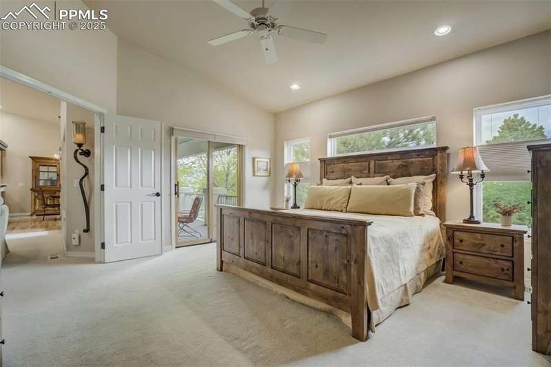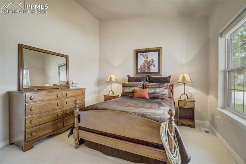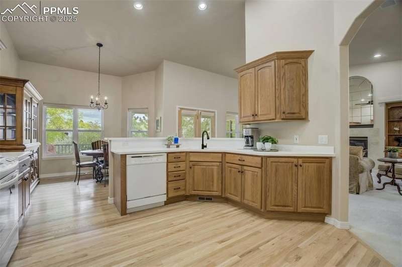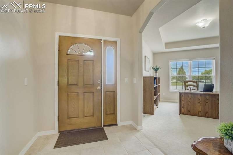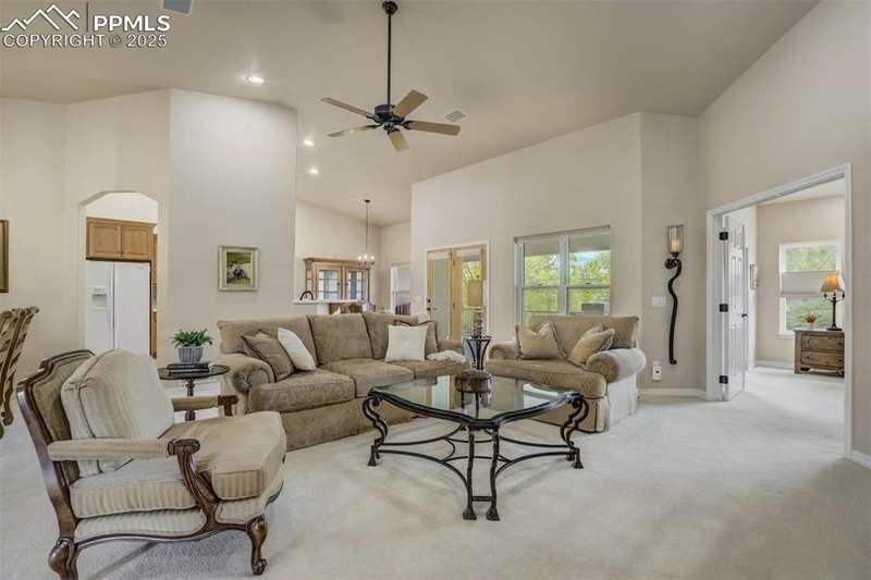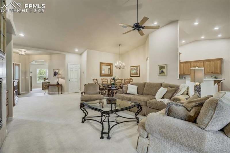 Set in the gated Eagle Villas enclave near Gleneagle & Northgate, this end-unit townhome offers low-maintenance living in D-20 with quick access to I-25, the Air Force Academy, shopping, & dining. The HOA handles exterior maintenance, snow & trash removal, lawn care, & more—ideal for lock-&-leave living. Inside, vaulted ceilings extend across the main level, beginning in the Great Room where a gas fireplace, built-in shelving, & in-wall surround sound create a welcoming, open space. The adjacent kitchen features solid-surface counters, updated hardware, ample cabinet storage, & flows into the dining nook with solid oak floors & walk-out access to a composite-covered deck overlooking the community. French doors open to the primary suite, which includes a fireplace, private deck access, walk-in closet, & a five-piece bath with soaking tub, freestanding shower, double vanity, tile flooring, & upgraded cabinet hardware. A second bedroom sits nearby, while the dedicated office—finished with a tray ceiling—looks out over the open space. The main level also includes a formal dining area & a laundry room with tile floor, built-in sink, upper cabinets, & direct garage access. The finished basement offers a bright family room with garden-level windows, built-in ceiling surround sound, a gas fireplace, & wet bar. Two large bedrooms with walk-in closets share a full bath—one of them revealing a hidden room behind the closet, perfect for a studio, podcast setup, music space, or concealed storage. A separate flex room adds more versatility. Additional highlights include upgraded door hardware throughout, 9-ft+ ceilings, energy-efficient vinyl windows, central A/C, radon mitigation, & an attached two-car garage with a painted epoxy floor, finished walls, & full-length cabinet storage. A front porch sitting area offers mountain views, while tile roofing, stucco siding, & a quiet private road complete the setting.
