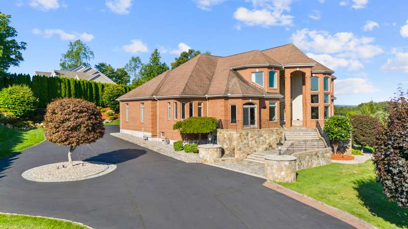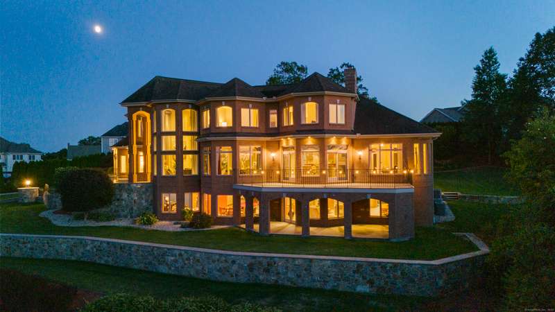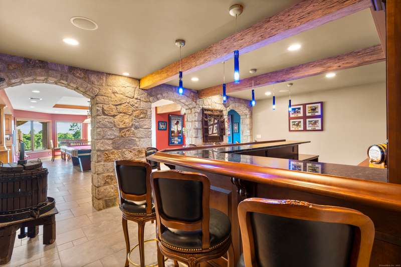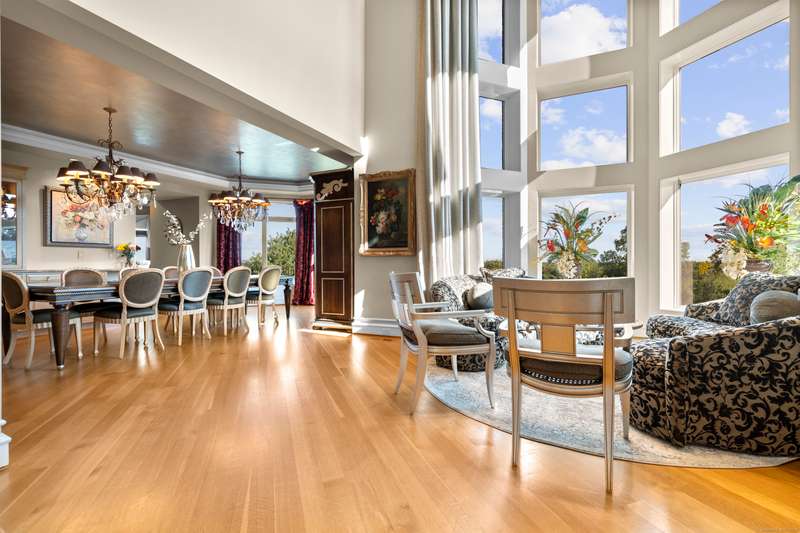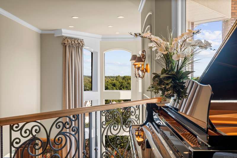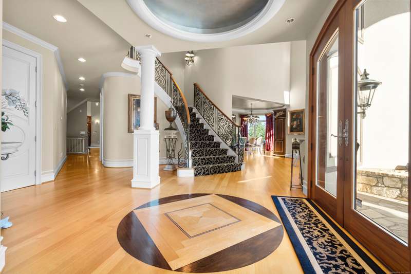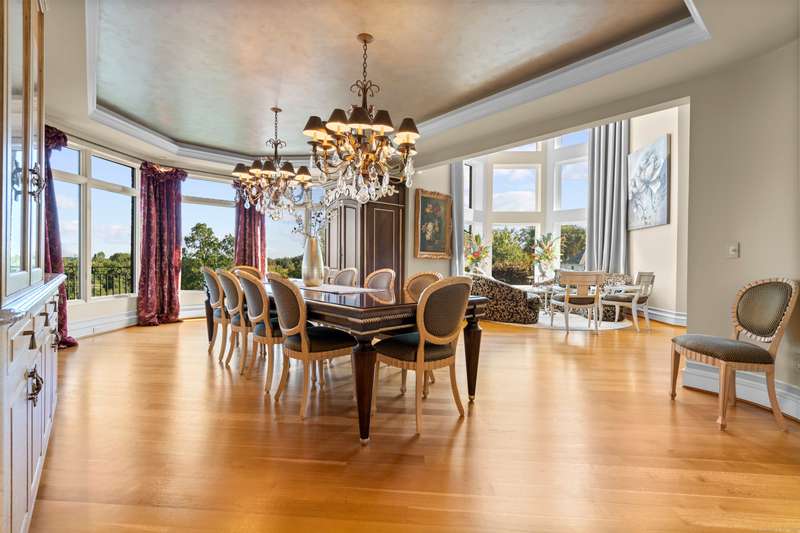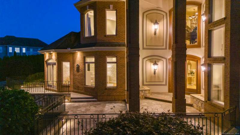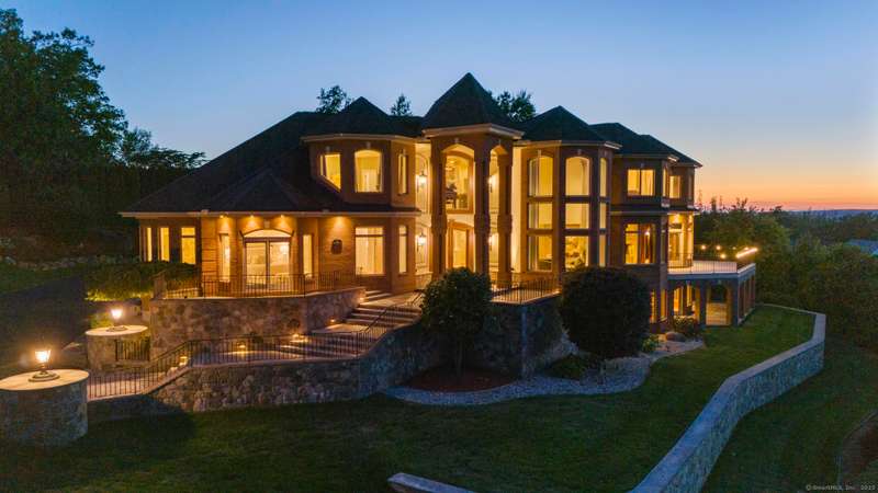 A true masterpiece of architecture and design, this one-of-a-kind estate commands attention from every angle. Perched in an exclusive enclave, the residence boasts breathtaking, unobstructed views of the Hartford skyline, offering a rare combination of elegance, privacy, and city vistas. The stately brick exterior, accented by soaring turrets and expansive walls of glass, exudes timeless grandeur. By day, the home is filled with natural light that pours through oversized windows, while by night, dramatic architectural lighting transforms the estate into a glowing landmark. Inside, craftsmanship meets modern luxury at every turn. The grand foyer makes a striking first impression with intricate inlaid flooring, sweeping staircase, and custom ironwork. Multiple living areas showcase floor-to-ceiling windows framing skyline views, while the gourmet kitchen is a chef's dream, outfitted with rich custom cabinetry, premium appliances, and granite counters. Designed for both intimate living an
