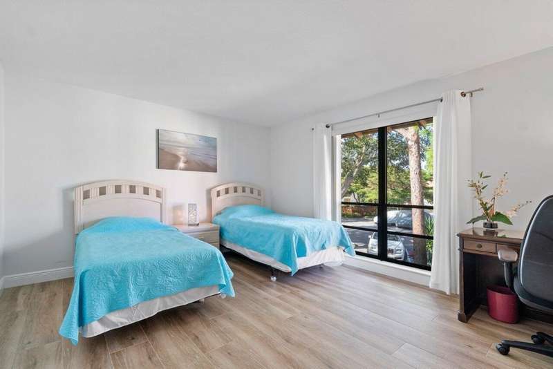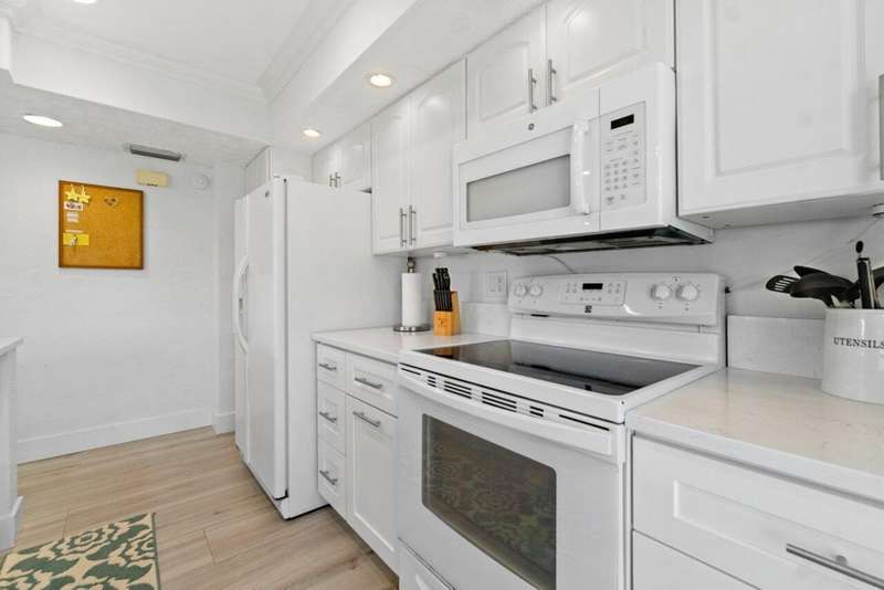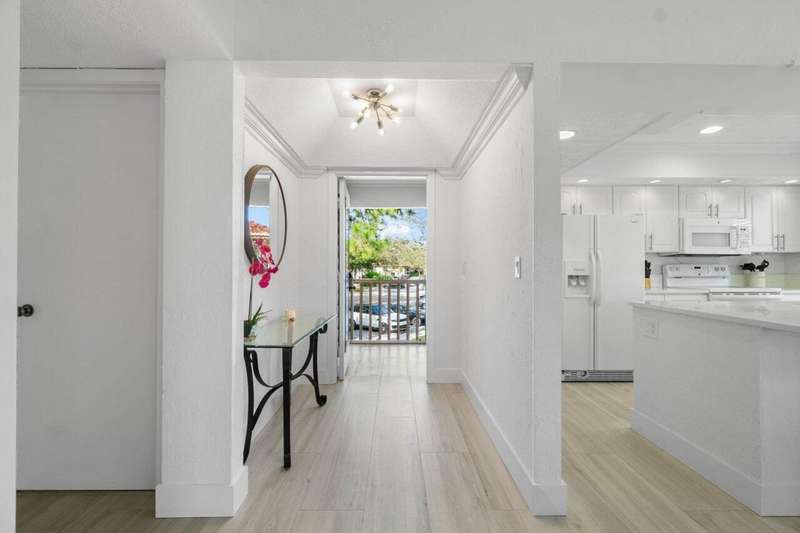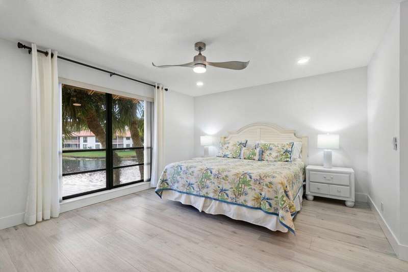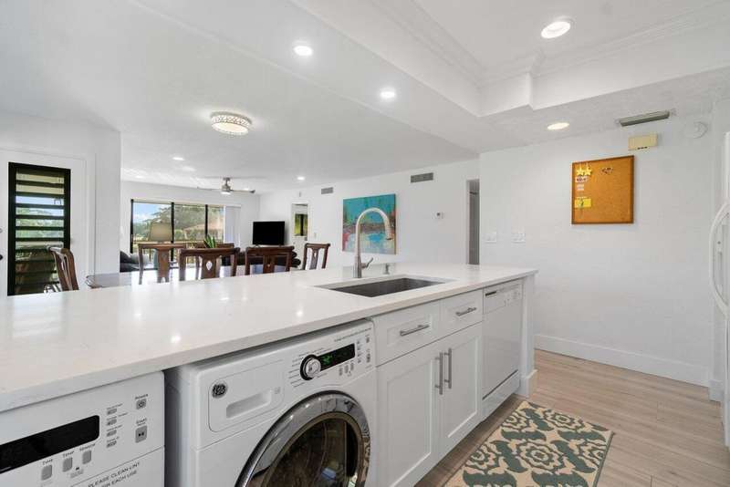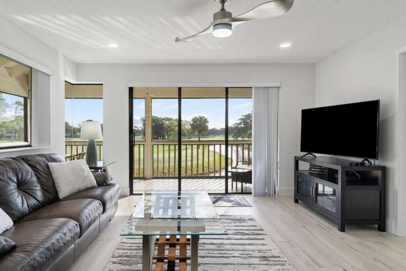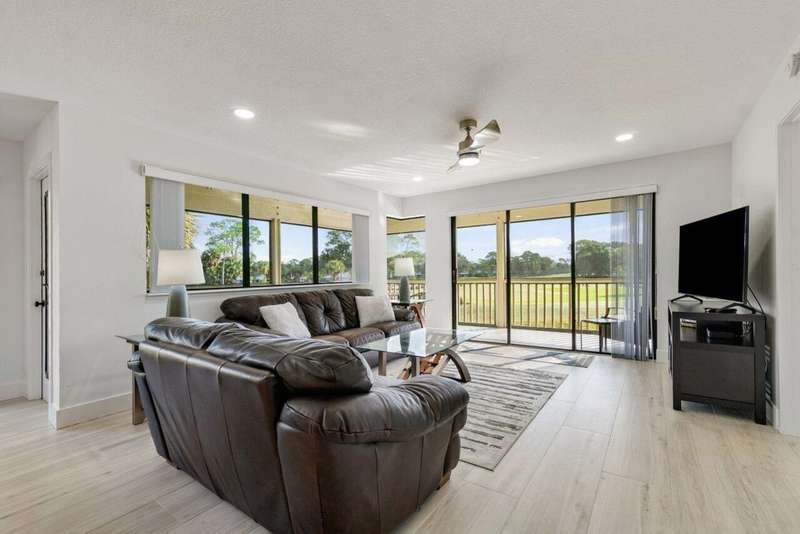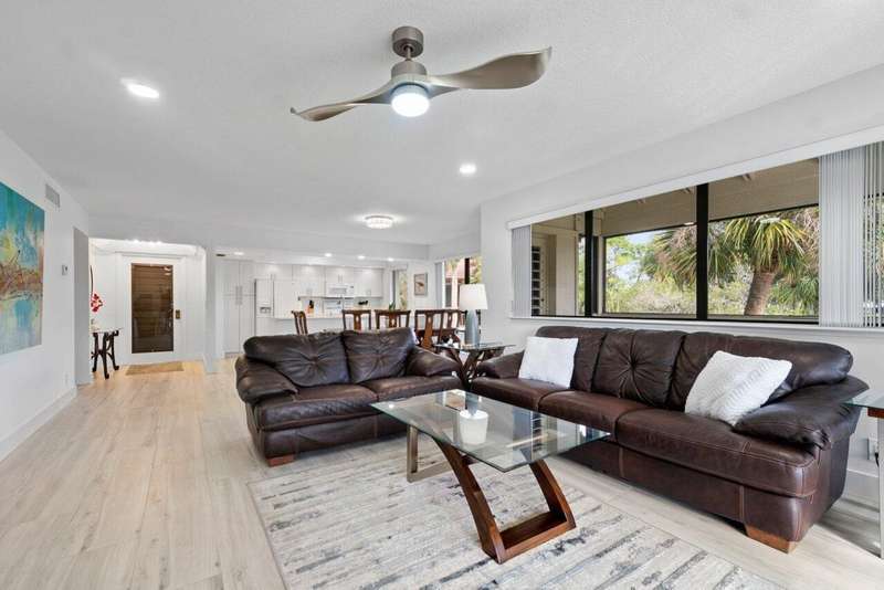 Wake up to sunlit mornings and peaceful golf course views in this bright, furnished, and tastefully renovated 2BR/2BA condo on a private 2nd-floor walk-up. The open-concept kitchen features white quartz countertops and recessed lighting, setting the tone for modern, easy living. Expansive windows fill the home with natural light, showcasing clean lines, contemporary finishes, and beautiful flooring--no carpet throughout. The spacious primary suite includes a king bed, while the guest room with twin beds provides comfort for visitors. Relax on the large, wrap-around screened balcony overlooking serene water and lush golf views. Enjoy two sparkling community pools and a prime location just minutes from dining, shopping, and beaches.Discover the perfect blend of comfort, style, and location