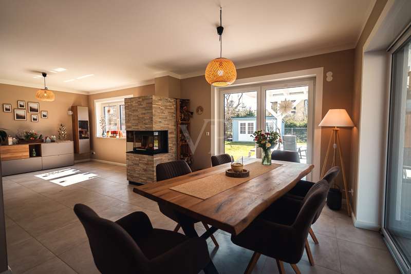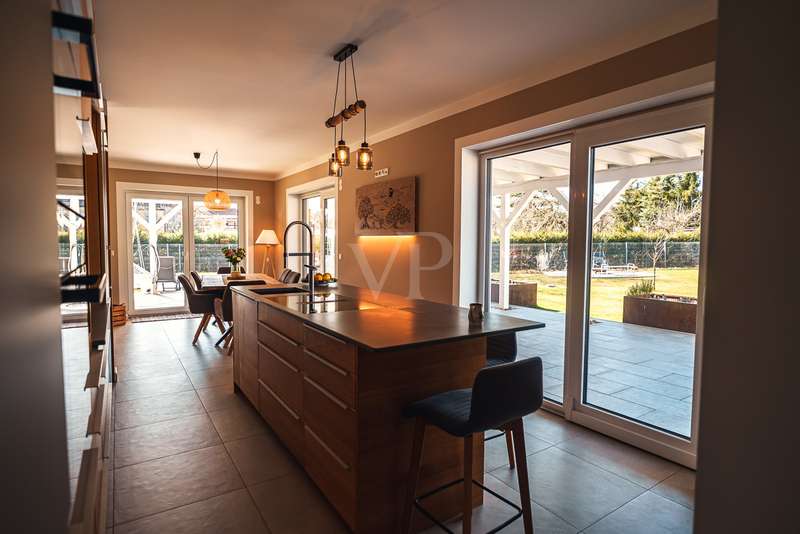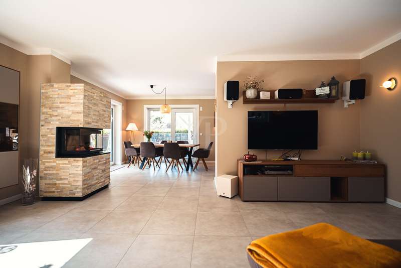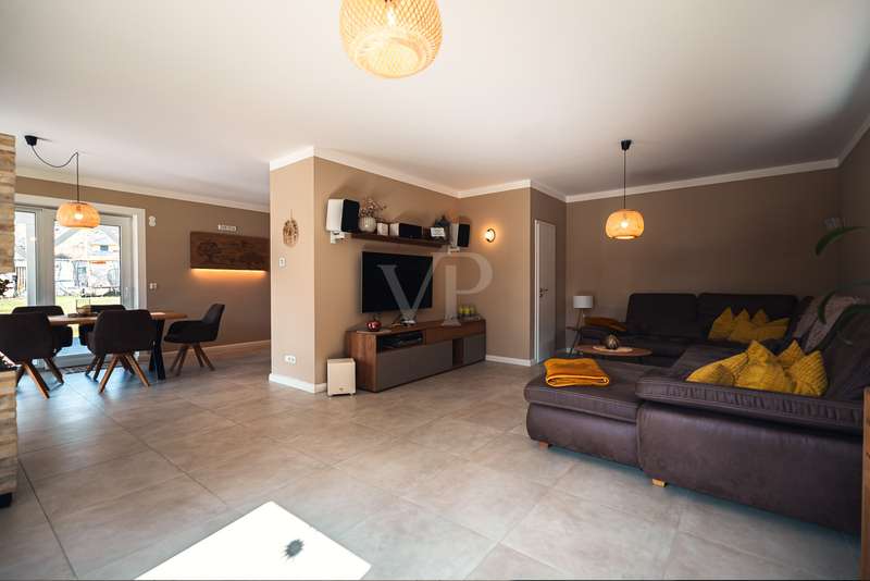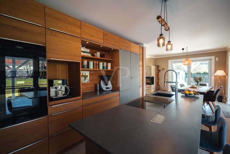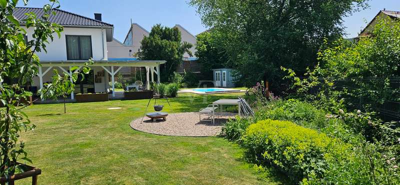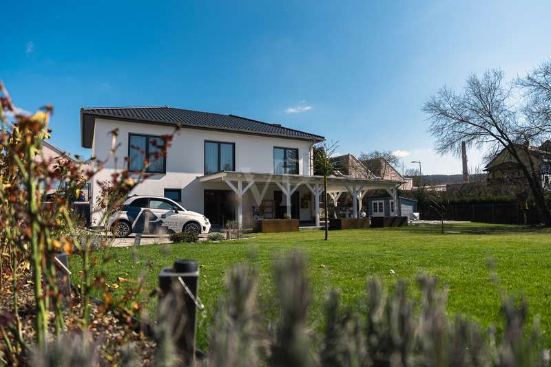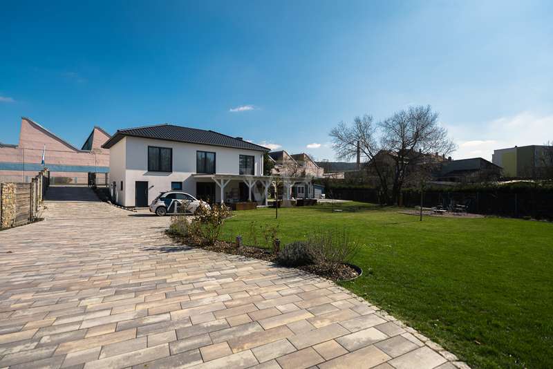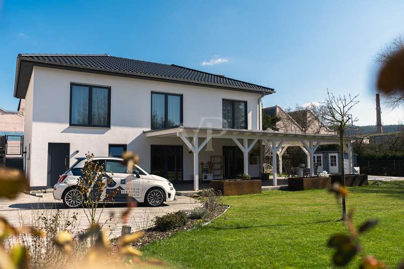 Exclusive new-build property in the heart of Stadtilm - your dream city villa with exceptional comfort and luxury This impressive new-build property, completed in 2021, combines the highest quality, modern architecture and innovative comfort in one of the most sought-after locations. The town villa was built in solid construction with Poroton and represents a true gem on the real estate market with its well thought-out room layout and exquisite furnishings. Highlights of the property: Solid construction with Poroton: Stability, durability and energy efficiency come together in this high-quality built urban villa. The building was constructed using state-of-the-art construction methods, which not only ensures a comfortable living environment, but also guarantees long-term value appreciation and sustainable use. Generous living space and garden: With a living space of 177.31 m², this property offers a generous room layout that leaves nothing to be desired. The 1431 m² plot allows for a high quality of life and offers enough space for your personal retreat and development opportunities. Energy efficiency and sustainability: Equipped with an air/water heat pump including a combined storage tank and underfloor heating throughout the house, this home not only offers a comfortable indoor climate, but also excellent energy efficiency. The windows with triple insulating glazing and integrated sun protection also help to reduce energy costs. Innovative technology: KNX building automation ensures maximum convenience. You can control the lighting, heating and even the blinds at the touch of a finger, allowing the home to be perfectly adapted to your needs. Stylish interior design: The interior impresses with the use of high-quality materials, including fine tiled floors and a high-quality real wood kitchen with built-in appliances from the Miele brand that leaves nothing to be desired. This first-class equipment is rounded off by modern design accents and well thought-out details that lend the interior a timeless elegance. Another highlight is the high-quality bathroom fittings which, like the sink units in the utility room, are already included in the purchase price. Exclusive outdoor area: The outdoor area was planned by an architect and realized with renowned companies. A rainwater cistern ensures sustainable irrigation of the garden, and the automatically irrigated planting areas provide a green oasis. The lawn is maintained by a robot mower, so you have more time to enjoy the beauty of your garden. Spacious patio area: The spacious patio area, which is an extended living room in summer, is not only the perfect place to spend relaxing hours outdoors with a walk-on wooden patio cover, but also offers potential for expansion. The covered terrace on the first floor could be used for a spacious terrace on the upper floor, creating additional space for your individual wishes. Saltwater pool with counter-current system: A real highlight of this property is the 6x3 meter heated saltwater pool with a counter-current system, which has been set into the ground. Surrounded by a durable larch wood plank surround, which also serves as a sun deck, the pool offers a luxurious place to relax and enjoy sporting activities. A heat pump ensures pleasant water temperatures, allowing the swimming season to be extended. The technology for the pool is located in the adjoining garden shed, which also offers practical added value. Expansion potential: The property has numerous parking spaces and a garage complex. This is also part of the property and therefore represents an additional option for your individual needs. Of the 8 garages available, one is currently used as a passageway and one as a storage facility for wood, meaning that 6 garages can be used as parking spaces. Conclusion: This exclusive urban villa from 2021 sets standards in terms of comfort, luxury and sustainability. It combines innovative technology, a well thought-out room layout and high-quality furnishings with an outdoor area that leaves nothing to be desired with a saltwater pool, a spacious terrace and a professionally landscaped garden. The property not only offers a luxurious living experience, but also the potential for individual adaptations and extensions. A home that meets the highest standards and is ideally equipped for the future. Don't miss out on this unique opportunity and arrange a viewing today!