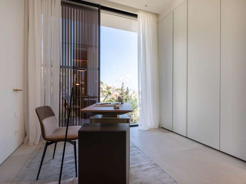 This luxury villa offers over 500 square metres of sophisticated living space, seamlessly blending indoor and outdoor environments. Key features of this exceptional property include a private pool, expansive terraces, a central atrium that floods the interior with natural light, and underground parking for three cars. Situated on gently sloping land, the villa is surrounded by landscaped gardens with an infinity pool at the lowest point. The terraces and living areas are oriented towards the mountains, enhancing the open-concept interior connection to the natural surroundings. At the heart of the ground floor is a plant-filled atrium, illuminating the space with natural light. Radiating from this central feature are the entrance hall and staircase, a pantry/utility room, a double bedroom with an en suite bathroom, and a spacious open-concept kitchen, dining, and living room. These areas are arranged on split levels, reflecting the terraced design of the outdoor spaces. Floor-to-ceiling glass along one side of the living area offers uninterrupted views of the terrace dining and seating areas, maximizing the potential for outdoor living. The first floor comprises three additional double bedrooms, each with its own bathroom. Two of these bedrooms face the atrium, ensuring plenty of natural light, and have access to a shared terrace with stunning countryside views. This modern home is constructed to the highest standards, using the finest materials and top-quality appliances. The consistent use of pale woods, natural stone cladding, and abundant glass throughout the interior and exterior creates a cohesive aesthetic. This design ensures the property is warm, bright, and contemporary, while providing a close connection to nature and convenient access to Palma and the coast. Please contact us to arrange a viewing.