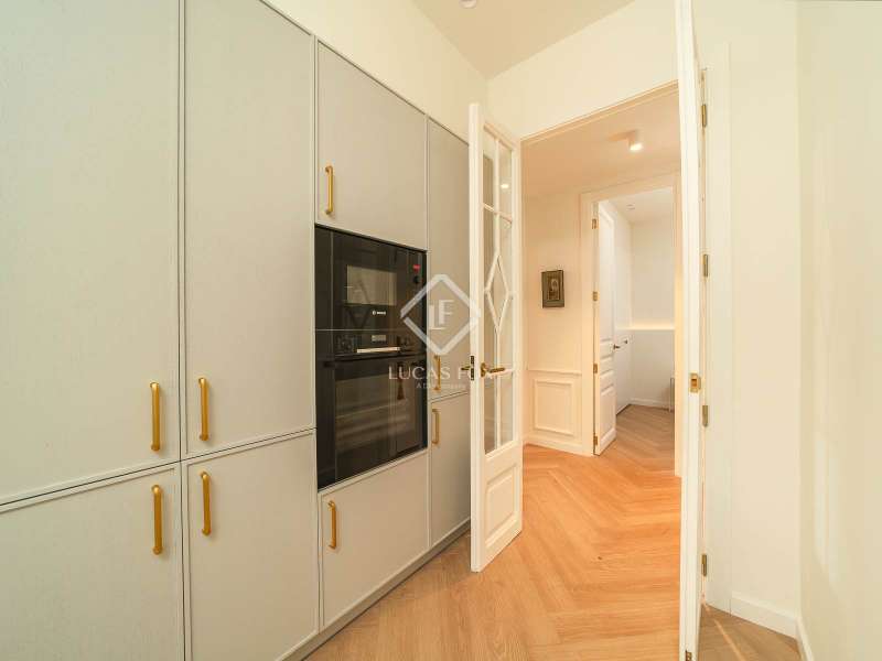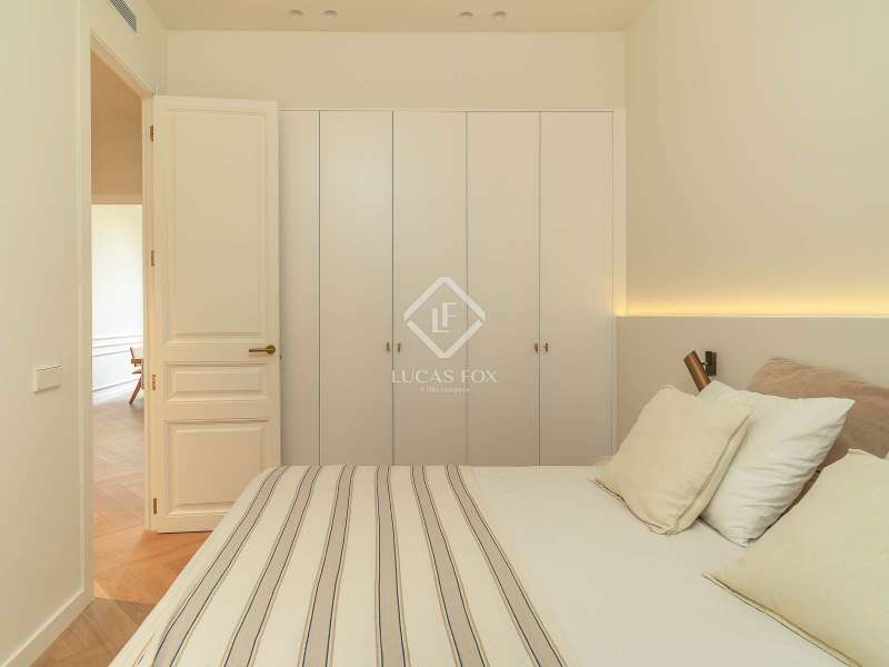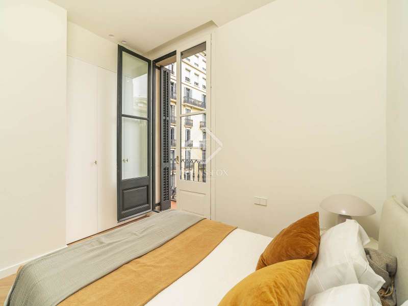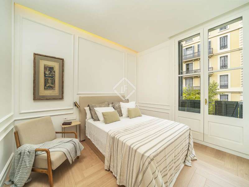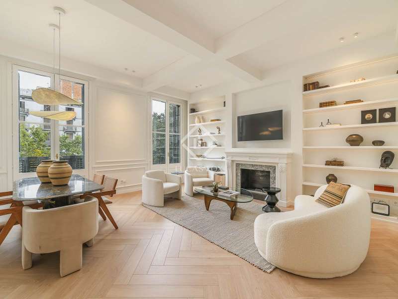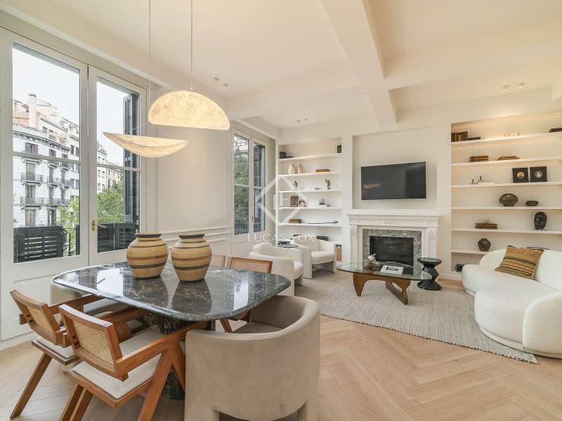 Located at the intersection of Diputació and Girona, in the heart of the Eixample district, this property is in one of Barcelona's most sought-after areas . Girona Street has recently been renovated and pedestrianized, transforming it into a promenade filled with restaurants, shops, and green areas. Its prime location, between Passeig de Gràcia and Passeig de Sant Joan, offers an unbeatable quality of life and a wide range of dining and entertainment options. A true pied-à-terre in the city. The 100 m² property has been renovated with a contemporary design that respects La Finca's classic character. High ceilings, moldings, natural wood floors, and a bioethanol fireplace are combined with modern and functional finishes. The spacious 30 m² dining room living room has two large windows that access onto balconies with pleasant views of Girona Street. The kitchen is separate and has a dining area. The night area features three double bedrooms: two exterior and one interior, opening onto a patio. The master suite has a private bathroom. There is also a second bathroom that serves the other bedrooms and doubles as a guest bathroom. All bedrooms have built-in wardrobes. A move-in ready property , renovated with attention to detail, maximizing natural light and offering comfortable and elegant spaces. La Finca has been completely renovated, yet retains the charm of a period building from the early 20th century. Its majestic entrance, concierge service, and original paintings and frescoes are of great artistic and architectural value. The property has a private storage room and on- building parking, with direct access through a large, self-opening wooden gate.
