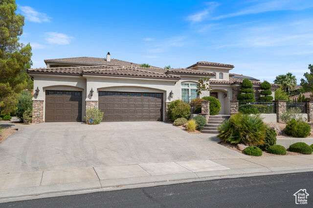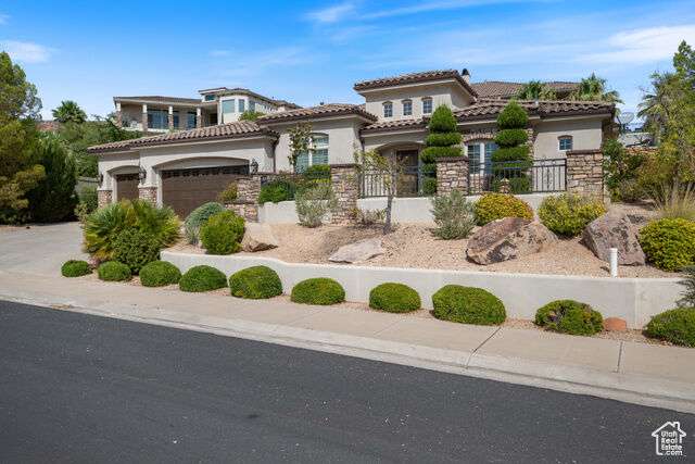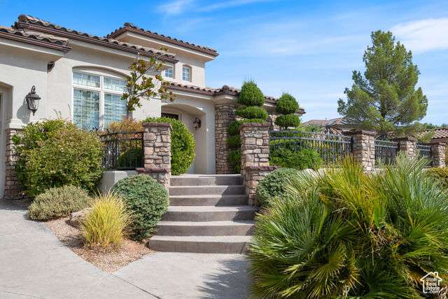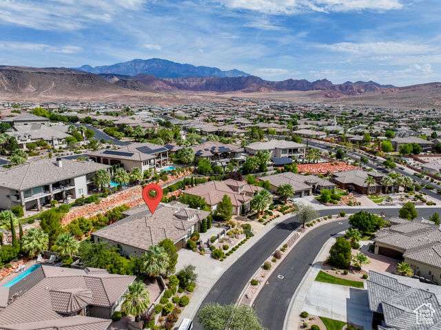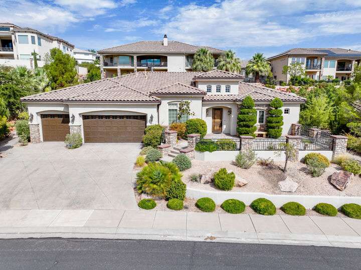 Welcome home to this custom house located in the desirable community of Northbridge at Green Springs. The home features an inviting layout with spacious rooms, coffered ceilings, an open dining and kitchen area, and easy access to outdoor living spaces. The entry and front courtyard offer beautiful views of the Desert Reserve and Pine Valley Mountains. The primary suite is privately situated with access to the outdoor living space, and the primary bathroom includes a soaking tub and a walk-in stone surround shower. There is a flex room that can serve as an office or guest suite, along with two additional guest suites with en suite bathrooms. The beautifully manicured backyard with mature trees provides a wonderful space for quiet mornings and for evening entertaining.