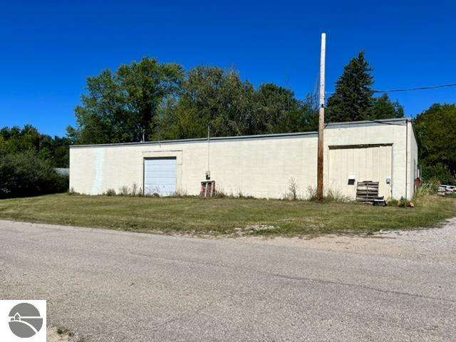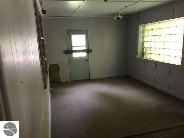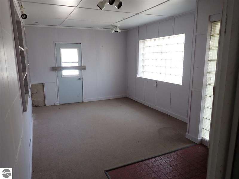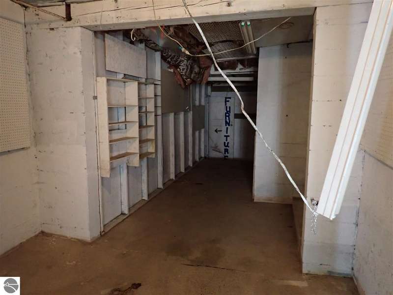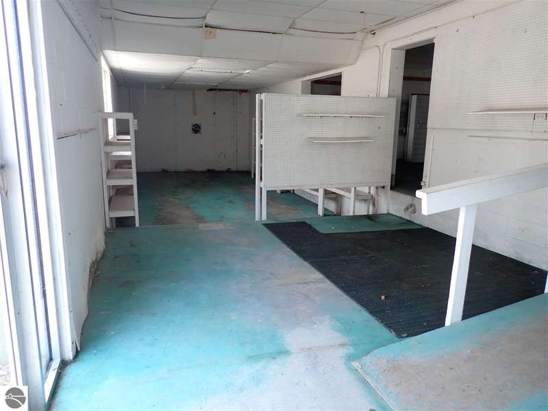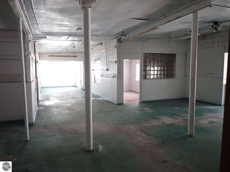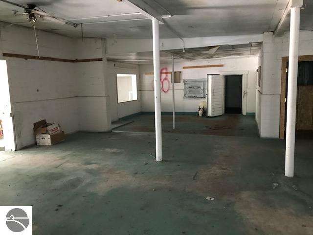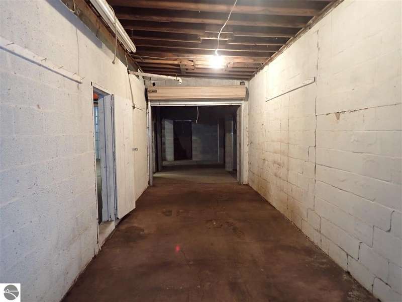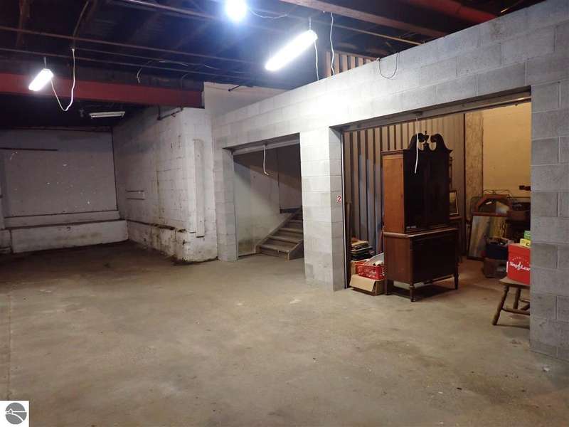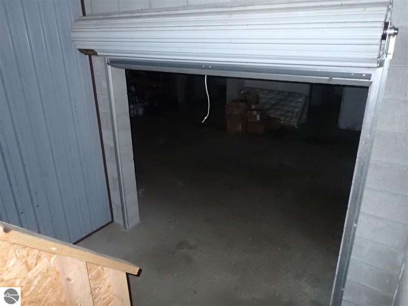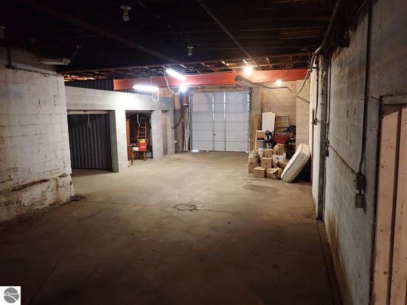 5700 sqft. Block building; Property is in the Village of Beulah and has village water and sewer (although it appears to be in Benzonia). Several large expansive area throughout and includes 7 storage rooms with 5 roll-up doors. Could be rented as 2 separate entities. The two East doors clear 9 1/2 ft +. Wheel chair accessible at both levels (lower level & upper level).3 Phase power- Consumers Power Co. Inside loading area. Formerly a dairy - tile walls remain. Two - I Beams located over central garage area suitable for hoist installation. (9ft 8'' Beam Clearance) The two East doors clear 9 1/2 ft +.