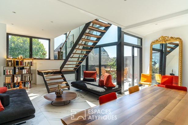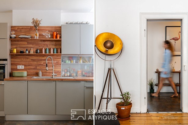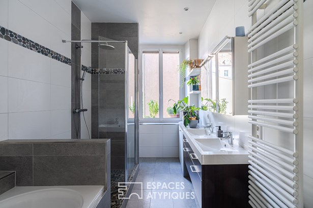 With its beautiful windows, the bright 28 m2 living room leads to the master bedroom and its custom-made dressing room on one side, and the two other bedrooms on the other. One of these is currently furnished as an office. The high ceilings have made it possible to install an ingenious mezzanine system in these two rooms, optimising the floor space of the flat. The building has a shared terrace in the courtyard, perfect for socialising with neighbours.