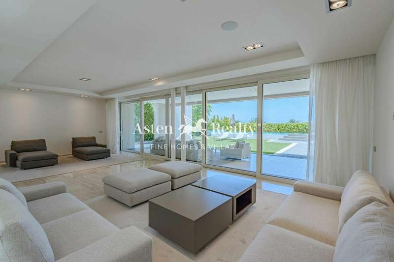 A spacious and bright living room has an open space plan with high ceilings, and there is a plane spring of water with pebbles, which unifies the interior with the exterior, encouraging emotions. The living room through its glass wall introduces a visitor to a formidable terrace with a garden and an infinity pool and the golf course with the ocean in the background. The pool is equipped with a turbine to swim against the current.