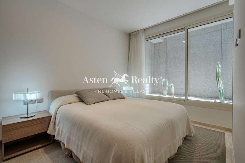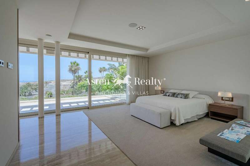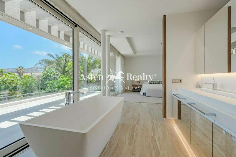 The master bedroom on the first floor is another high-ceilinged marvel, it incorporates an open-plan bathroom, with spectacular views along the glass wall, both from the bed and from the bathtub. The double sink area is hidden behind the wooden partition and in the background are the cabins with the shower and the toilet. An edge of diffused light runs along the surfaces giving it the feeling of pleasant relaxation. The floor-to-ceiling dressing room has double access, from the bathroom or from the bed area. The large bedroom terrace has the afternoon sun and the trees planted around the house provide privacy and freshness. When the sun is lost behind the island of La Gomera, it is a place to be.