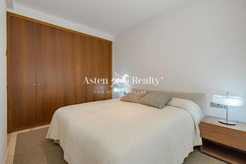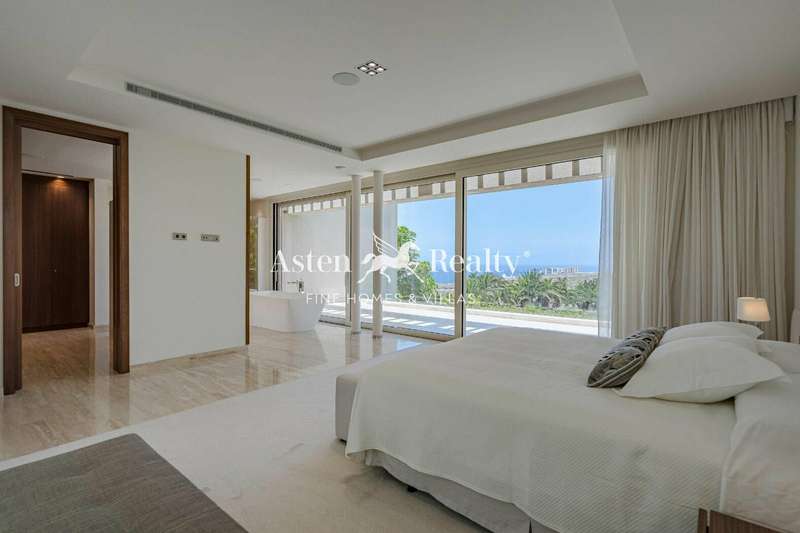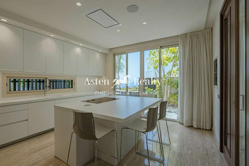 Back inside, all in open plan after the living room, there is a dining room and a nice and spacious kitchen with center island, equipped with all kind of high-end NEFF appliances, in white and stainless steel and a view of the ocean from the working plan.