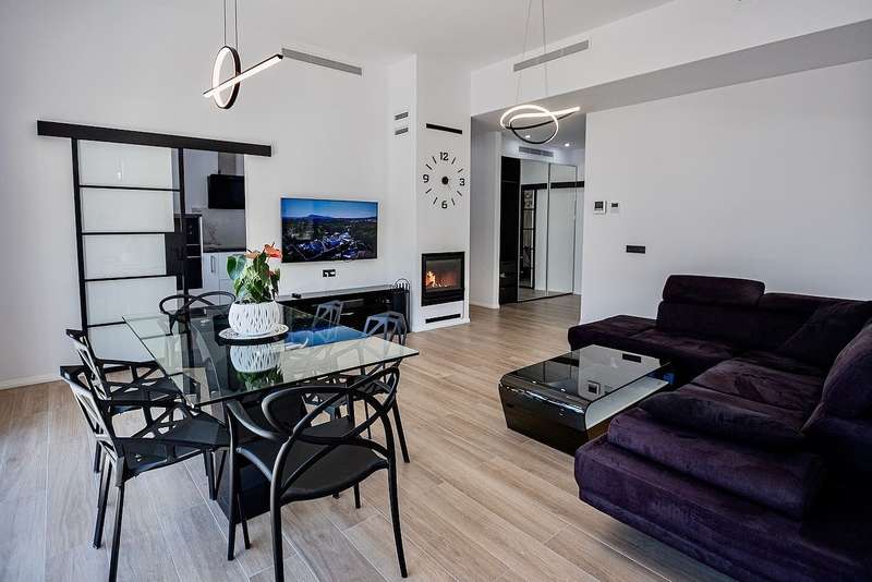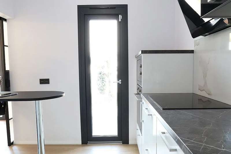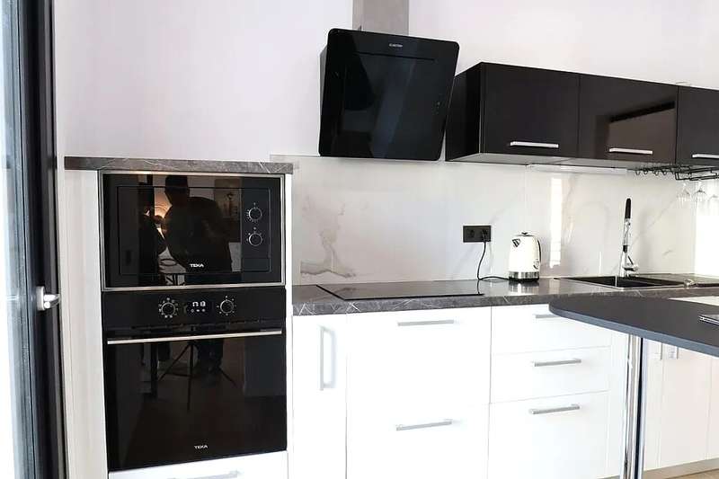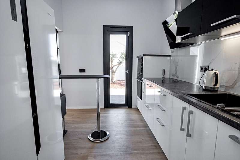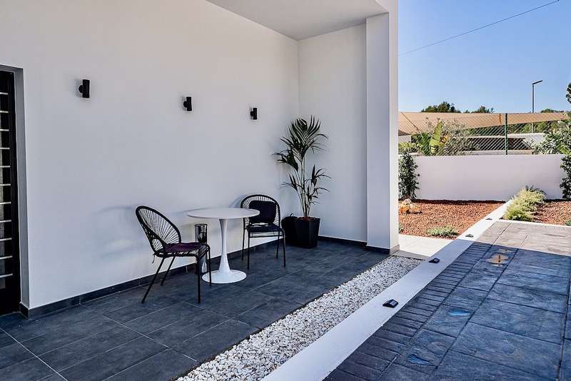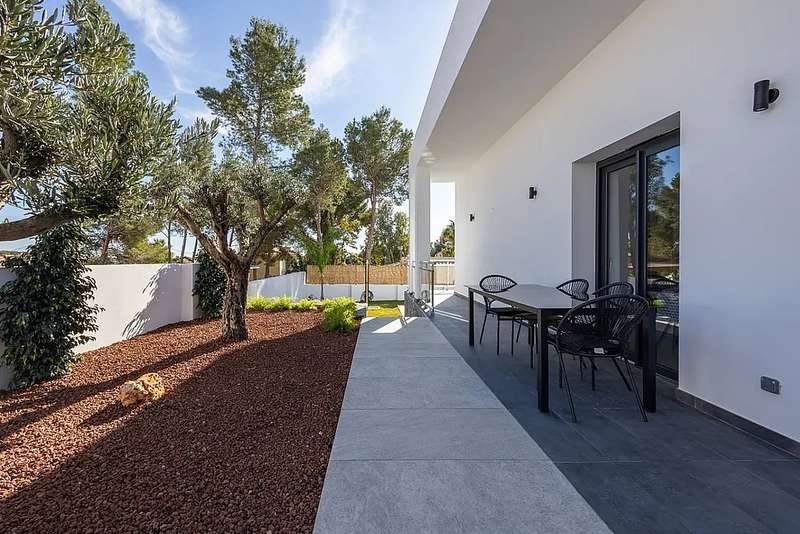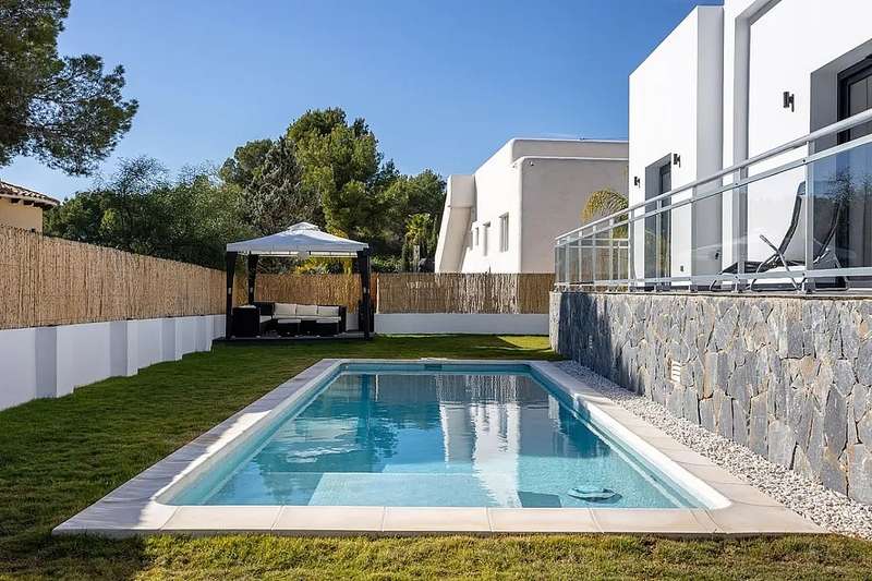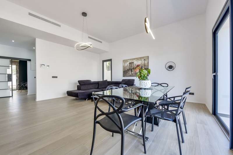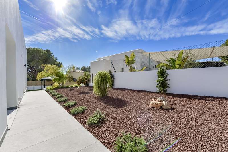 This modern villa for sale in Altea, Spain, with a total built-up area of 226 m², is situated on an 840 m² plot featuring a 27 m² pool, a grass lawn, and an orchard. Designed on a single floor, it offers a seamless living experience with direct access to the pool, terrace, and garden, ensuring comfort without the need for stairs.