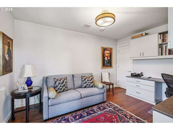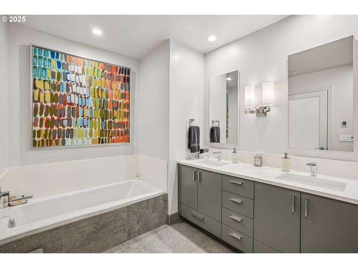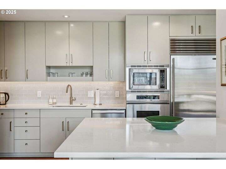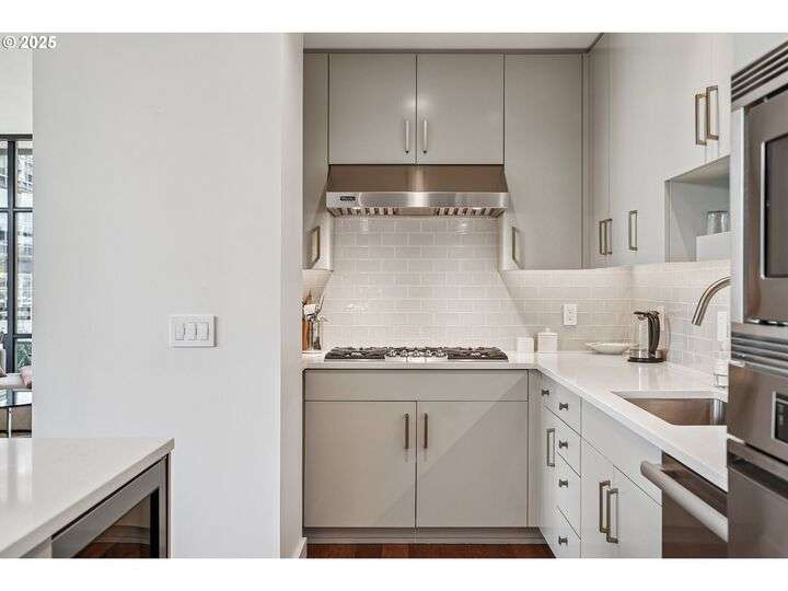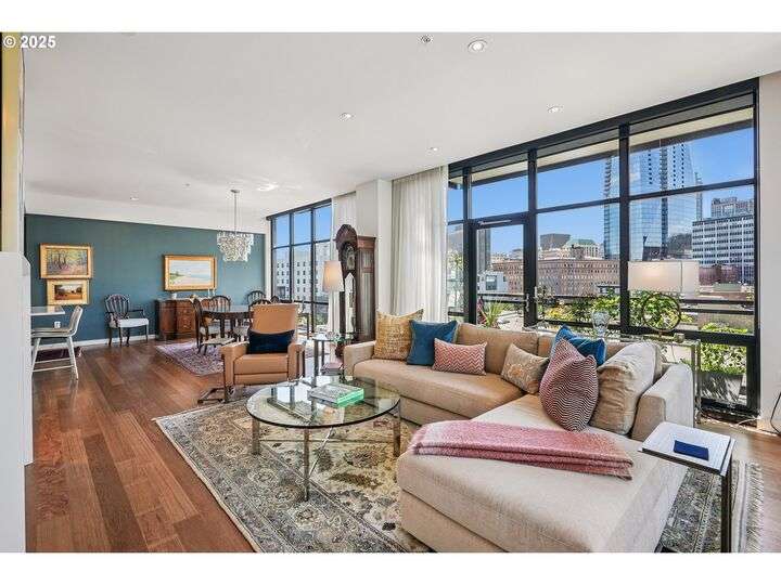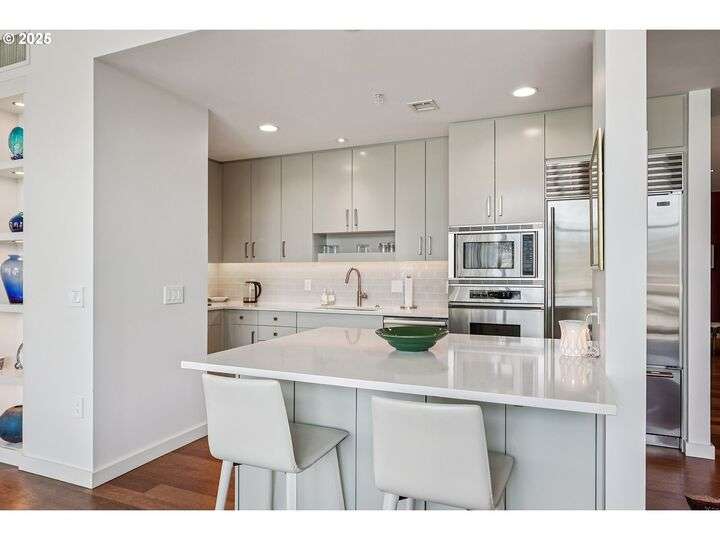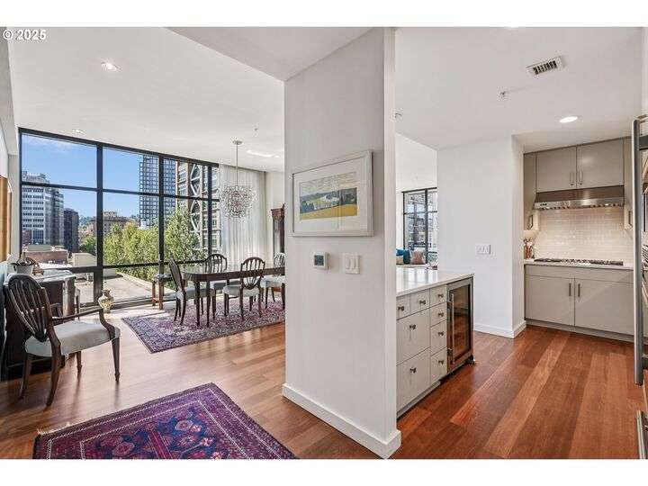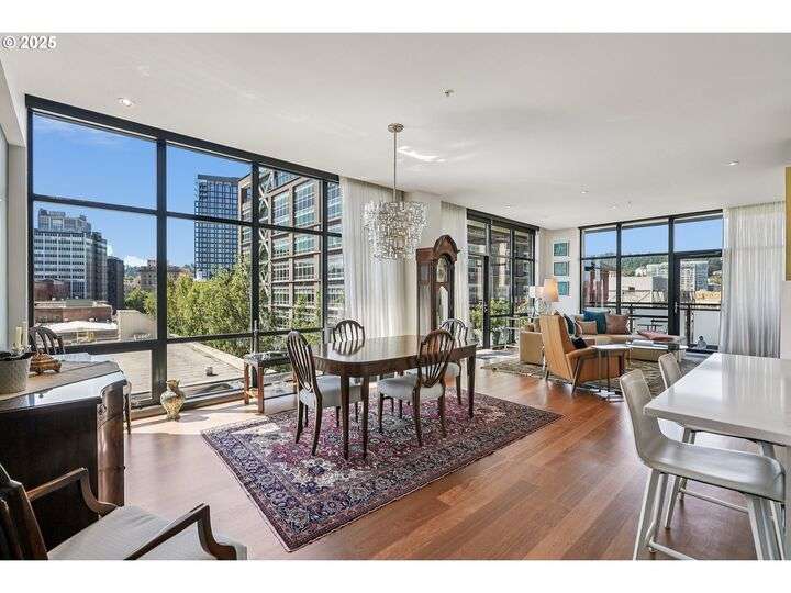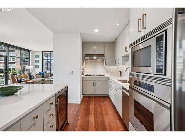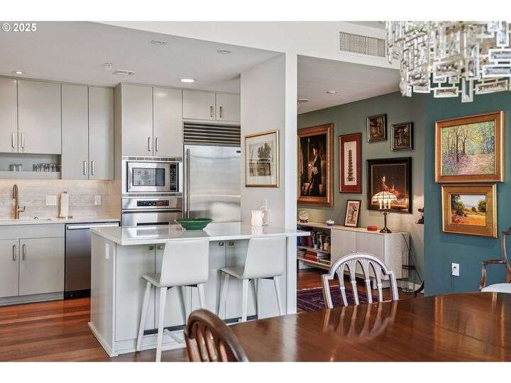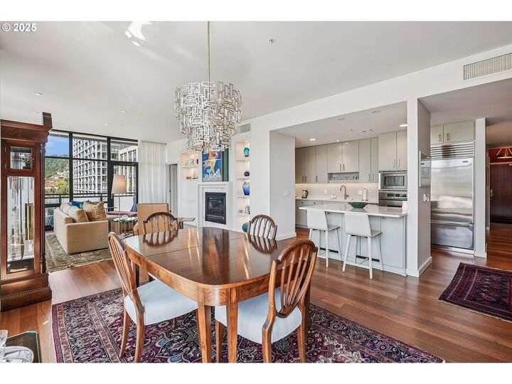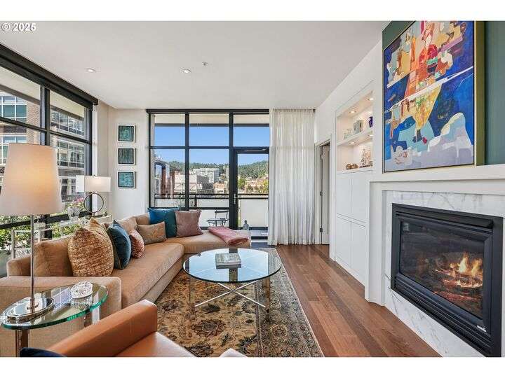 Perched above Portland’s vibrant Pearl District, this 2-bedroom, 2-bath residence frames panoramic southern views of the city skyline and the West Hills—equally stunning by day or night. Thoughtfully updated throughout, the home blends warm hardwoods, freshly painted cabinetry, and curated lighting for a timeless, inviting feel.The kitchen is a showpiece with sleek quartz counters, a Hestan gas cooktop, Subzero refrigerator, and artisan tile backsplash, flowing effortlessly into a light-filled living space anchored by a modern stone fireplace. The primary suite offers a spa-inspired bath with heated floors, frameless glass shower, and double vanity, creating a serene retreat above the bustle below.Set within The Henry, a LEED Gold-certified building with concierge, secure parking, and an unmatched Pearl District location, this home offers the perfect balance of sophistication, comfort, and convenience.