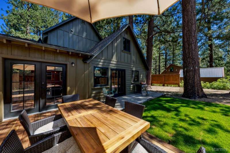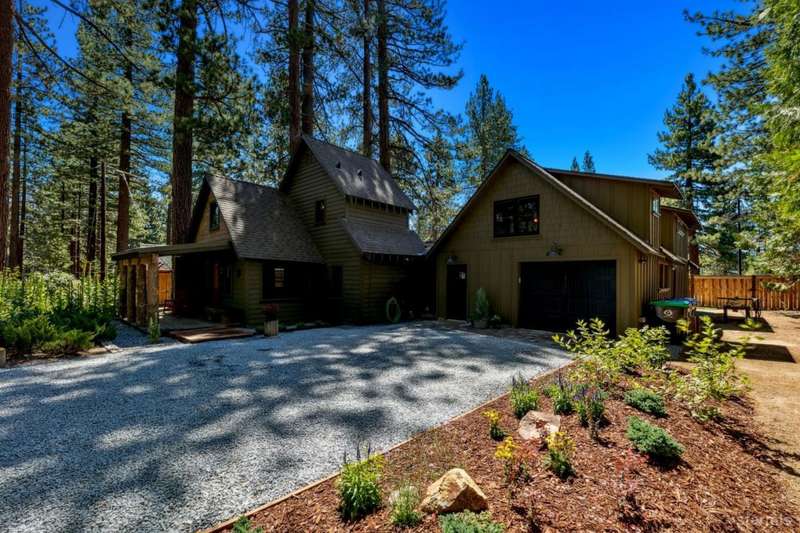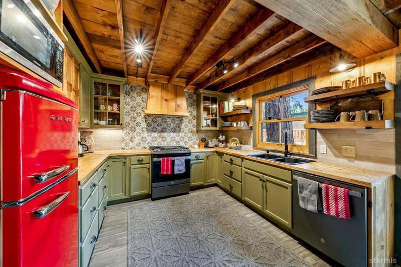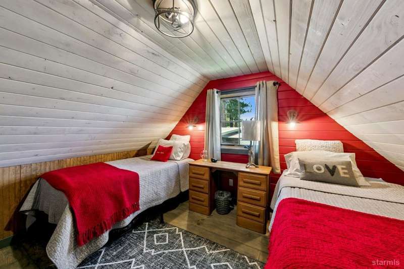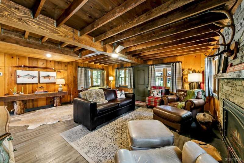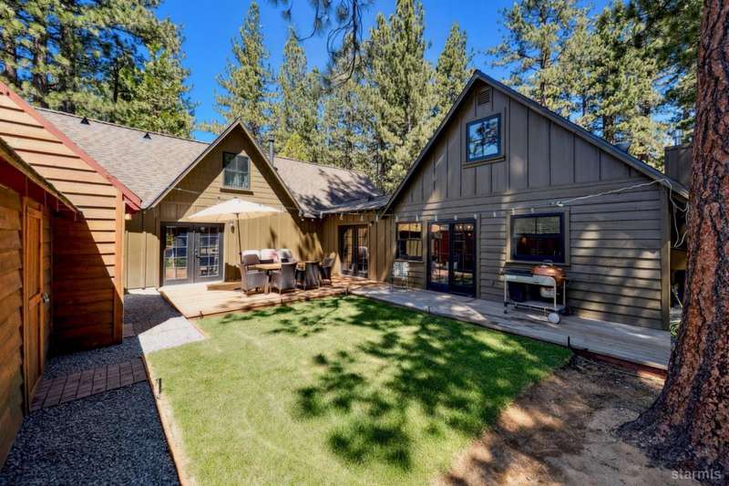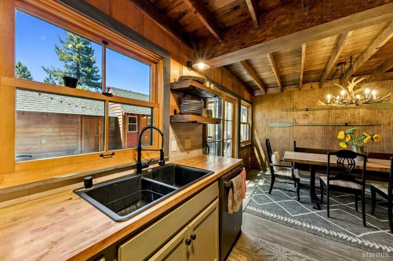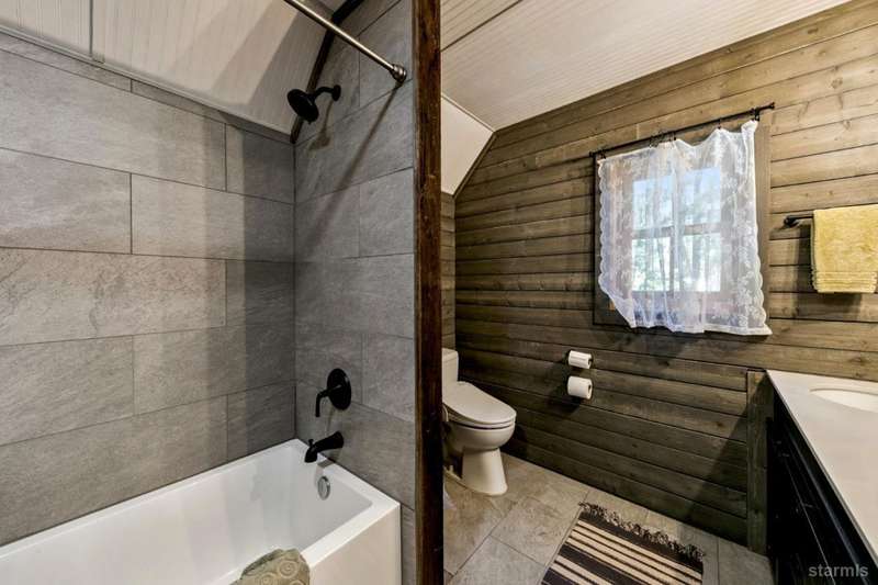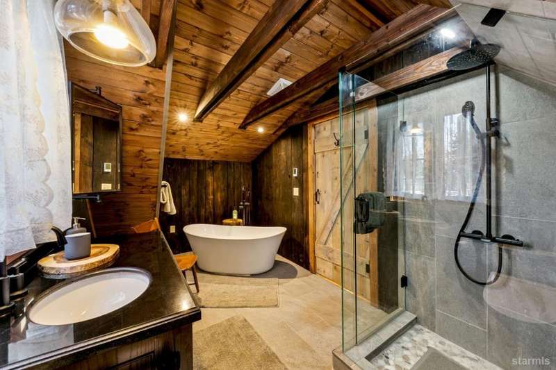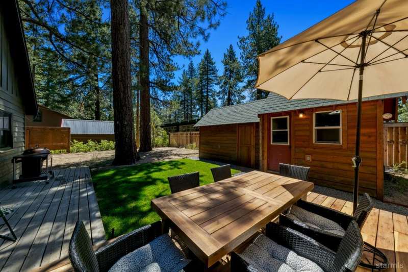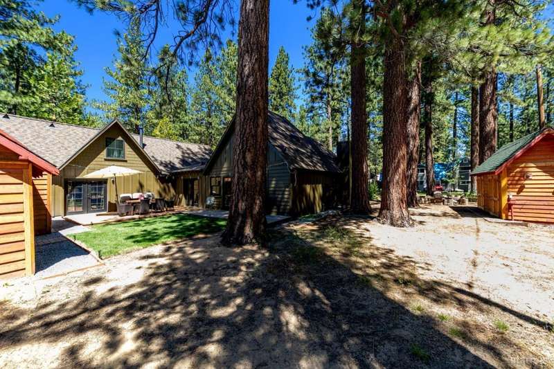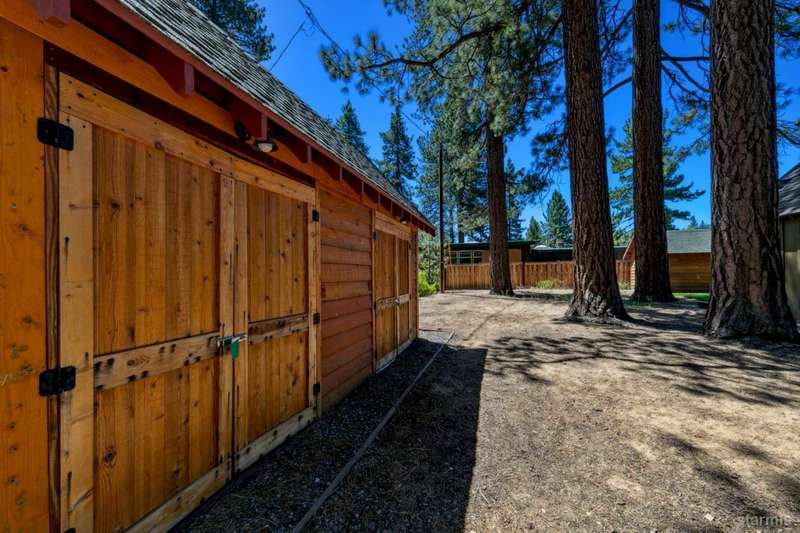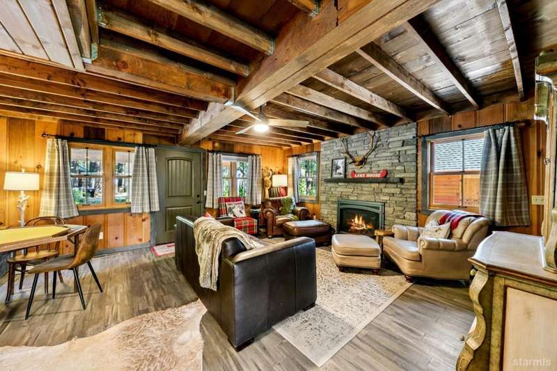 Discover this completely renovated Tahoe cabin nestled in the historic American Legion area of Al Tahoe, where old-world charm meets modern convenience. This 4-bedroom, 3-bathroom home spans 2,346 square feet and showcases top craftsmanship throughout.The spacious living area welcomes you with an open layout featuring stunning exposed beam ceilings, rustic knotty pine paneling, a cozy gas fireplace, and durable laminate hickory flooring. The beautifully appointed kitchen is complete with custom cabinets, butcherblock countertops, decorative tile backsplash, stainless steel gas range, dishwasher, and built-in microwave.The main level includes a comfortable bedroom and full bathroom with custom live edge slab countertop, stone vessel sink, and custom tile shower. Upstairs, three additional bedrooms await, including the luxurious primary suite and versatile loft office area.The primary bedroom creates a serene retreat with its freestanding gas fireplace, open beam ceilings, and rich wide plank hardwood flooring. The primary bathroom impresses with a custom stall shower, elegant freestanding tub, and heated tile flooring.Set on a generous sunny lot, the property features an inviting deck overlooking a lawn complete with sprinkler system, plus a charming covered front porch. The attached 2-car garage and four outbuildings provide abundant storage options for all your needs.This exceptional property offers convenient access to El Dorado Beach, the boat launch, and local dining establishments, making it perfect for year-round living or a mountain getaway retreat. This turnkey property features a stylish and comfortable furnishings. Many custom-designed pieces add a unique touch of style and personality to the space. The home is move in ready, equipped with everything you need for immediate occupancy - from stylish dcor and functional appliances to practical essentials. Perfect for those seeking a hassle-free, beautifully curated living and recreation environment.