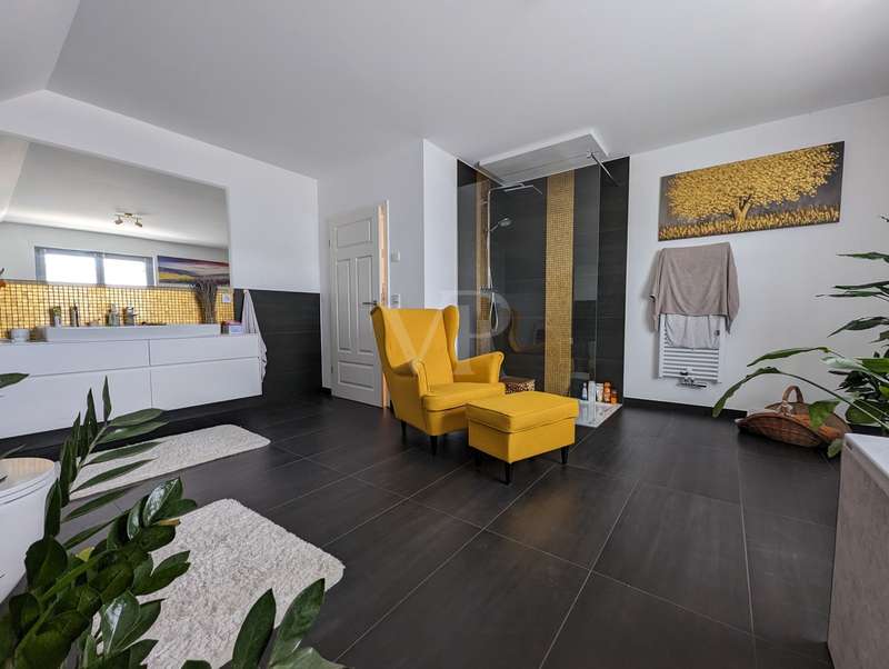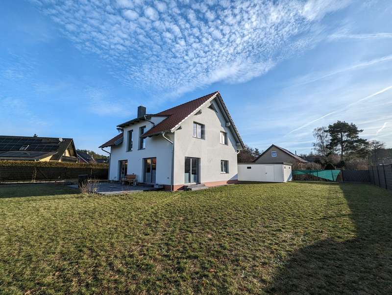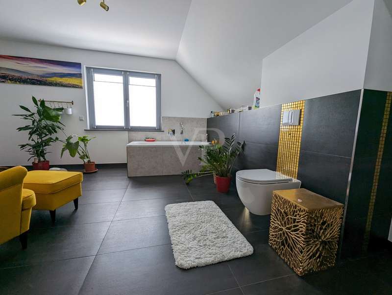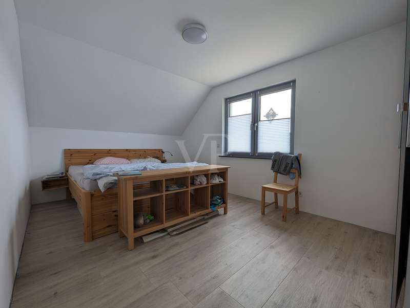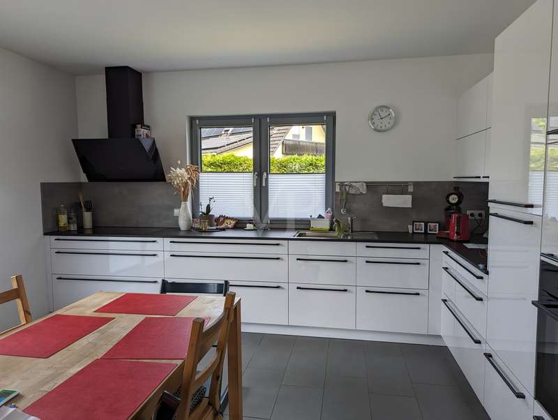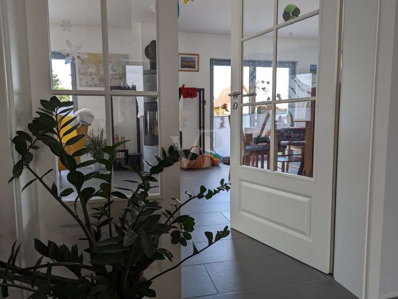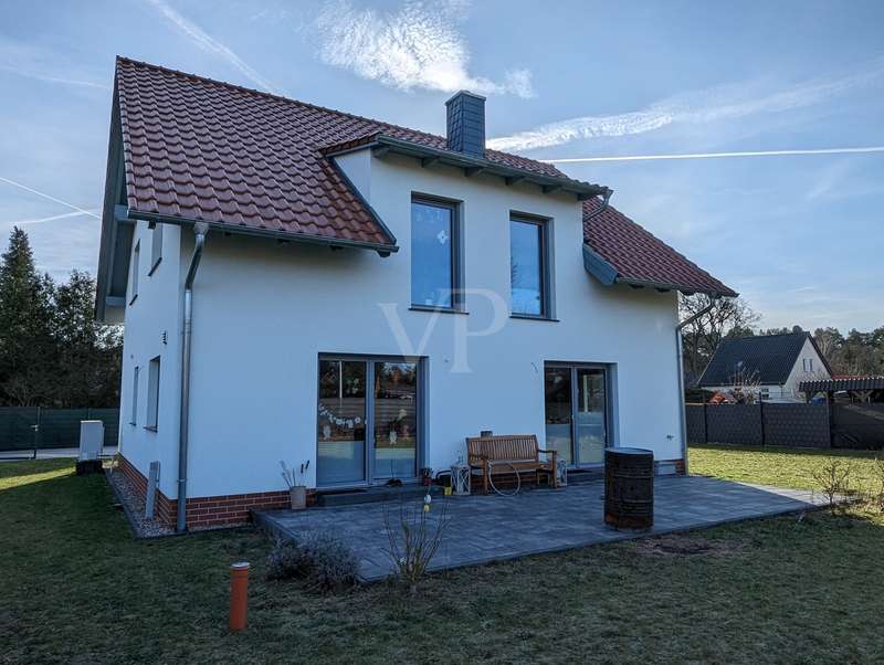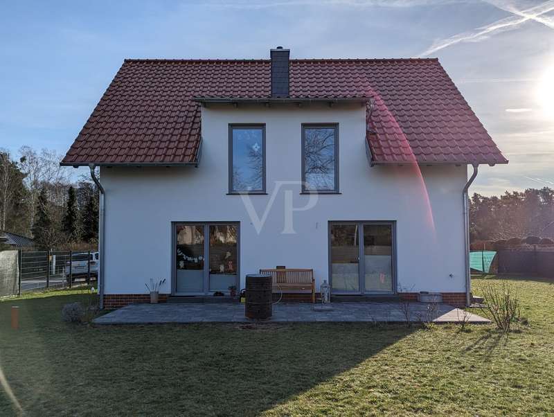 The headline for this great house with a large plot could also be OUT of the big city and INTO the brand new house. The detached house for sale here - built in high-quality solid construction and with a living space of approx. 156 square meters - was only completed in 2023 and can therefore be described as a genuine new build. Ideal for a family looking for and needing a spacious and comfortable home. But a couple with high standards will also have made the right choice with this property. The house meets all the criteria for modern and contemporary living. Be it the practical and well thought-out layout of the individual living areas, or the energy standards in which the property sets benchmarks. These are particularly noteworthy, as the A+ energy class alone means that the monthly operating costs of the house are negligible when it comes to calculations or financial planning. In addition to the air/heat pump, which supplies the house with heating and hot water, the house also has a solar system (photovoltaic = electricity) and its own electricity storage unit, which provides you with a self-sufficient supply of electrical energy in the event of a power cut! Another special feature of this house is the large bathroom on the upper floor, which is not really a bathroom but a wellness area for you. A large bathtub with whirlpool function, a separate huge and elegant shower and still enough space to move comfortably around the room without feeling cramped. The same applies to the living and dining area on the first floor of the house. Everything here is designed to be pragmatic, open and friendly and flooded with natural light. The elegant kitchen furniture and high-quality electrical appliances complete the great and cozy ambience. Both the kitchen and the living room have access to the west-facing terrace via the large floor-to-ceiling (triple-glazed) windows. The adjoining large garden will then become YOUR project! Nothing is predetermined here and everything is open to your creativity ;) This property also includes a double garage and two outdoor parking spaces for the secure parking of vehicles on the property.