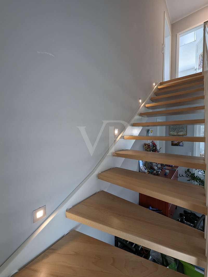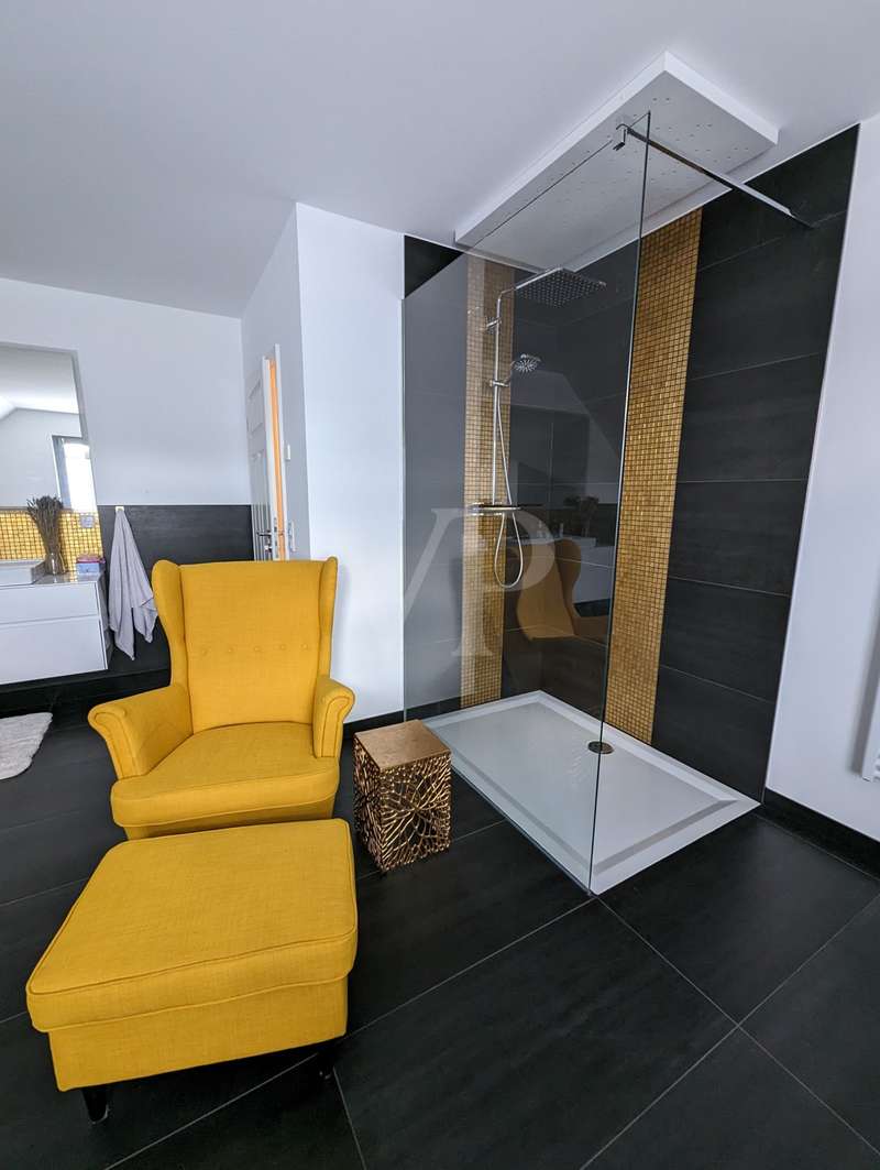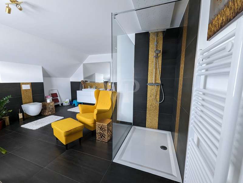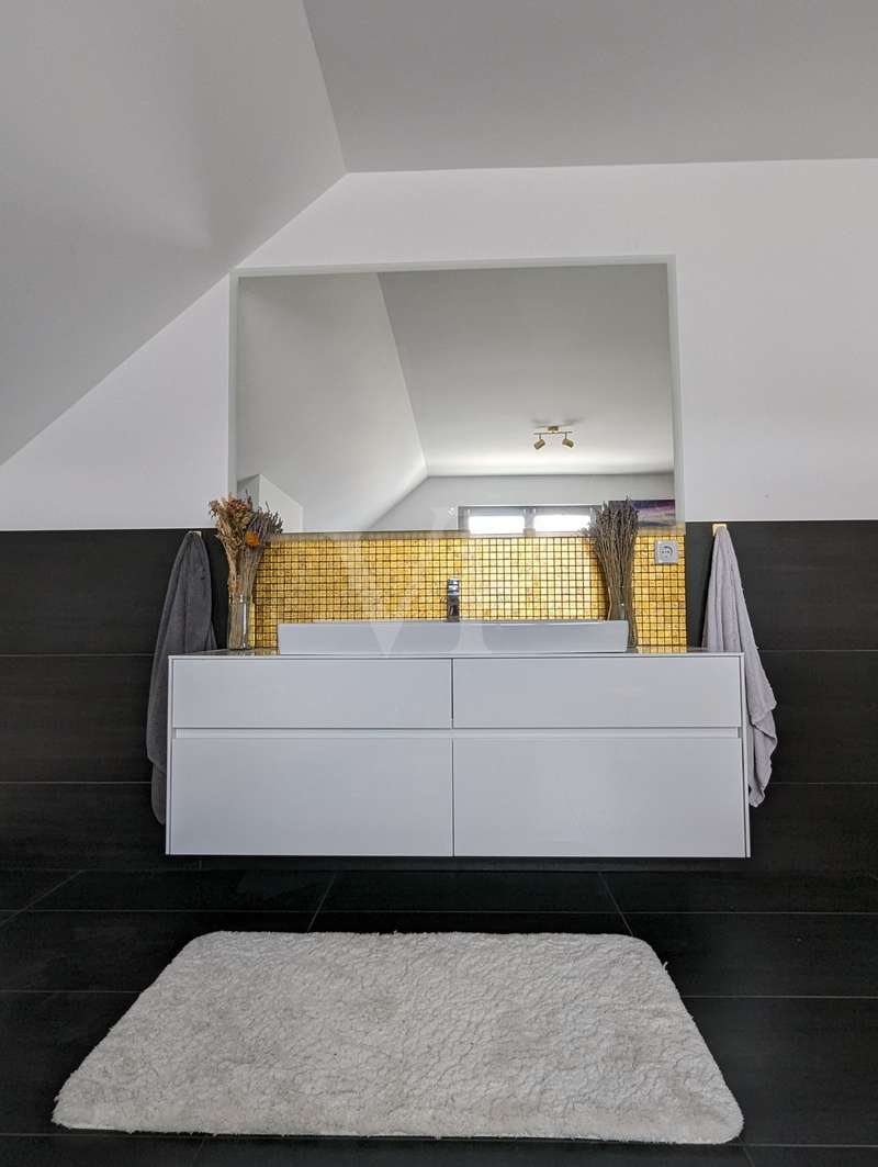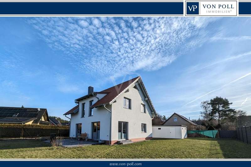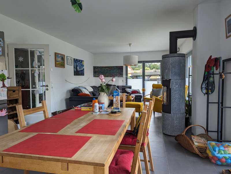 The headline for this great house with a large plot could also be OUT of the big city and INTO the brand new house. The detached house for sale here - built in high-quality solid construction and with a living space of approx. 156 square meters - was only completed in 2023 and can therefore be described as a genuine new build. Ideal for a family looking for and needing a spacious and comfortable home. But a couple with high standards will also have made the right choice with this property. The house meets all the criteria for modern and contemporary living. Be it the practical and well thought-out layout of the individual living areas, or the energy standards in which the property sets benchmarks. These are particularly noteworthy, as the A+ energy class alone means that the monthly operating costs of the house are negligible when it comes to calculations or financial planning. In addition to the air/heat pump, which supplies the house with heating and hot water, the house also has a solar system (photovoltaic = electricity) and its own electricity storage unit, which provides you with a self-sufficient supply of electrical energy in the event of a power cut! Another special feature of this house is the large bathroom on the upper floor, which is not really a bathroom but a wellness area for you. A large bathtub with whirlpool function, a separate huge and elegant shower and still enough space to move comfortably around the room without feeling cramped. The same applies to the living and dining area on the first floor of the house. Everything here is designed to be pragmatic, open and friendly and flooded with natural light. The elegant kitchen furniture and high-quality electrical appliances complete the great and cozy ambience. Both the kitchen and the living room have access to the west-facing terrace via the large floor-to-ceiling (triple-glazed) windows. The adjoining large garden will then become YOUR project! Nothing is predetermined here and everything is open to your creativity ;) This property also includes a double garage and two outdoor parking spaces for the secure parking of vehicles on the property.