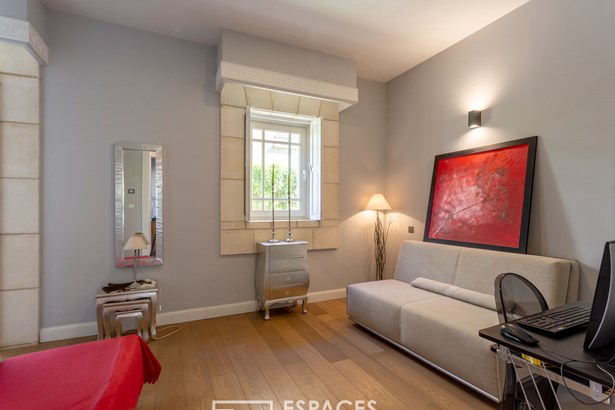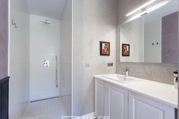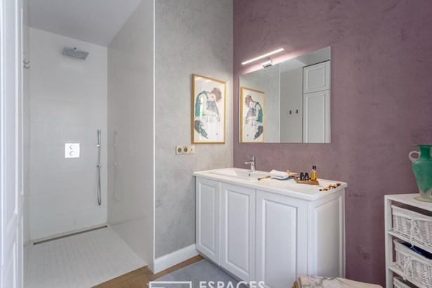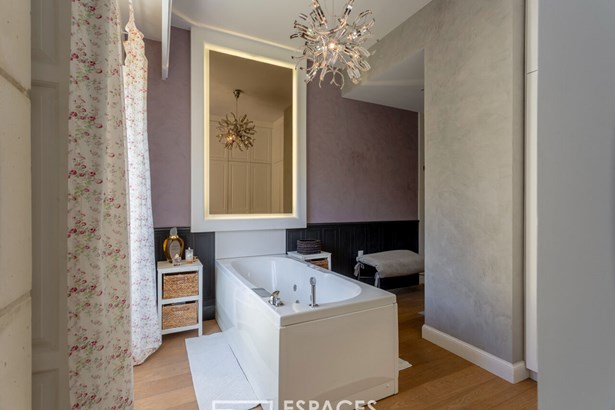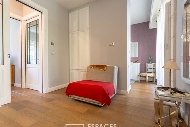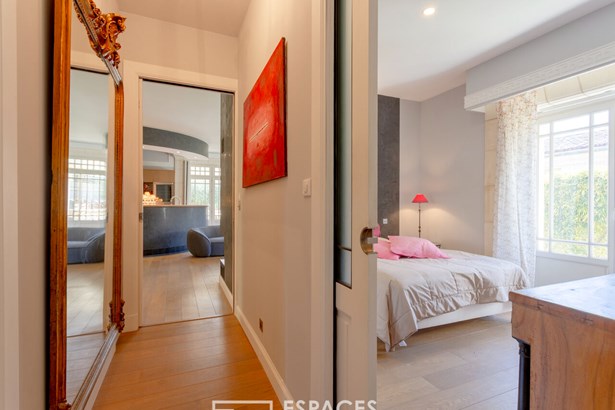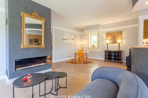 Upon entering, the 50 sqm living room impresses with its generous volumes and high ceilings. The fully equipped open-plan kitchen blends harmoniously into the space, ideal for convivial moments. A clever utility room completes this functional space.