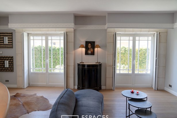 Large openings let in natural light throughout the day, enhancing the noble materials and refined finishes.