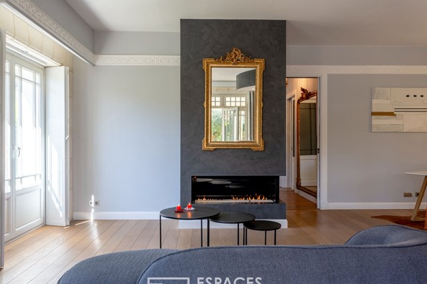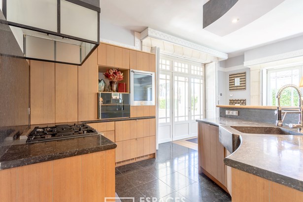The vast covered terrace of 46m2, furnished with a summer kitchen, invites you to relax in front of the green garden of 300 sqm.