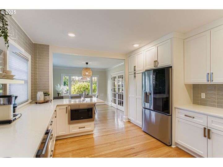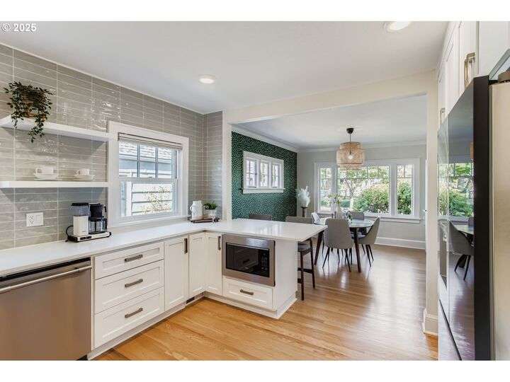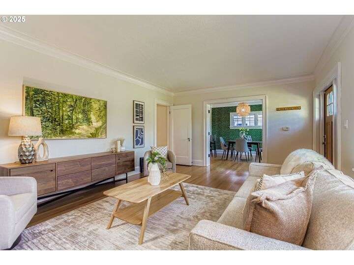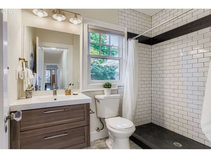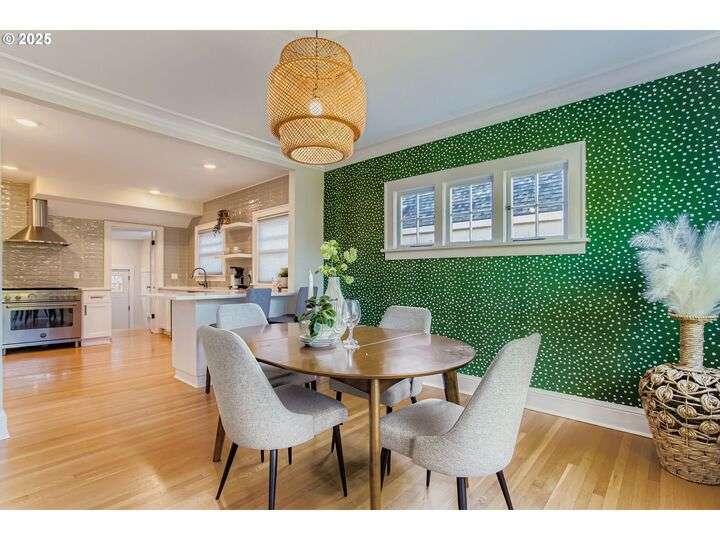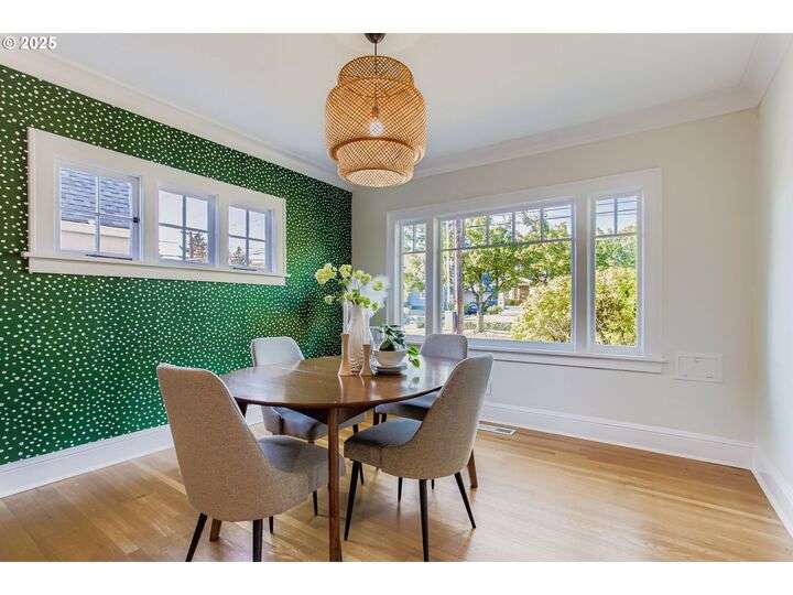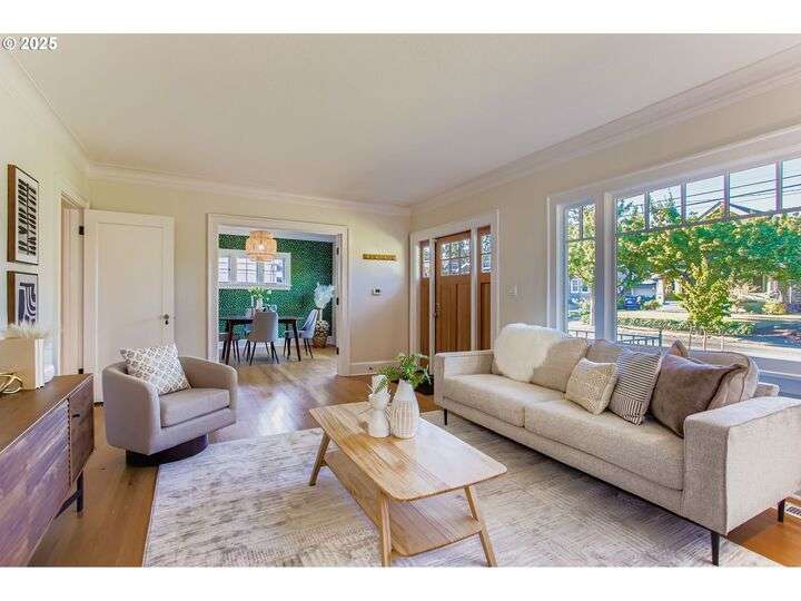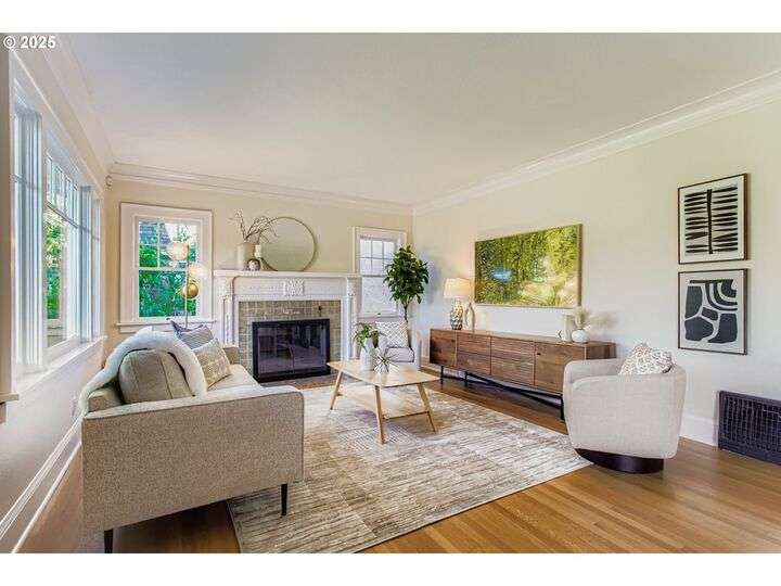 Sophisticated Alameda Bungalow seamlessly blends timeless charm with thoughtful modern upgrades in one of Portland’s premier neighborhoods. Original details—coved ceilings, French doors, and gleaming hardwood floors—set the stage for light-filled living spaces. The spacious living room with fireplace flows easily into a chef’s kitchen featuring quartz countertops, a striking tile backsplash, top-of-the-line appliances, and a generous eat-in bar. A dining room with lively wallpaper adds personality and elegance.Two main floor bedrooms with hardwoods share an updated full bath with a tiled shower. Upstairs, the stunning primary suite feels like a private retreat with new wool carpet, two separate walk-in closets, and a spa-inspired bath with soaking tub, tiled walls, and separate shower. A dedicated mini-split system ensures year-round comfort. The lower level expands your options with a generous family room, half bath, and an additional bedroom, perfect for guests, hobbies, or a work-from-home office.Sellers love the peaceful backyard anchored by a graceful Japanese maple, which turns red in the fall and provides refreshing shade in the summer. This manicured backyard garden has a new fence and gate that frame this private space. The long driveway and detached garage offer convenience. Practical upgrades offer peace of mind: new mini-split systems in the upstairs suite (2022) and second bedroom (2024), electrical panel expansion (2024), radon system, new exterior paint (2025), and sewer replacement (2018). A major remodel was completed in 2019. Newer high-quality double-pane windows and doors. The location is unbeatable—just a short stroll to Wilshire and Grant Parks, and close to Beaumont Village with Grand Central Bakery, Prince Coffee, taverns, and more. Best of all, you’re only minutes from neighborhood favorites like Tacovore and Beaux Berry, the perfect spot for tacos, ice cream, and community connection. [Home Energy Score = 2. HES Report at https://rpt.greenbuildingregistry.com/hes/OR10034172]