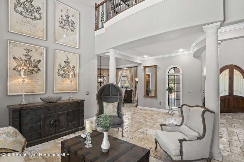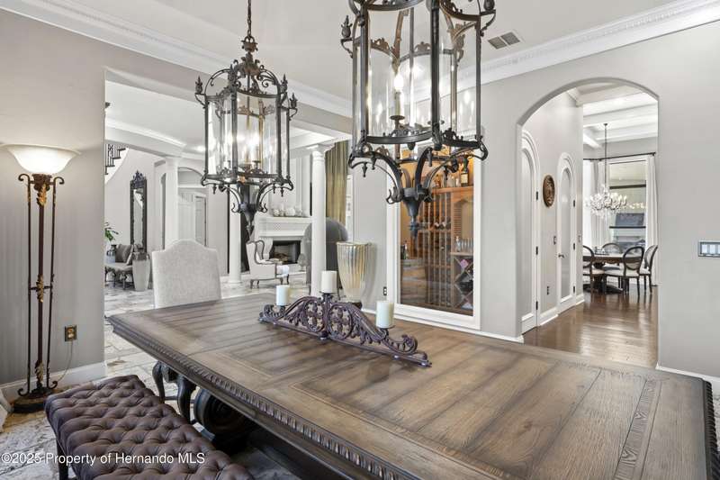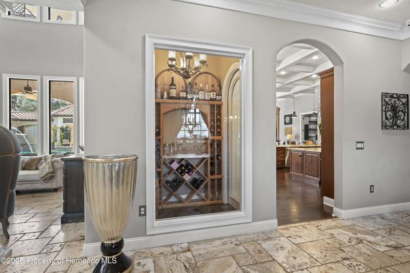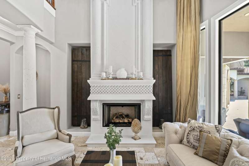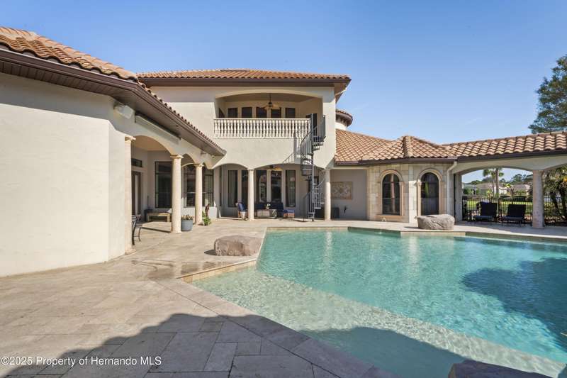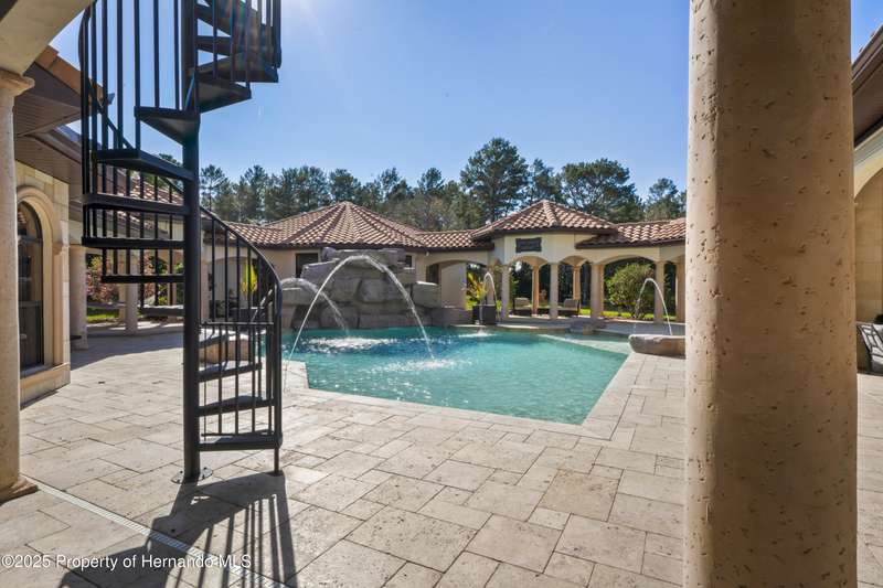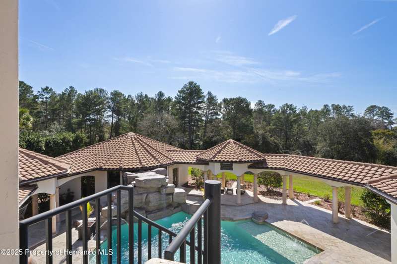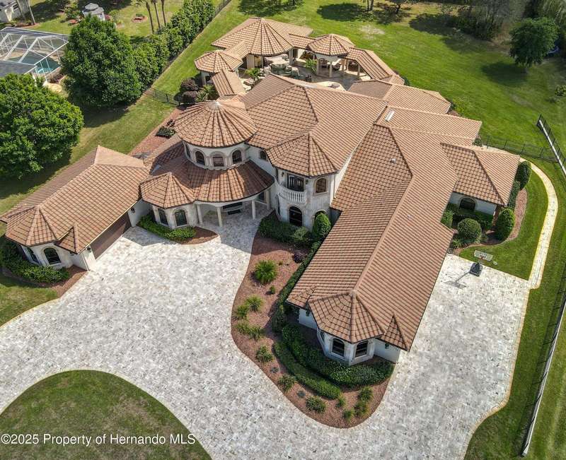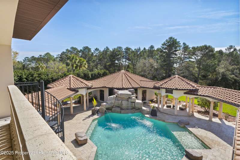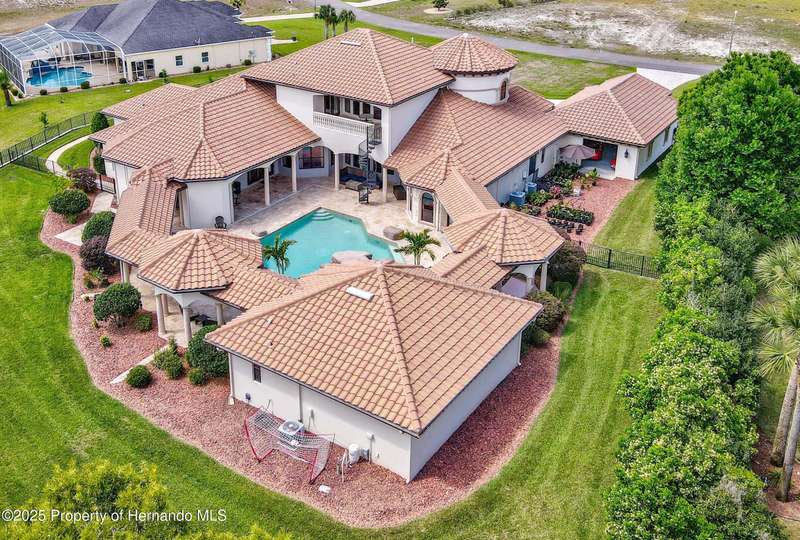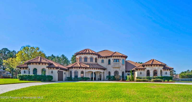 This Mediterranean inspired, resort-themed home sits on a quiet street in Woodland Waters, an exclusive subdivision of estate sized parcels. With over one acre of manicured grounds this property is the ultimate residence if you are looking for perfection and privacy. The architect, builder and designer created a residence that blends natural light, soaring ceilings with exquisite architectural details in a manner that is grand in stature but at the same time, warm and inviting. The residence encompasses 6266 sf. of heated/AC space with 4000+ of outdoor entertainment space. The interior is bespoke with an array of cabinetry, top-grade sourced granite, imported marbles and tile, fine hardwoods and plastering. The Property includes a pool house/guest house with high ceilings, a full bath and kitchenette. Architectural details in the main residence feature soaring ceilings, hand scraped wood floors, a chef's kitchen with 6 burner gas stove and a 72'' refrigerator/freezer, walk in wine room, attached pantry and exquisite lighting. In the living room, both the windows and fireplace rise from the floor to the ceiling and are overlooked by a sitting room from the second story. There are four en suite bedrooms on the main floor, three connected with a gathering/office/work study area. Dine in either the striking dining room, the breakfast alcove or seated bar area. Numerous doors lead to the outdoor pavilion/pool area including from the family room, two from the primary bedroom and one from an additional bedroom bath. The upstairs sitting area leads to a Media/Rec room (or other creative use) with high beamed ceilings and a full bath, Juliet balcony, with covered outside patio area and spiral staircase. The backyard pavilion includes a resort-like heated pool with nighttime lighting, several fountains and waterfalls. Adjacent and under roof is an outdoor kitchen, dining space and fireplace with TV. The connecting guest suite encompasses 700+ sf and has a kitchenette, full bath and Clive Christian cabinetry. The suite can be used for entertaining as well as sleeping. Each of two oversized garages can hold 3 cars on PVC commercial grade flooring (6+ vehicles total) with one garage having a rear entrance. The backyard of the property is totally fenced and landscaped for privacy. A 12 zone irrigation system utilizes well water covering lawn/gardens. Special in wall insulation,4 zone HVAC, central vacuum, landscape lighting and many recent utility and appliance upgrades. Home also features UV water filters and double tankless water heaters. Sitting high on a rolling hill and safely inland (low insurance and no flood requirement) this home is less than 10 mi. to Weeki Wachee Spring State Park, Pine Island and Hernando Beach. Tampa International Airport is only 51 minutes away and every shopping convenience is nearby. If you enjoy living in quiet privacy, security and beautiful surroundings this home is for you. The residence defines perfection. Walk around the low-maintenance yard and lava rock gardens, then take a nap in the hammock... before swimming in the large heated pool in total privacy with no neighbors' residences in sight...then change (or put on clothes) in the guest/pool house (using the second washer/dryer for towels) before returning to the main residence to relax in what may be the most Exquisite Living Experience in all of Hernando County. Showings with 12-24 hour notice to qualified buyers only. Call to schedule.