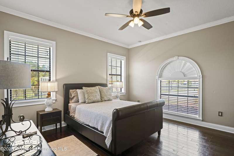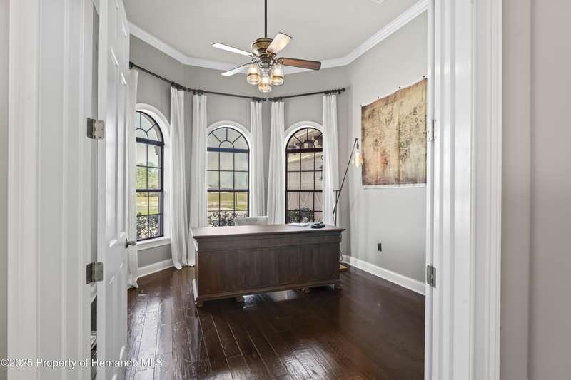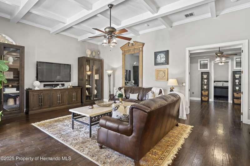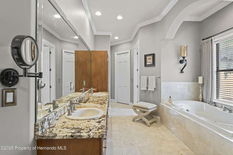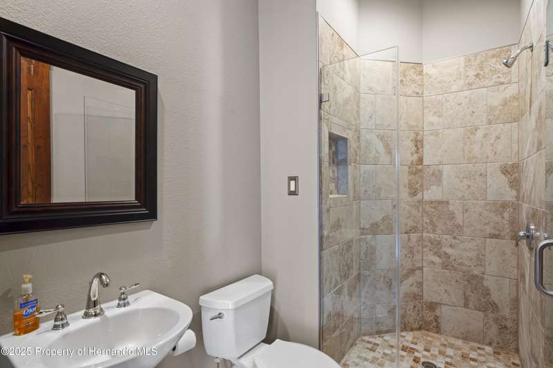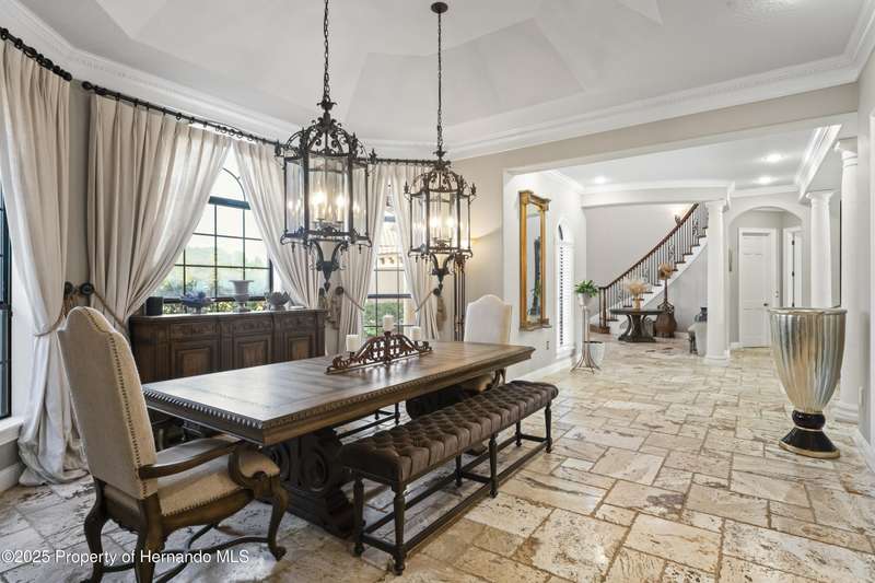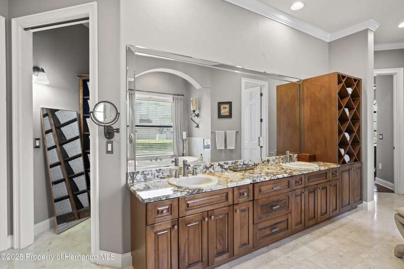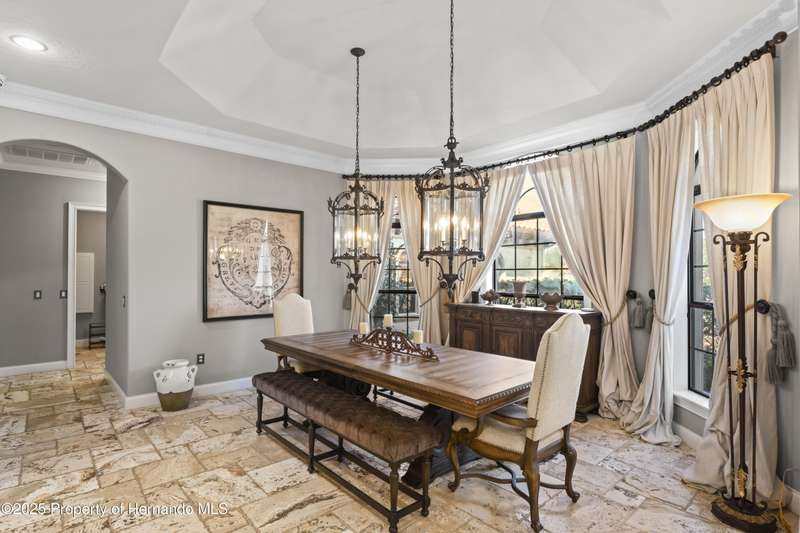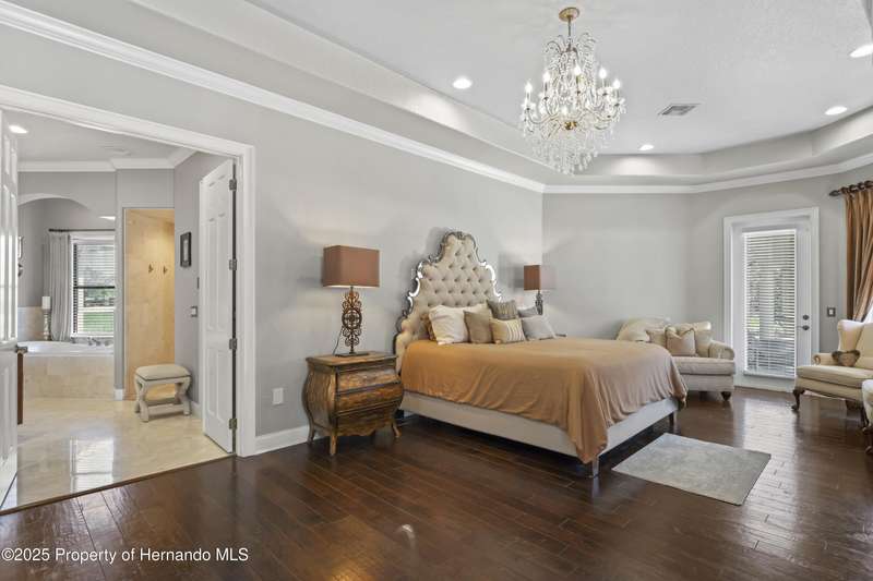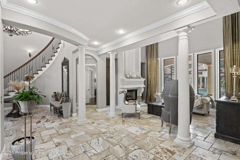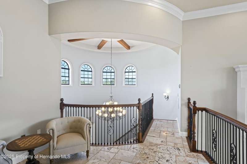 This Mediterranean inspired, resort-themed home sits on a quiet street in Woodland Waters, an exclusive subdivision of estate sized parcels. With over one acre of manicured grounds this property is the ultimate residence if you are looking for perfection and privacy. The architect, builder and designer created a residence that blends natural light, soaring ceilings with exquisite architectural details in a manner that is grand in stature but at the same time, warm and inviting. The residence encompasses 6266 sf. of heated/AC space with 4000+ of outdoor entertainment space. The interior is bespoke with an array of cabinetry, top-grade sourced granite, imported marbles and tile, fine hardwoods and plastering. The Property includes a pool house/guest house with high ceilings, a full bath and kitchenette. Architectural details in the main residence feature soaring ceilings, hand scraped wood floors, a chef's kitchen with 6 burner gas stove and a 72'' refrigerator/freezer, walk in wine room, attached pantry and exquisite lighting. In the living room, both the windows and fireplace rise from the floor to the ceiling and are overlooked by a sitting room from the second story. There are four en suite bedrooms on the main floor, three connected with a gathering/office/work study area. Dine in either the striking dining room, the breakfast alcove or seated bar area. Numerous doors lead to the outdoor pavilion/pool area including from the family room, two from the primary bedroom and one from an additional bedroom bath. The upstairs sitting area leads to a Media/Rec room (or other creative use) with high beamed ceilings and a full bath, Juliet balcony, with covered outside patio area and spiral staircase. The backyard pavilion includes a resort-like heated pool with nighttime lighting, several fountains and waterfalls. Adjacent and under roof is an outdoor kitchen, dining space and fireplace with TV. The connecting guest suite encompasses 700+ sf and has a kitchenette, full bath and Clive Christian cabinetry. The suite can be used for entertaining as well as sleeping. Each of two oversized garages can hold 3 cars on PVC commercial grade flooring (6+ vehicles total) with one garage having a rear entrance. The backyard of the property is totally fenced and landscaped for privacy. A 12 zone irrigation system utilizes well water covering lawn/gardens. Special in wall insulation,4 zone HVAC, central vacuum, landscape lighting and many recent utility and appliance upgrades. Home also features UV water filters and double tankless water heaters. Sitting high on a rolling hill and safely inland (low insurance and no flood requirement) this home is less than 10 mi. to Weeki Wachee Spring State Park, Pine Island and Hernando Beach. Tampa International Airport is only 51 minutes away and every shopping convenience is nearby. If you enjoy living in quiet privacy, security and beautiful surroundings this home is for you. The residence defines perfection. Walk around the low-maintenance yard and lava rock gardens, then take a nap in the hammock... before swimming in the large heated pool in total privacy with no neighbors' residences in sight...then change (or put on clothes) in the guest/pool house (using the second washer/dryer for towels) before returning to the main residence to relax in what may be the most Exquisite Living Experience in all of Hernando County. Showings with 12-24 hour notice to qualified buyers only. Call to schedule.