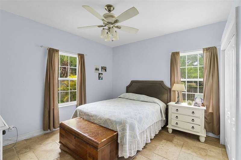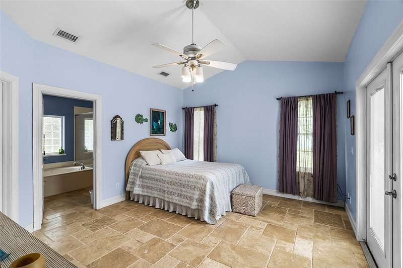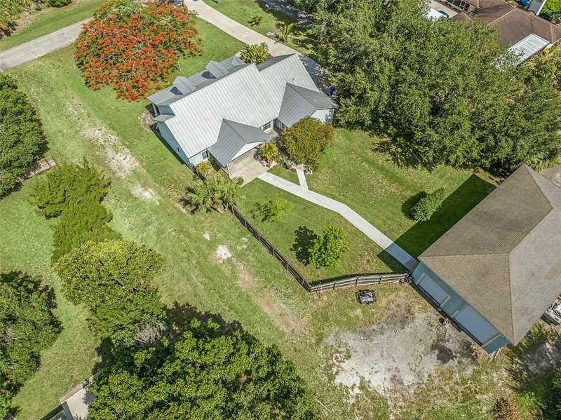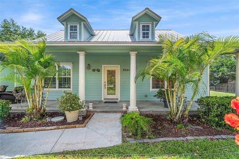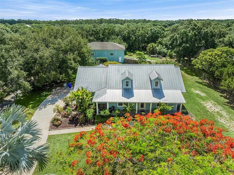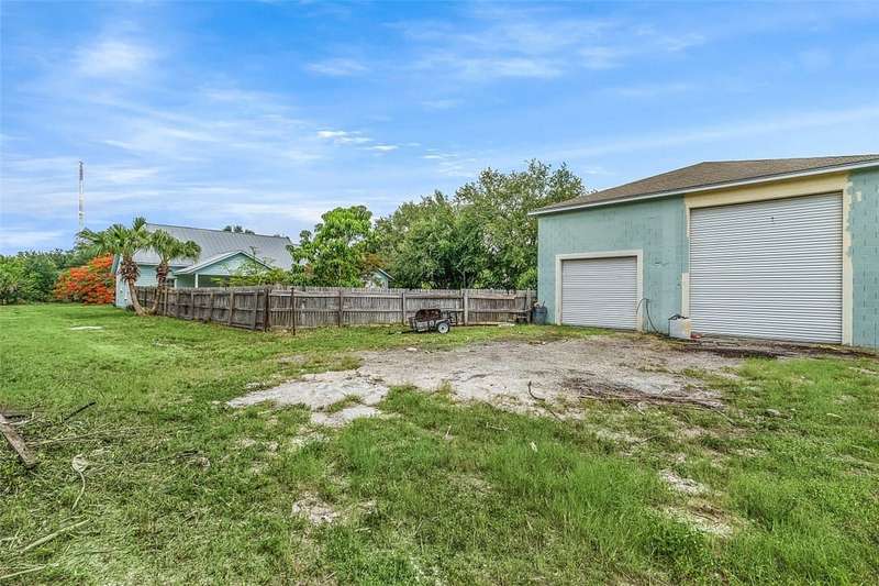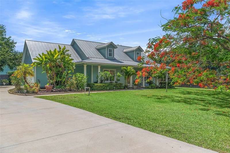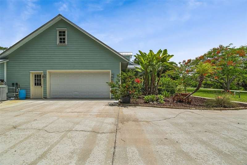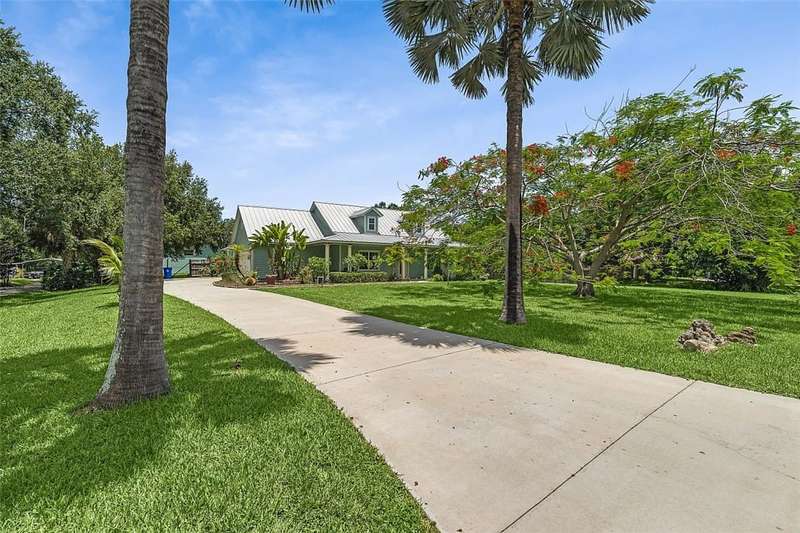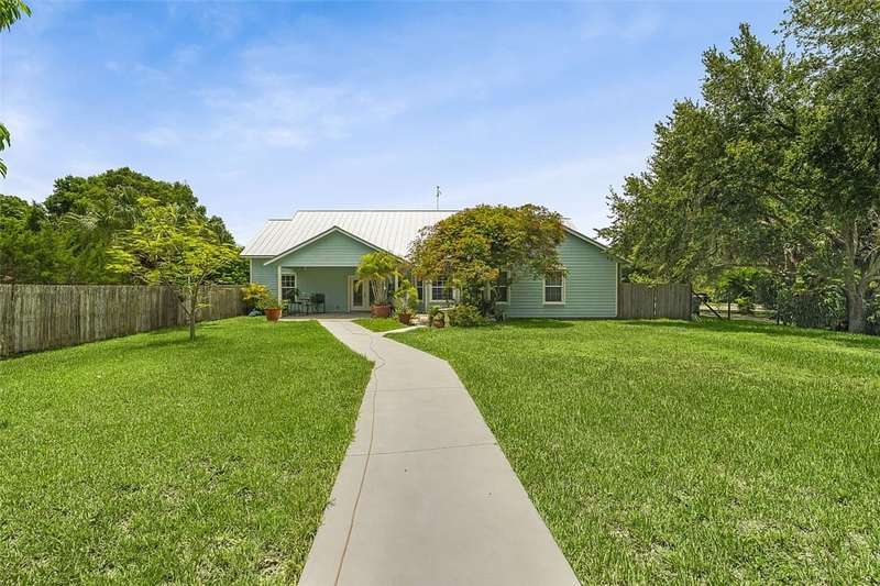 Tucked on nearly an acre in Vero Beach, this CBS home with Hardi-plank siding features an open layout with travertine floors, granite counters, tray/vaulted ceilings, and a spacious upstairs loft. Enjoy the covered front porch or back patio surrounded by lush landscaping. The primary suite boasts a custom closet, en-suite bath, and double doors to the yard. Metal roof, 2-car garage, and a 2,040 sqft bonus workshop with 16-ft ceilings. Zoned A-1. Room sizes are approximate and subject to error.