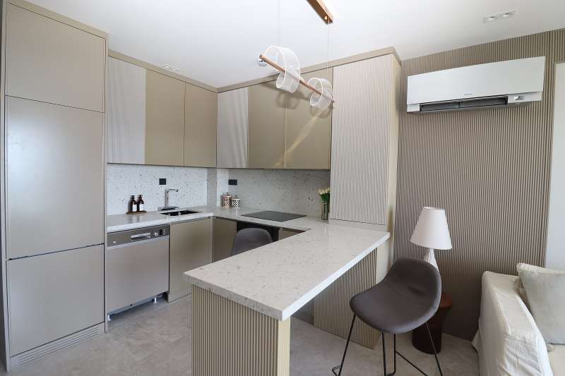 The one- and two-bedroom apartments feature a living room, an open-plan kitchen, a shared bathroom, an en-suite bathroom, a balcony, and a dressing room. The apartments feature high-quality materials and are equipped with high-end appliances.