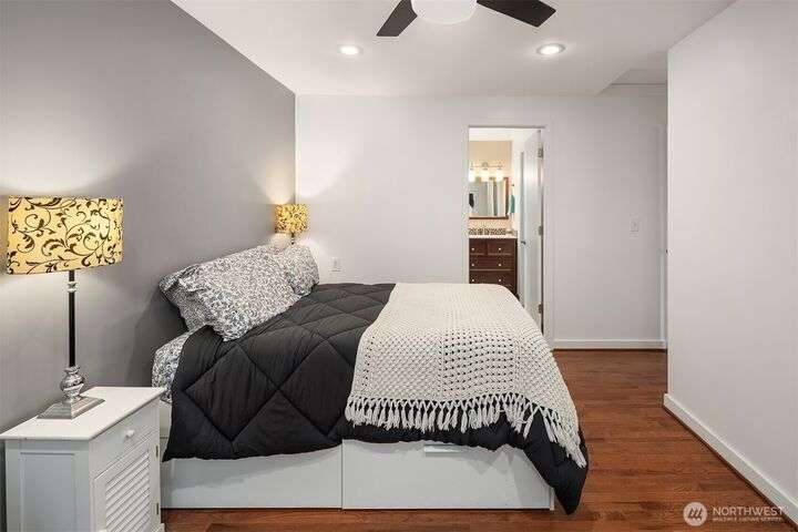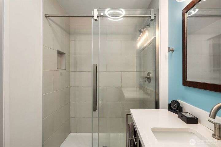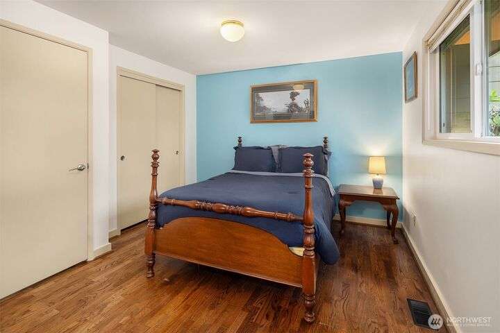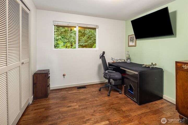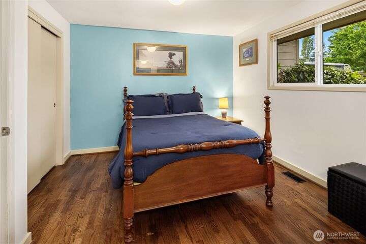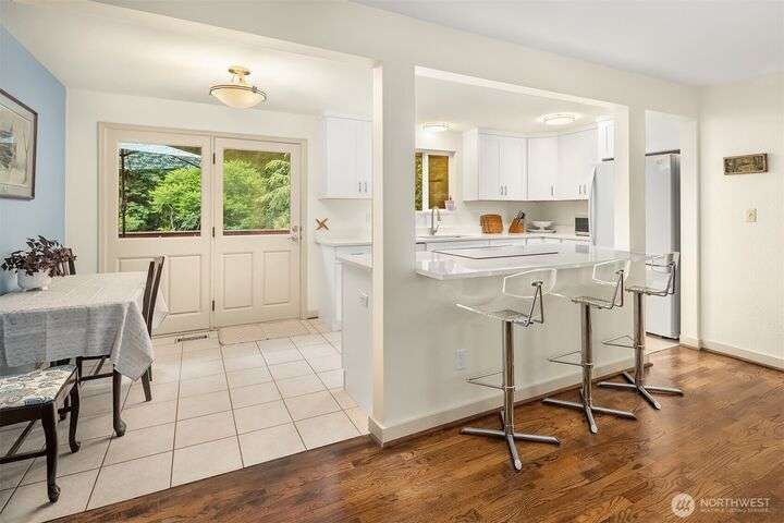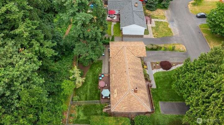 Forest retreat meets modern living. Beautiful Mid-Century rambler is nestled against Shelton View Forest with trail access. This exceptional home features two primary suites plus a versatile third bedroom/office with Murphy bed, offering the ultimate in flexible living. Oversized garage can transform into your dream workshop, home gym, or entertainment zone. Updated kitchen with beautiful quartz countertops and abundant cabinetry. Original hardwoods and striking stone fireplace deliver timeless character. AC & Heat pump provide year-round comfort. Top-rated Northshore School District, Shelton View Elementary is blocks away! Fully fenced yard with dog run and large private deck. Easy access to freeways, shopping and restaurants. Must see