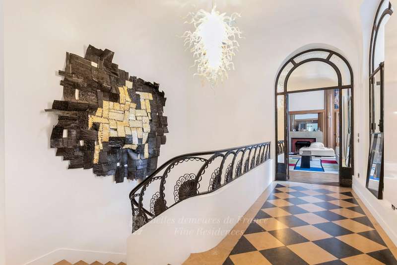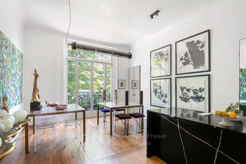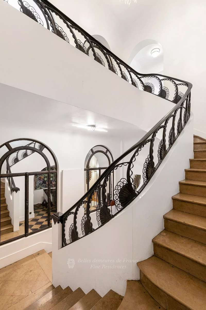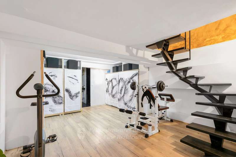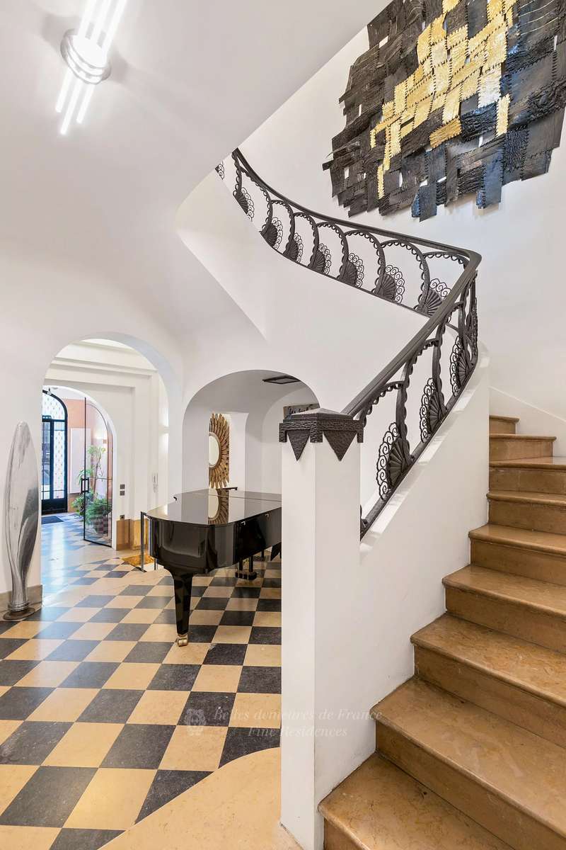 This recently renovated apartment is in a late 1920’s building located a stone’s throw from leafy Parc Monceau. Benefiting from an independent entry and with the feel of private mansion, it includes an entrance hall with a majestic Art Deco-style staircase accessing the “piano nobile” which includes a superb living/reception room in the pure Art Deco style and featuring a high ceiling and a glazed leafy patio. Also accessing the lift, this floor also includes a dining room with an adjacent kitchen, a master suite with a bath and shower room, and two bedrooms with shower rooms. 16 sqm of the apartment possible for commercial use. The ground floor comprises a studio apartment with a main room, a kitchenette, a mezzanine bedroom and a shower room. The half basement benefits from natural light and an independent entry from the basement, and comprises a spacious bedroom with a bathroom and dressing room. The fully fitted basement includes a fitness room with a shower and sauna, a recreation/screening room, a utility room, a boiler room and storage rooms. A rare opportunity in a prime location near Parc Monceau, the Champs Elysées, and Faubourg Saint Honoré’s art galleries and luxury boutiques.