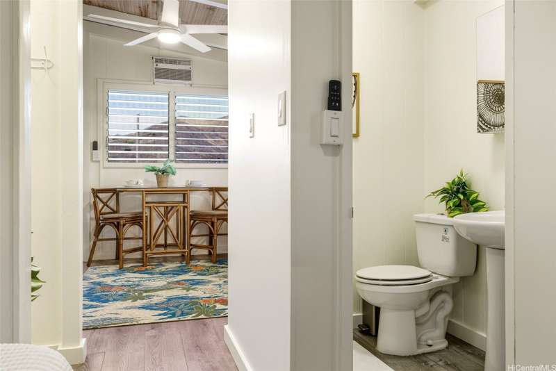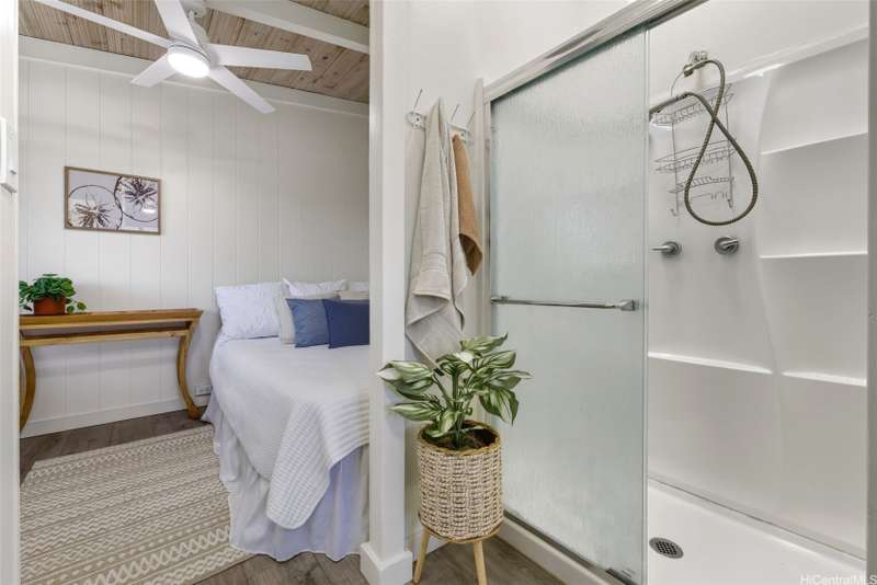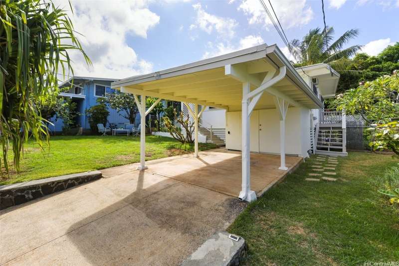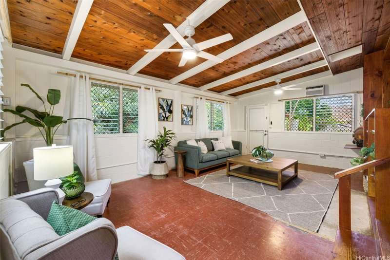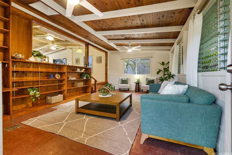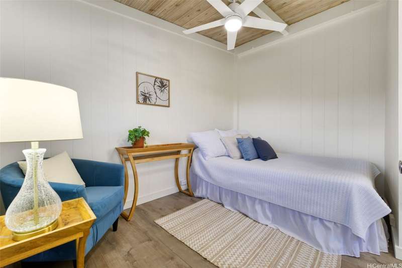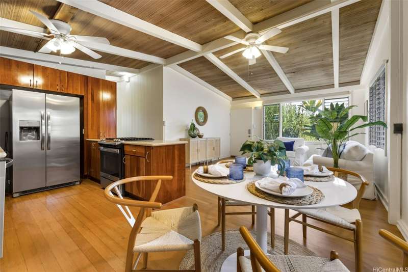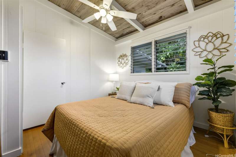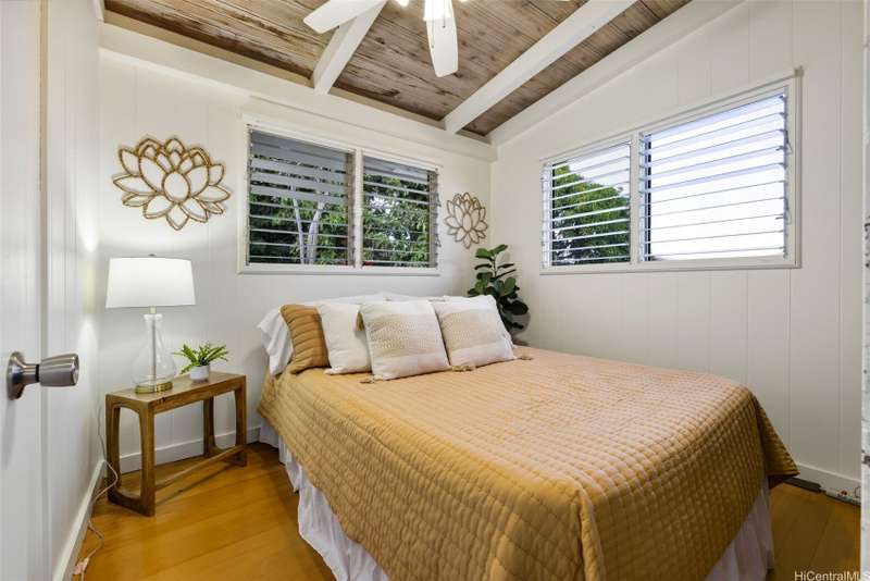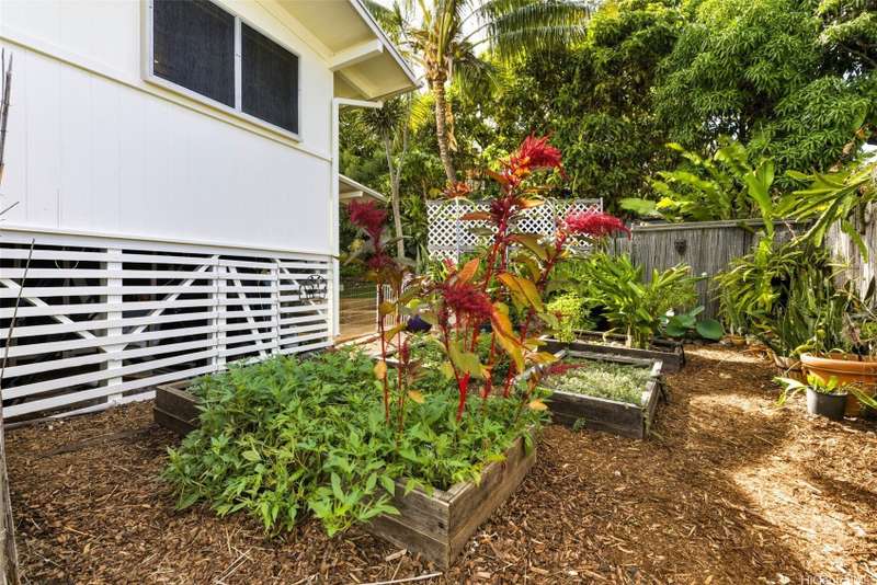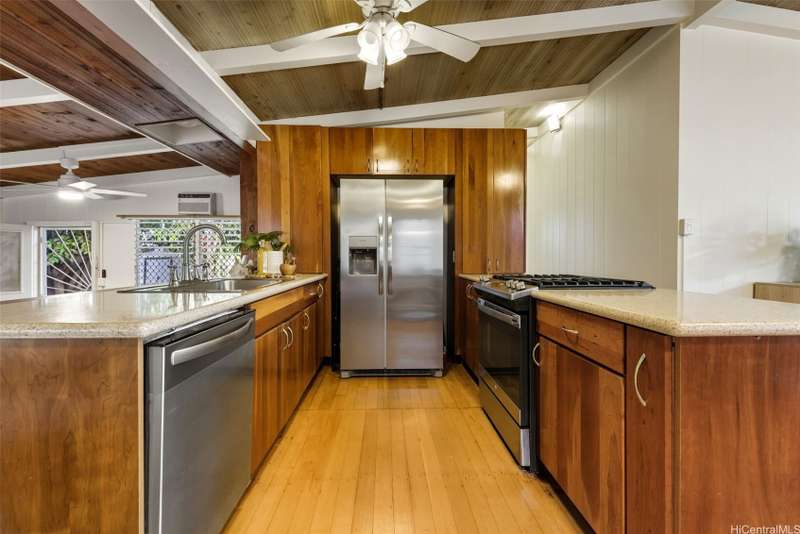 This 3-bed, 2-bath home blends classic island charm with thoughtful updates and flexible living. The expanded layout creates the perfect opportunity for an in-law suite, ideal for multi-generational living or visiting guests. The interior is full of warm, inviting details - from the white-washed combed pine ceilings to the stunning Douglas Fir hardwood floors that run through the main living areas. At the heart of the home is a kitchen that's both functional and beautiful. Solid cherry wood cabinets, composite stone countertops, a gas stove, and a brand-new refrigerator and dishwasher all come together in a layout that makes cooking and entertaining a joy. Enjoy excellent airflow with 7 ceiling fans, 2 AC units, and the added bonus of 24 OWNED solar PV panels. The yard is a true retreat. Both front and back yards offer plenty of space to relax, unwind, or entertain. Plus, a curated garden of native Hawaiian plants, herbs, and fruit trees-including mango, guava, and avocado. If you've been looking for a Kailua home that offers character, functionality, and charm, this one is definitely worth a look.