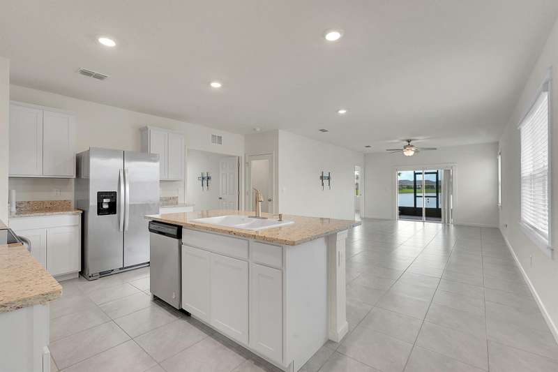 Beautifully maintained 3BR/2BA solar-powered home in Crosstown Commons with tranquil lake views and tile flooring throughout. The open-concept layout includes a modern kitchen with white cabinetry, stainless steel appliances, center island, and spacious living and dining areas. The primary suite features dual vanities, walk-in shower, and walk-in closet. Enjoy peaceful evenings from the screened patio overlooking the lake, can peacefully watch sunset. Community amenities include a pool, playground, and sidewalks. Low HOA. Conveniently located near I-95, Tradition, and St. Lucie West shopping and dining.