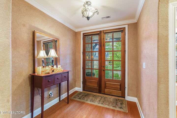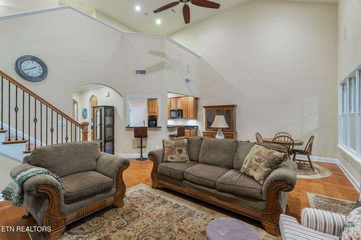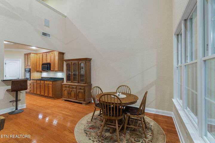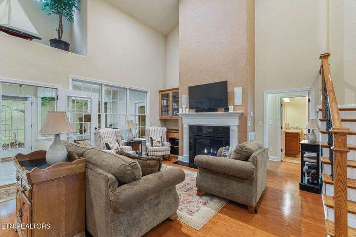 This stunning former model home is loaded with upgrades and timeless style! Step inside to discover an inviting open floor plan with 20-foot soaring ceilings, rich hardwood and tile flooring throughout (no carpet!), and custom built-ins framing a cozy gas fireplace. The main level features elegant textured walls, arched doorways, and a spacious primary suite with a tray ceiling and beautifully updated bath with new granite countertops. The kitchen is a chef's delight with granite surfaces, under cabinet lighting, a huge pantry, and seamless flow into the great room and dining area—ideal for entertaining or family gatherings. Enjoy your morning coffee or unwind in the large sunroom overlooking the private patio and landscaped backyard with new privacy fencing. Upstairs offers two spacious bedrooms, including an oversized guest room with double closets and abundant storage. Recent upgrades include a newer zoned HVAC system, all-new ductwork, a filtered air system, and a programmable thermostat for year-round comfort. Every inch of this home has been thoughtfully designed and meticulously maintained—truly move-in ready and one you won't want to miss!