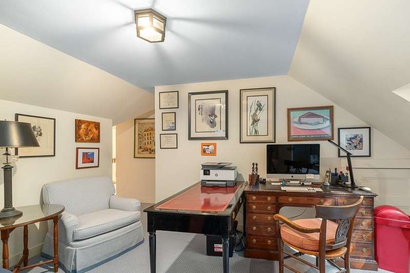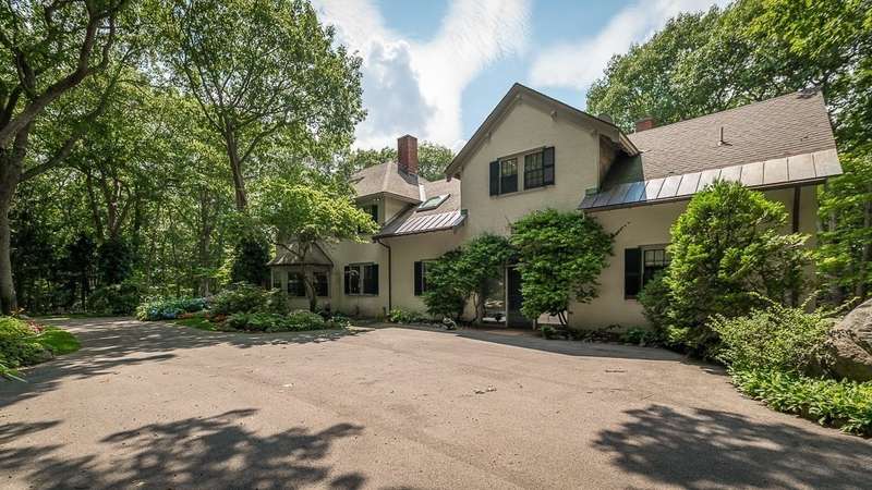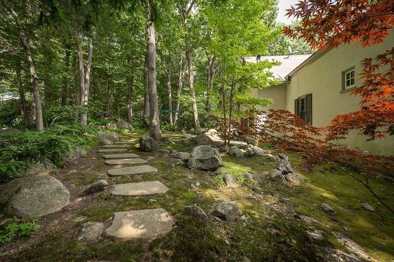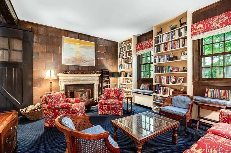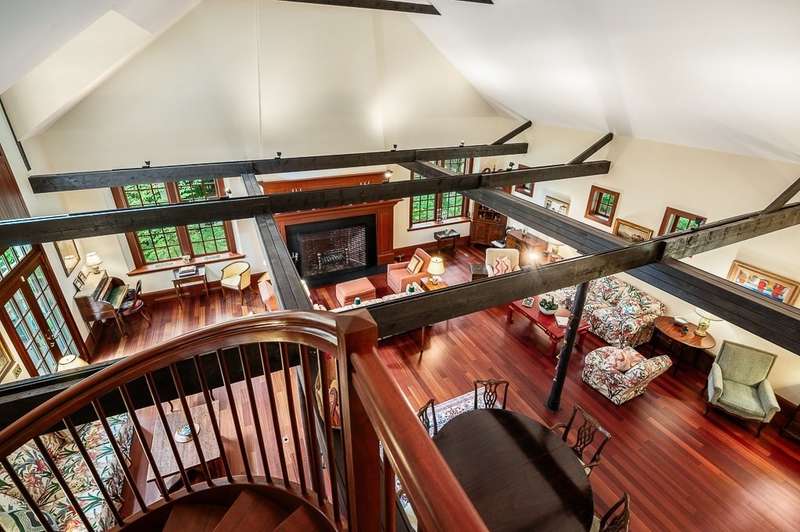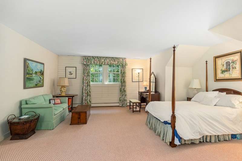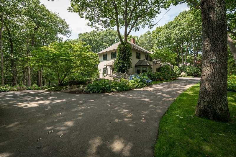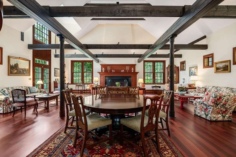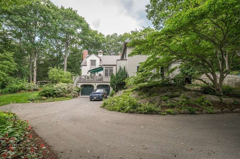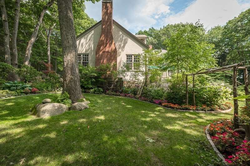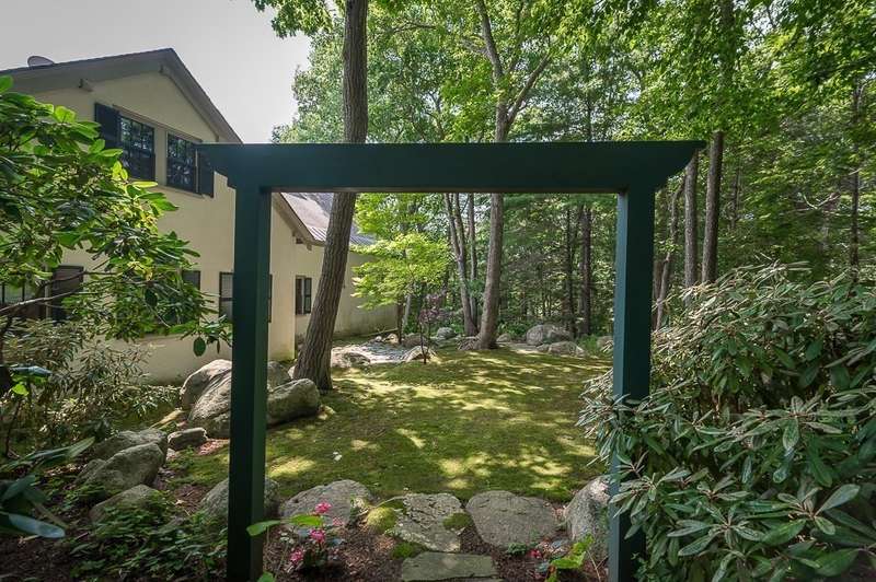 A true carriage house converted over time to a charming character-filled home nestled in lush gardens in a private enclave. The spectacular 2-story beamed great room has radiant heat, a grand fireplace and many gathering spots. A cozy fireplaced library, 3/4 bath and central entry hall with original stall doors hiding a wet bar and coat closets creates an amazing space. The formal spacious dining room flows into the sunny kitchen/family room with french doors to a deck with shade awning overlooking the gardens and meandering pathways. First floor bedroom with ensuite bathroom. Upstairs 2 quaint bedrooms share a renovated bath. The sitting room connects the skylight office area & a glass balcony space with spiral staircase access to the great room and leads to the primary with its carriage house feel of beadboard and ceiling nooks. Ensuite primary bathroom has an architectural plan for future upgrade. Nearby walking trails on over 160 acres of conservation land! A unique offering!