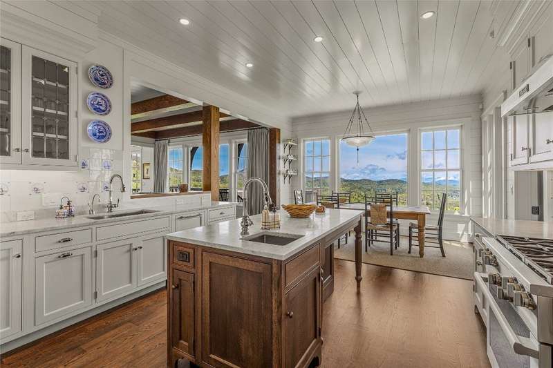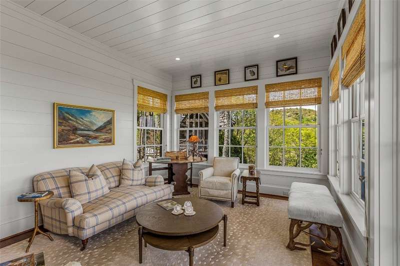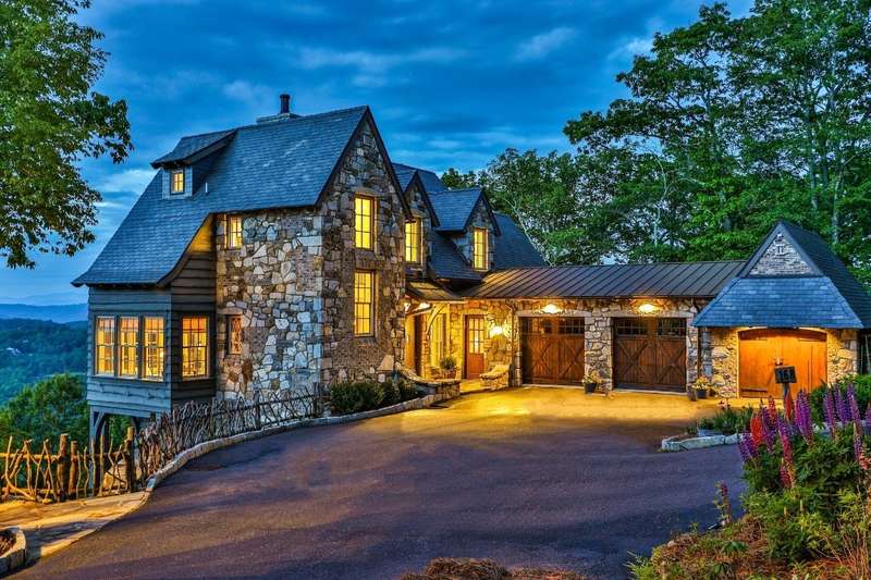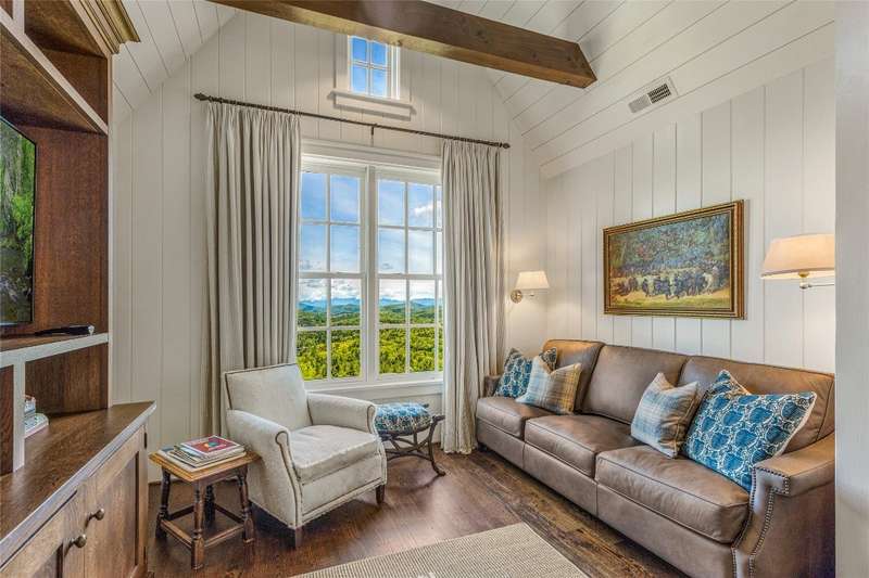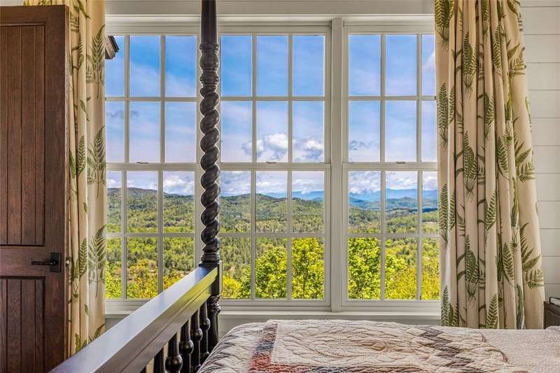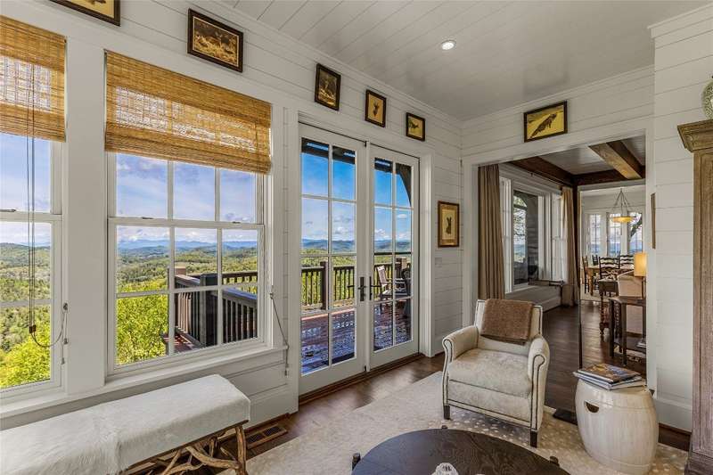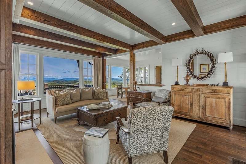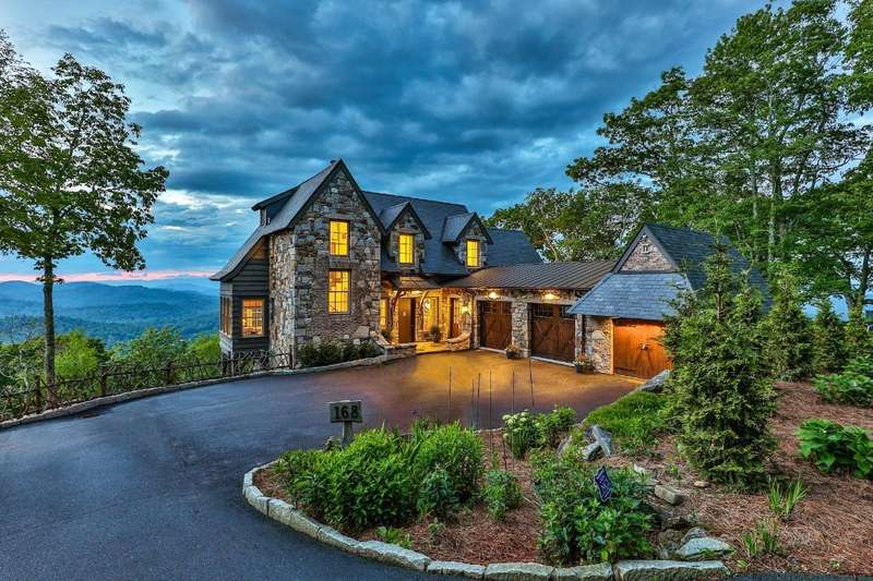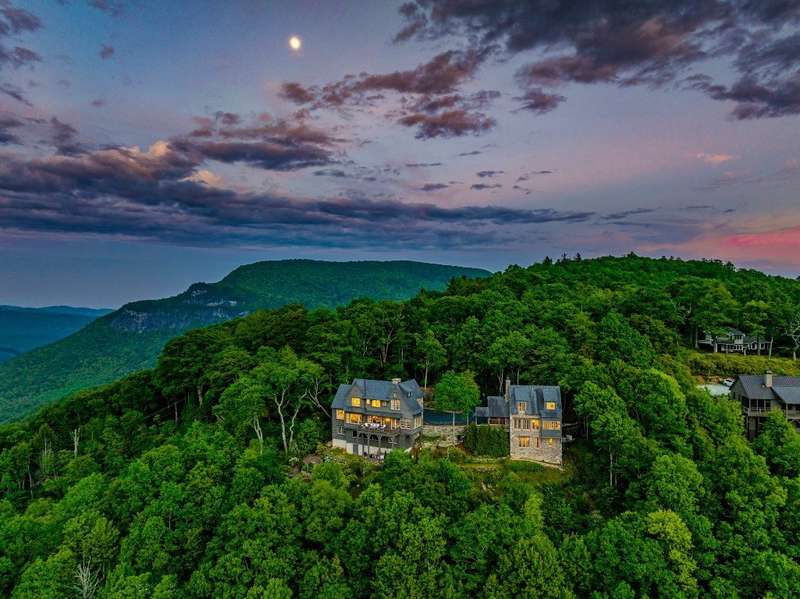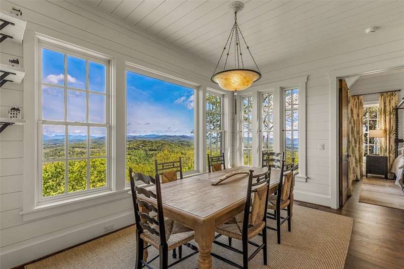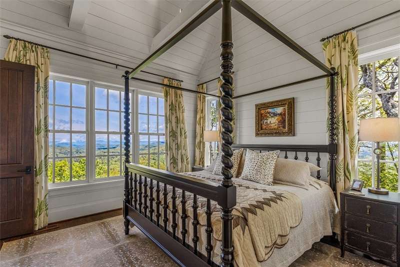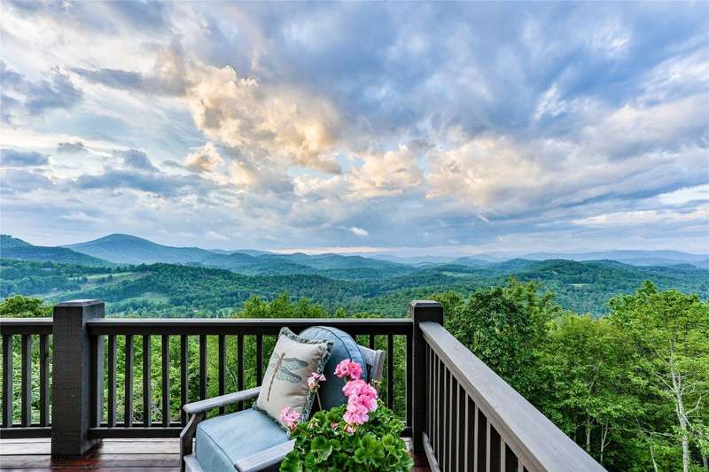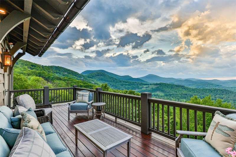 Welcome to an extraordinary European-style estate in the heart of Highlands. This fabulous and majestic property includes a beautifully designed main residence and an enchanting stone guest cottage, both showcasing sweeping panoramic views of the Blue Ridge Mountains, Old Edwards Golf Course, and a serene lake. Crafted by award-winning Mountainworks Custom Home Design, the main house features an elegant slate roof and was honored with the Designer's Choice Award by the American Institute of Building Design, as well as Best of Show. The interior is a masterclass in sophistication, offering a sun-drenched kitchen equipped with top-of-the-line Miele appliances. The adjoining sunroom invites peaceful mornings and golden-hour sunsets, while the spacious deck serves as your front-row seat to the plateau's natural, incredible views and cool breezes at an elevation above 4200 ft. The main level includes a tranquil bedroom with an ensuite bath and views of a curated cutting garden..The luxurious primary suite boasts postcard-perfect views from every angle and a luxurious bath with a serene soaking tub overlooking the clouds as they float by over the mountains. For those desiring more space the spacious lower level is insulated and ready for an additional ensuite and great /rec room with windows and doors opening to a deck leading to the perennial cutting garden ...all with magnificent views! Plans are drawn and ready for viewing. Just steps away, the guest cottage is a storybook escape with two private bedrooms-each with ensuite baths. Enter through a charming Dutch door into a warm and inviting interior that evokes the coziness of an English Cotswold cottage. An elegant yet stately stone-and-stucco fireplace anchors the living area, while a covered porch with a second fireplace offers the perfect perch for enjoying cool mountain breezes and stargazing in the evenings. The sale includes buildable main house lower level plans for future expansion and the home and guest cottage are being offered fully furnished-including elegant bespoke custom furniture, designer linens, draperies, select artwork, and curated decor that enhances its distinctive character. A one-of-a-kind retreat, impeccably maintained and thoughtfully designed-this is luxury mountain living at its finest. The mesmerizing views change with the four seasons whether watching the clouds below changing shapes to glorious reds and golds of fall to snowflakes that glisten past...it's magical in every way.