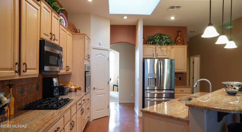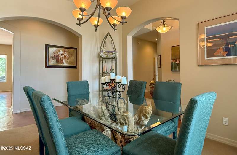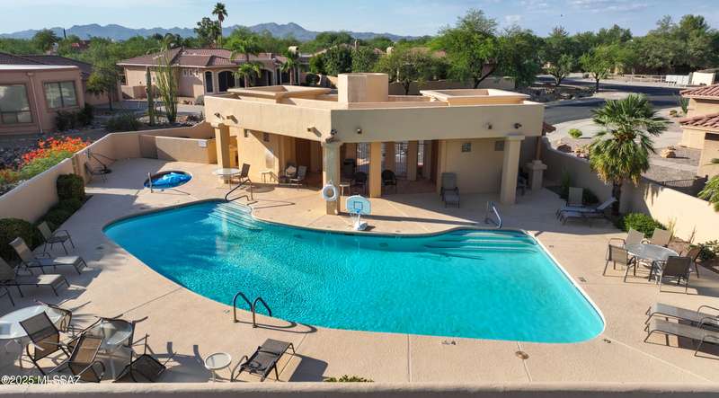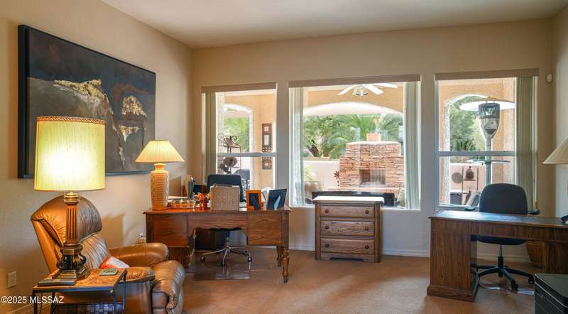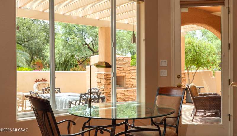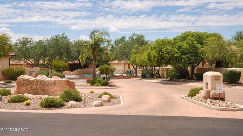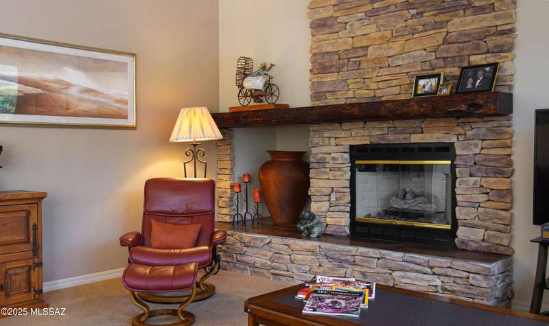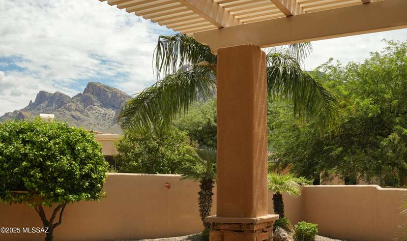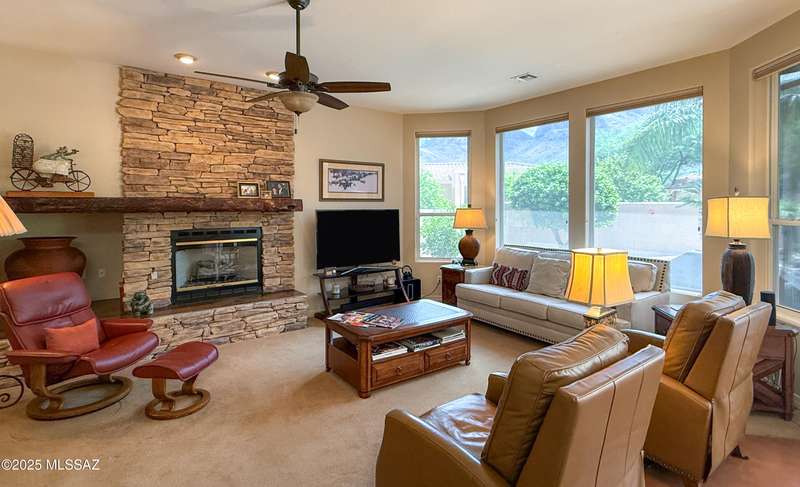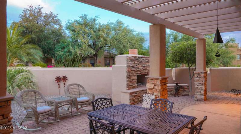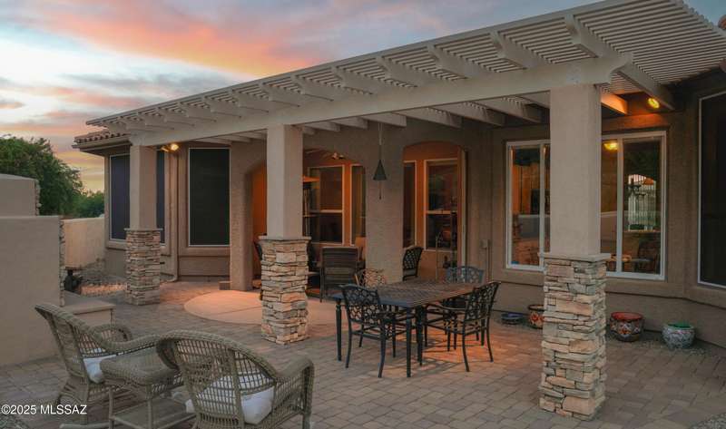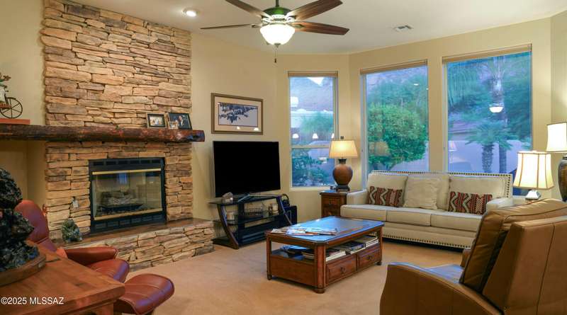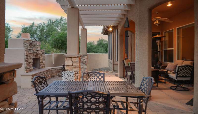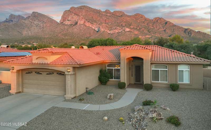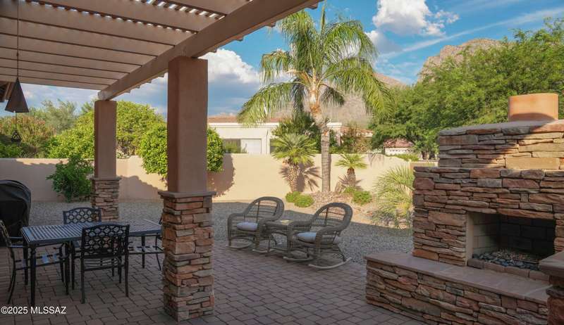 Nestled within the Oro Valley Country Club community and the gated Sunstone Estates, this A.F. Sterling-built home is ideally situated on a quiet cul-de-sac lot with fabulous views of Pusch Ridge. The thoughtful split floor plan features spacious living areas, a formal dining room, and a versatile formal living room. The family room showcases a striking stacked-stone gas fireplace with a rustic wood mantle, high ceilings, and panoramic windows that overlook the Catalina Mountains and backyard. The well-designed kitchen features granite counters, stainless steel appliances, including a gas range, a large island with pendant lighting, a breakfast nook, abundant cabinetry, & walk-in pantry. Step outside to a covered patio with a pergola roof and stone-accented columns. The paver