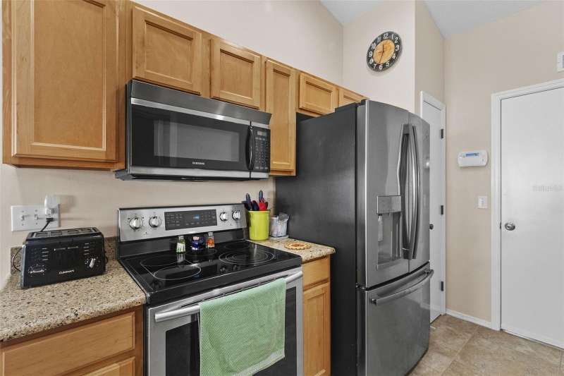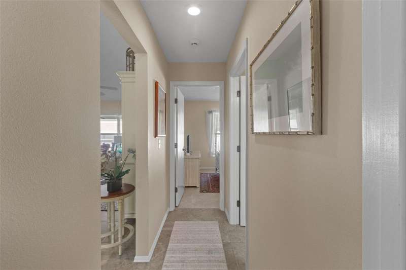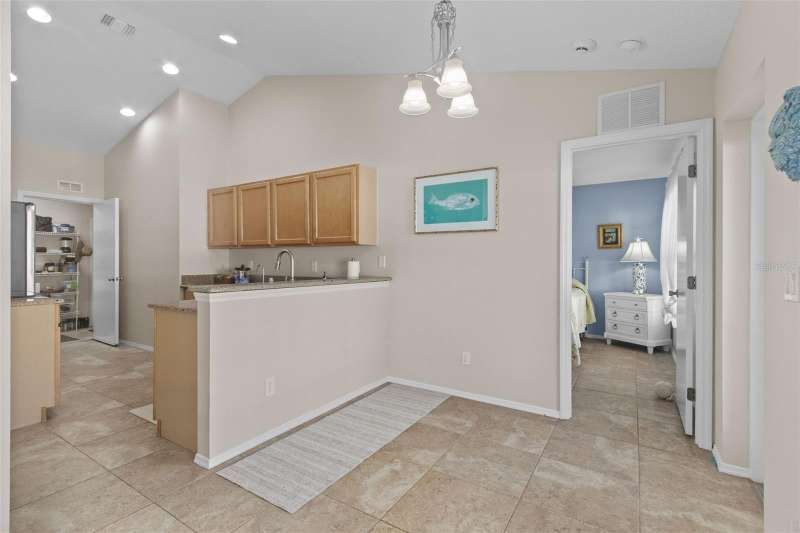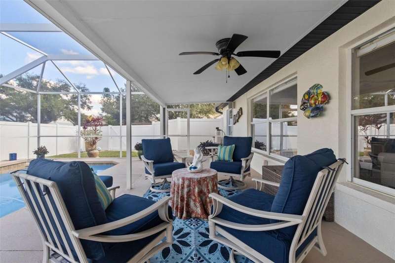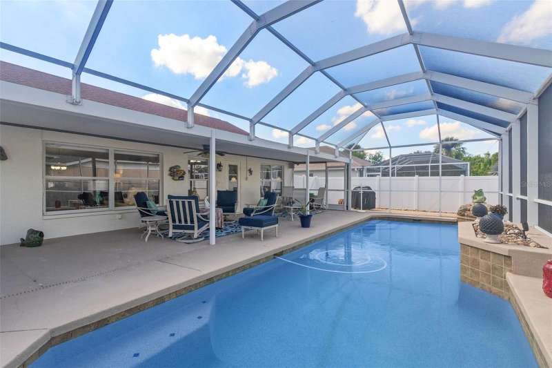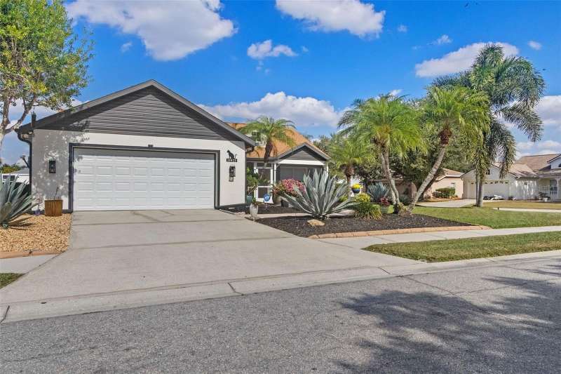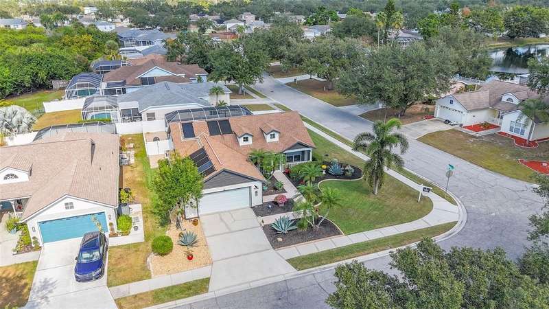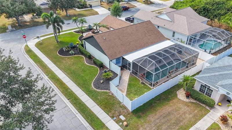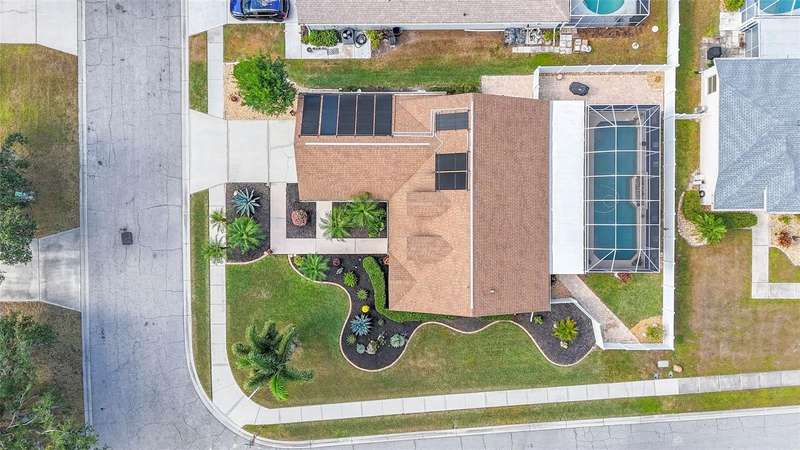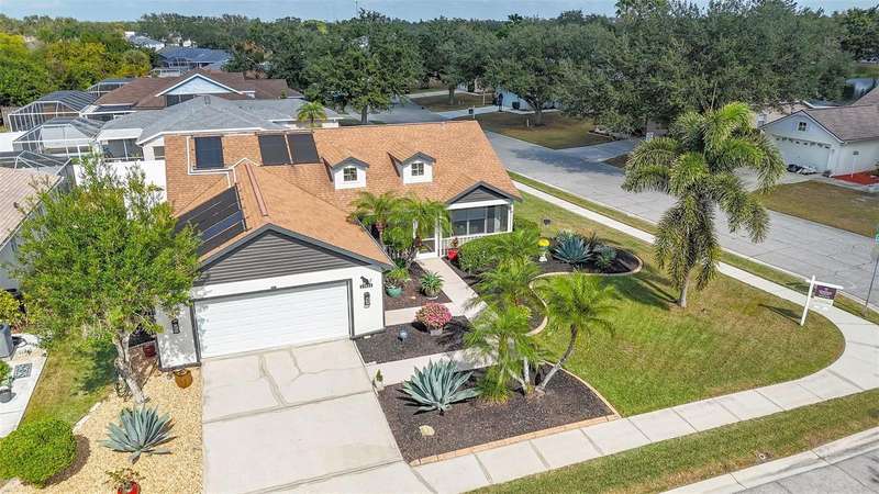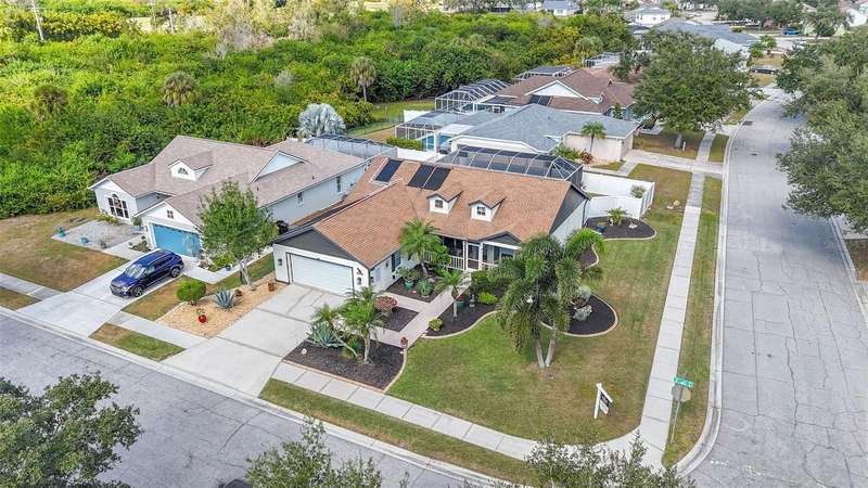 Rare opportunity in the highly sought-after Gates Creek community! This charming, low-maintenance corner-lot rancher (former model home) offers 3 beds, 2 baths, paid-off solar panels, and an ultra-low HOA. Prime location surrounded by multimillion-dollar commercial developments, new shopping plazas (including the brand-new Costco), top restaurants, multiple golf courses, and excellent schools-all just 2 miles from I-75. Light-filled open split plan with vaulted ceilings, ceramic tile throughout, quartz kitchen counters, stainless appliances, oversized 2-car garage with built-ins, and indoor laundry. Step outside to your private screened pool (34.5-ft lap-style with fountain, solar + electric heat), covered entertaining lanai, irrigated landscaping, fresh exterior paint/siding (2.5 yrs old), and fully screened front porch for outstanding curb appeal. Move-in ready, impeccably maintained, and truly turnkey-don't miss this!