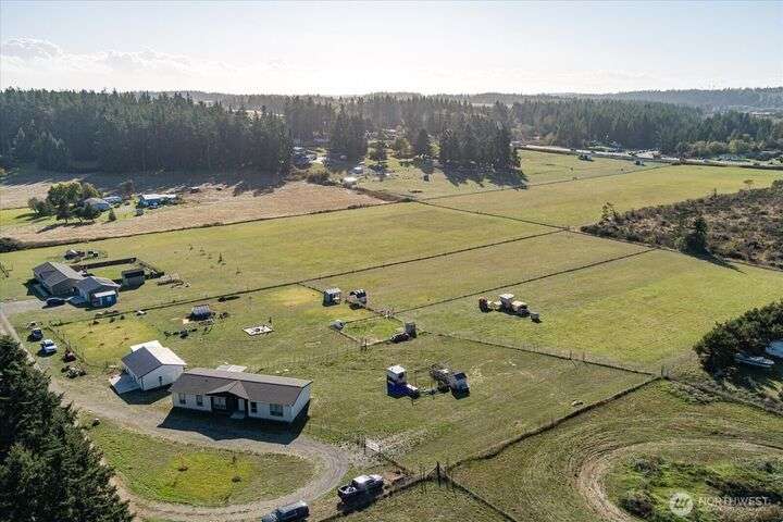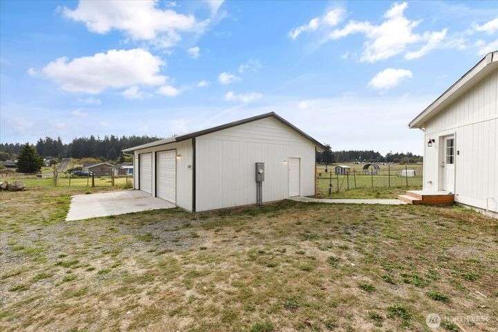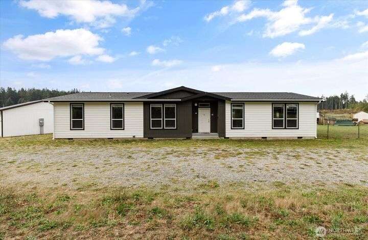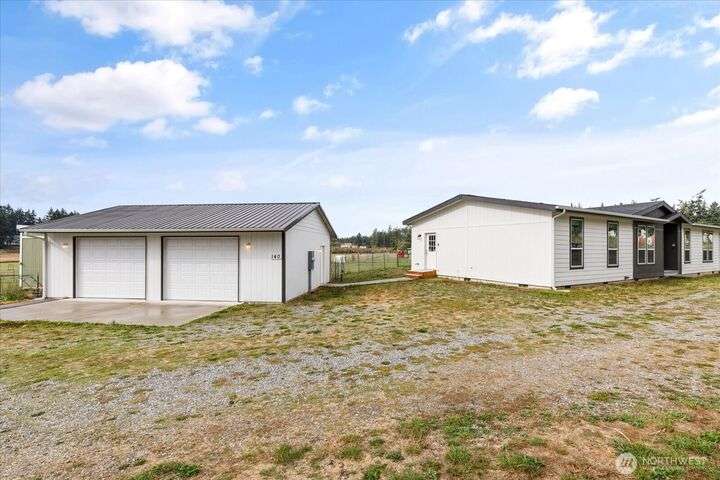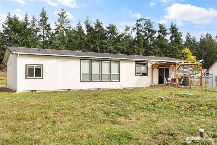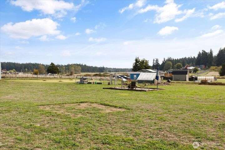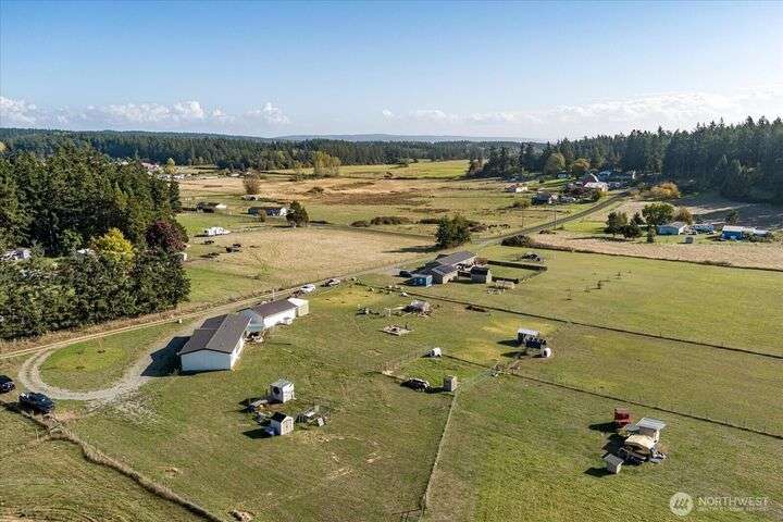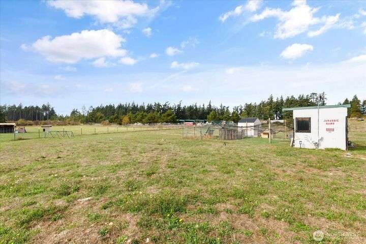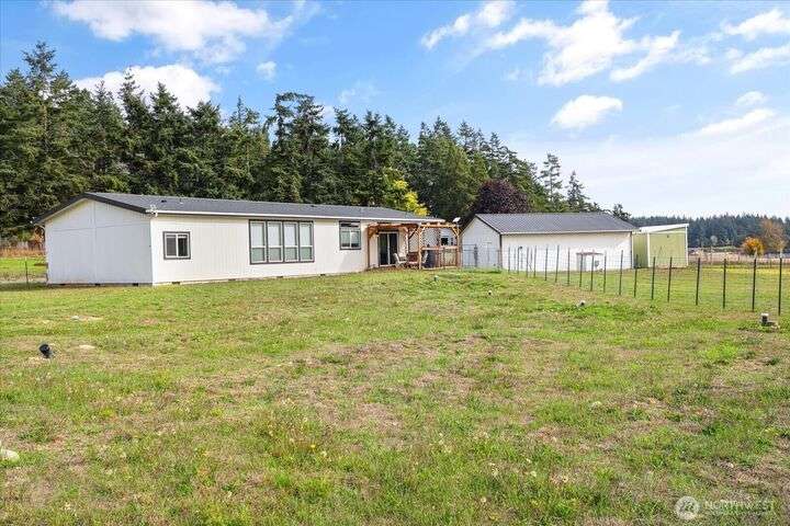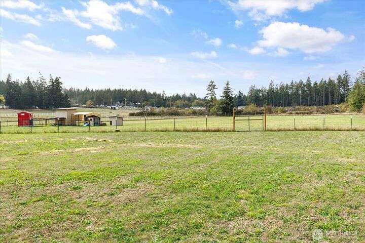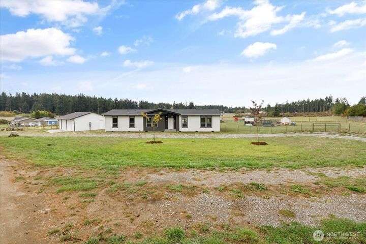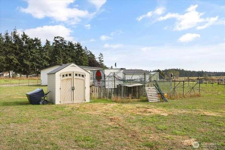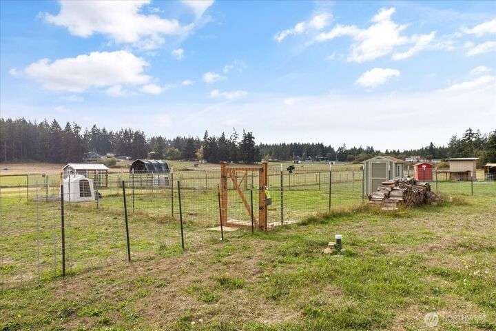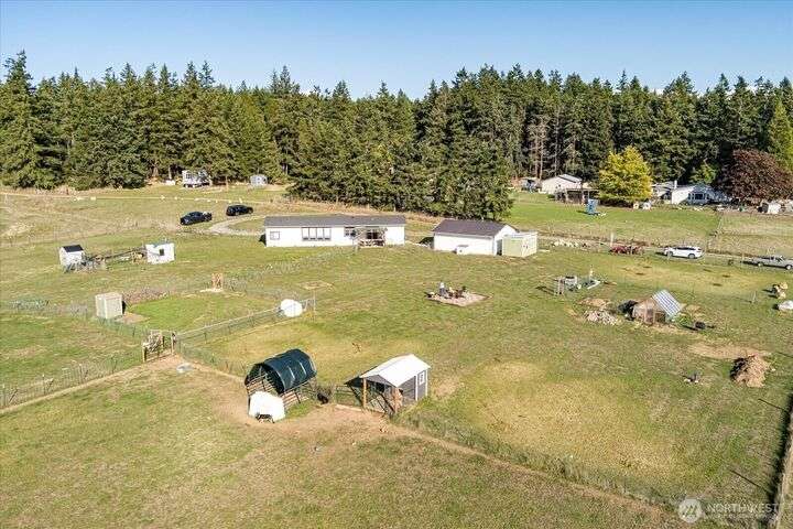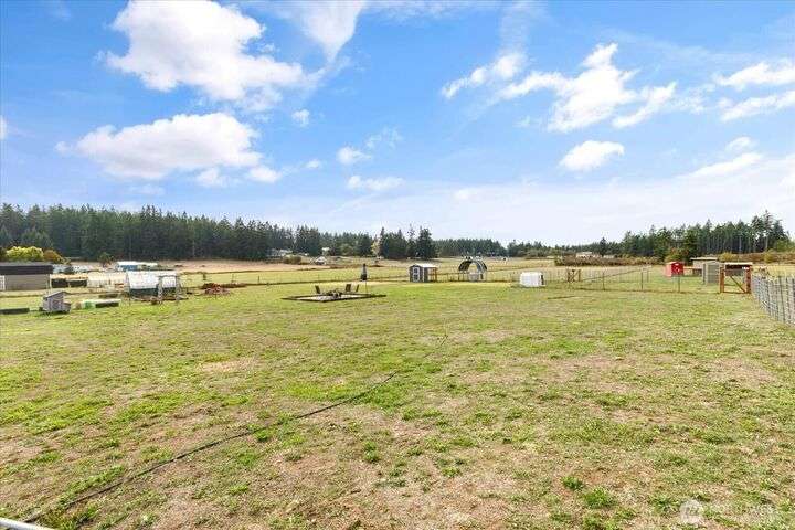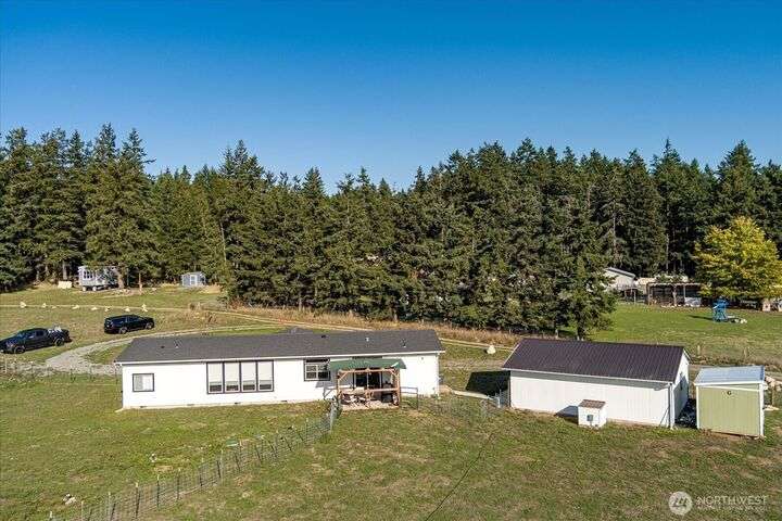 Bring your animals! This HOBBY FARM is fully fenced & cross fenced. It's fully equipped w/chicken coop, dog run w/insulated shelter, goat/sheep barn, water troughs, & 2 Tuff Sheds for feed or equipment storage. Get plants started early in the greenhouse w/raised beds, plus fruit trees for canning or pies. 2022 manufactured home offers modern living w/spacious kitchen featuring lg island, split-bedroom floorplan for privacy, & generous primary suite. Detached 2-car garage provides space for vehicles or workshop, & Graceland shed offers more room for hobbies/storage. Enjoy summer evening sunsets by the firepit on its charming brick patio. Includes private well & whole-home water filtration system. Country living near town & NAS Whidbey.