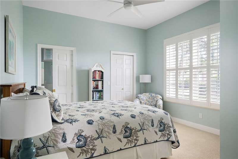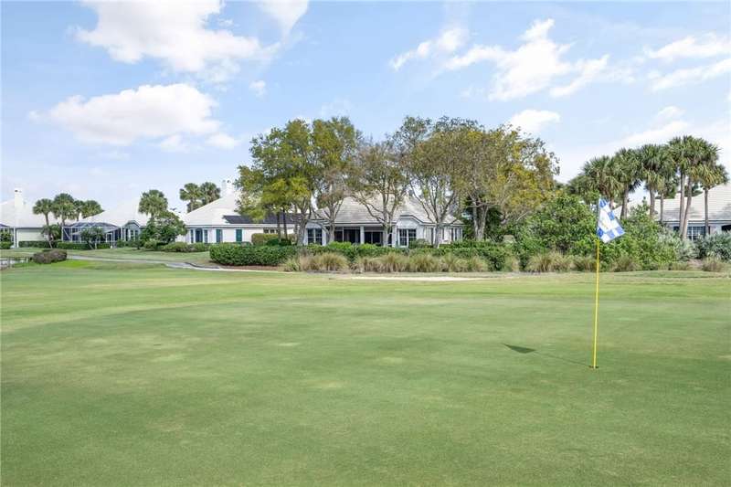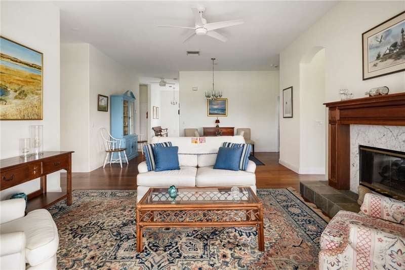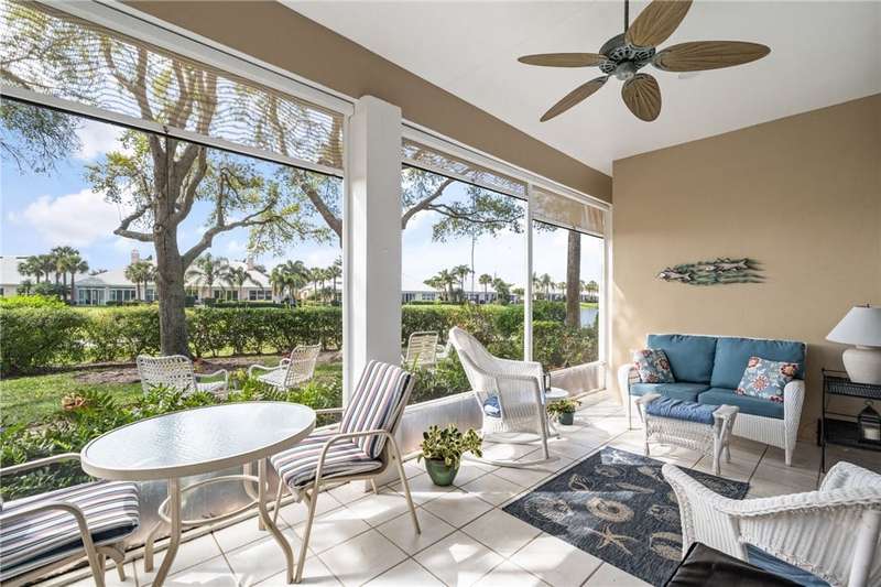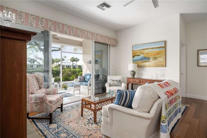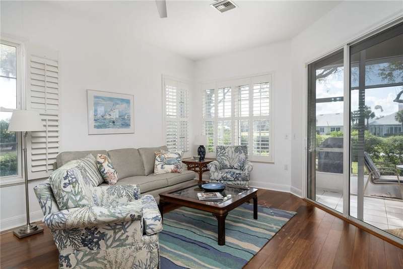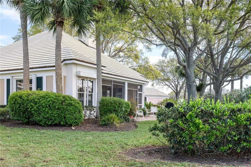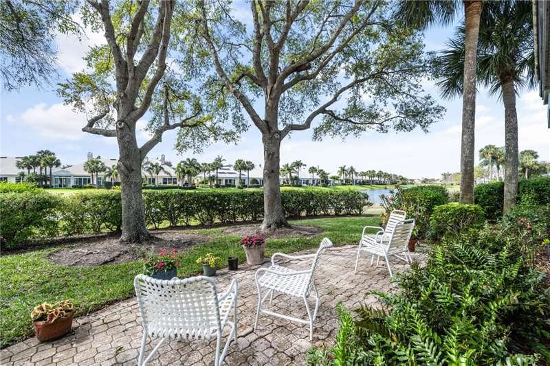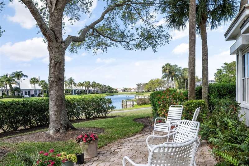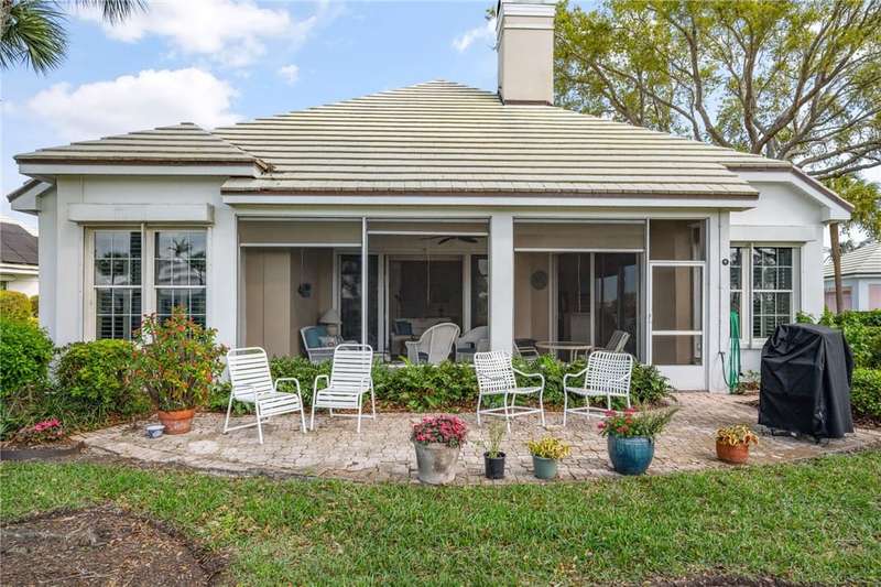 PERFECT home for entertaining inside and al fresco. Amazing, private oversized lot with lush landscaping with mature trees providing shade over the brick patio to enjoy the sunsets, lake and golf views. Split bedroom plan allows privacy for owners and guests. Roof replaced 2020, home re-piped 2021, HW tank replaced 2023, electrical panel replaced 2018, freshly painted 2025, new range 2025, wood floors, plantation shutters throughout, fans, two sided fireplace, fully screened porch. roll-down or accordion shutters on windows and doors, den and guest powder room. Rmszapprox
