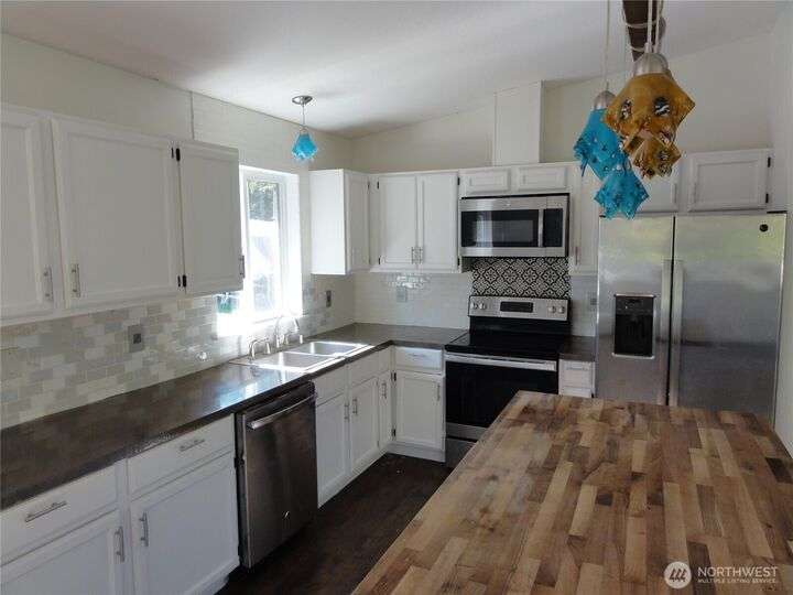 Wow! Great opportunity on the 4 bedroom home situated in Twanoh Falls neighborhood. With nearly 1600 sq ft, this home offers 2 bedrooms on the main level. One being the primary bedroom with its own bath. Open concept for the family room and kitchen. Huge island offers the ability to see and talk to guests from the kitchen to the family room. Sliding glass door opens to a very nice deck. Downstairs, there are 2 more bedrooms, bath and laundry area. Garage offers plenty of counter space and cabinets for any mechanic! Very private setting down this dead end road. Only minutes to the park won the hill.