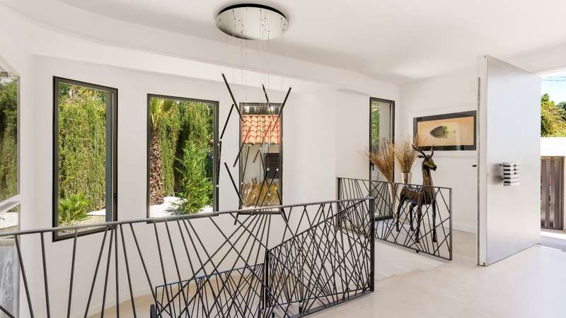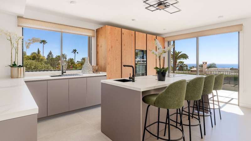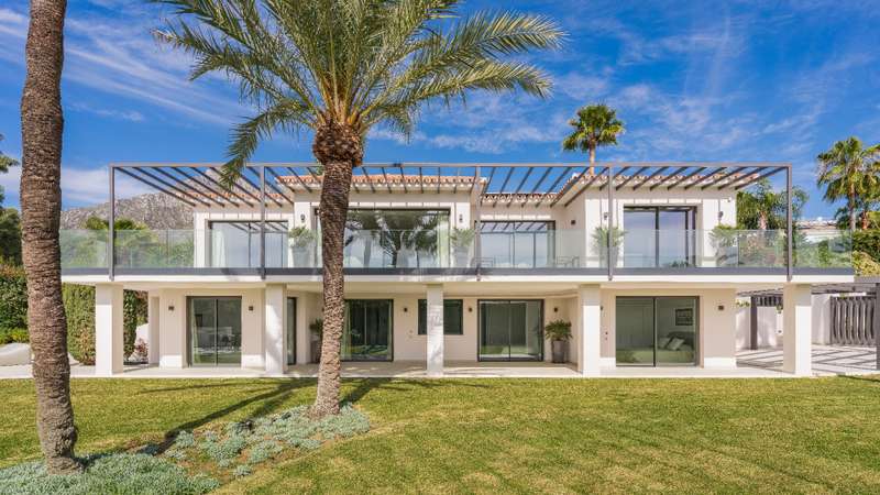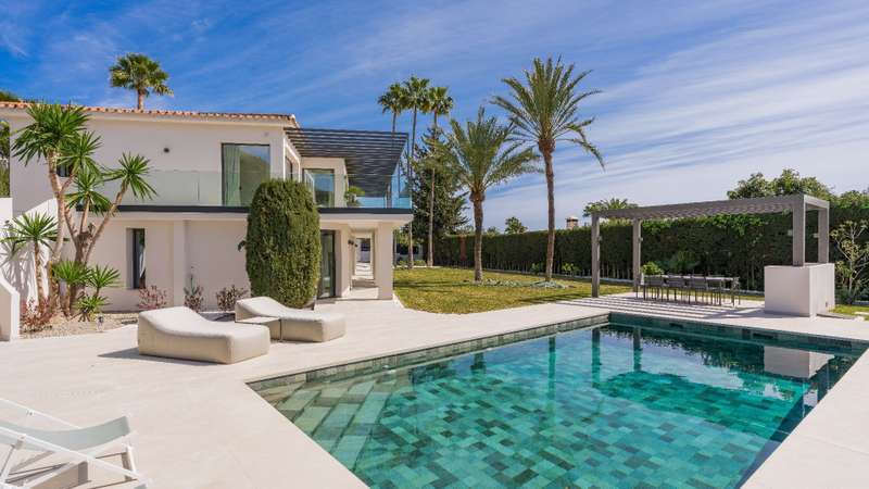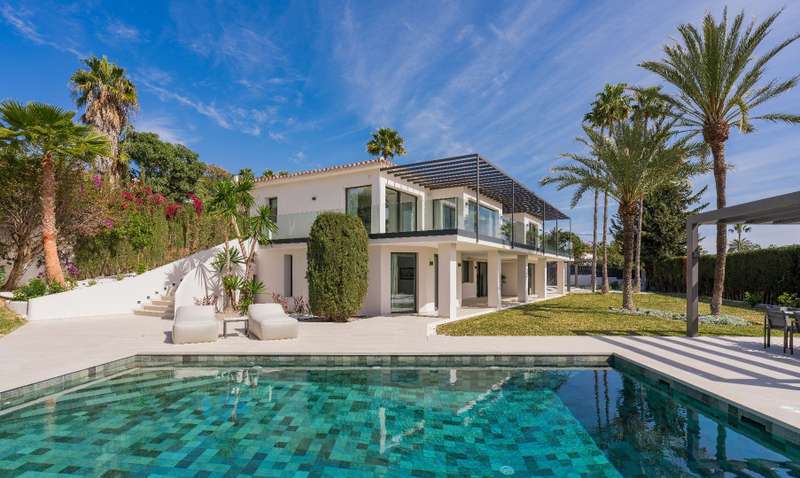 This modern villa is located in Nagueles, a community on the prestigious Golden Mile I Marbella. Situated centrally, it offers easy access to Marbella town and enjoys stunning views of the sea and mountains from the entrance level. With 5 bedrooms, 5 bathrooms, and 1 toilet, this spacious property is perfect for a luxurious lifestyle. As you enter the villa, you are greeted by a large and bright living room with a dining area and a fully equipped kitchen. The master bedroom, complete with an en-suite bathroom, is also located on this level. From most rooms, you can access the large terrace, which is perfect for entertaining guests or simply enjoying the breathtaking views. On the ground floor, you will find 3 more en-suite bedrooms, one of which is larger, and a fifth bedroom with a separate bathroom. There is also a laundry area and a versatile room that can be used as a gym or home office. From this level, you have direct access to a terrace and the private pool. This villa