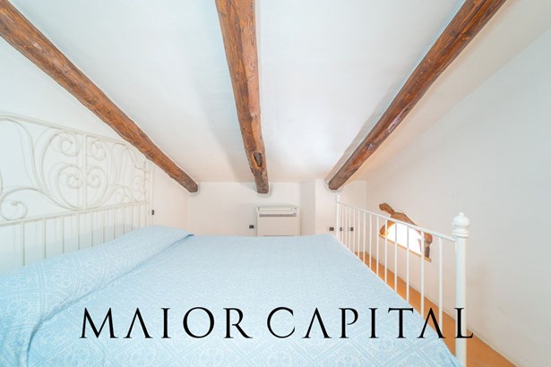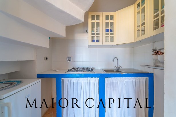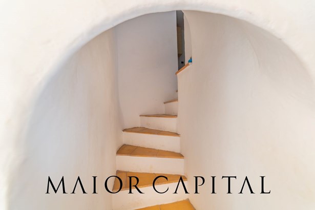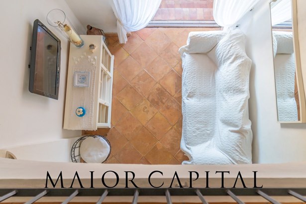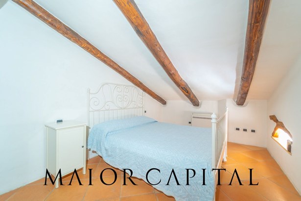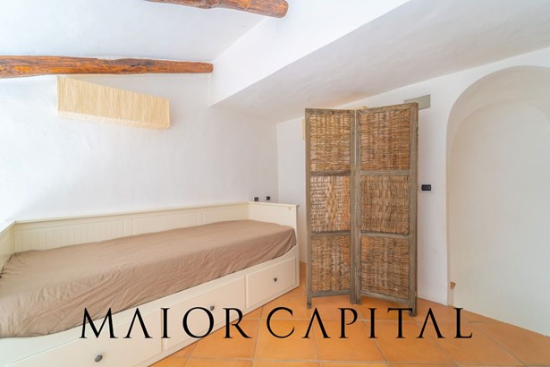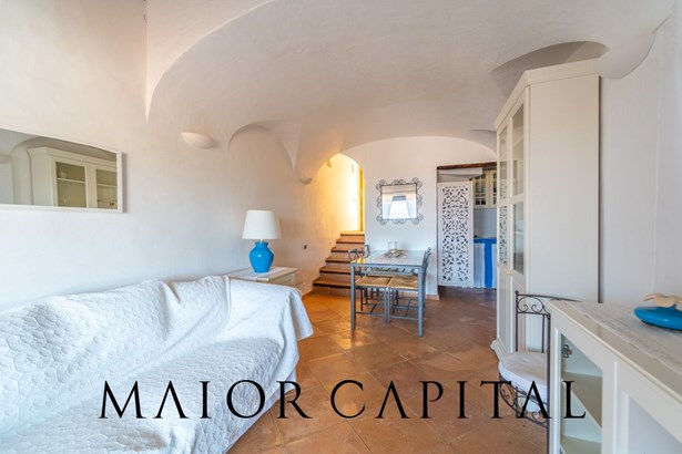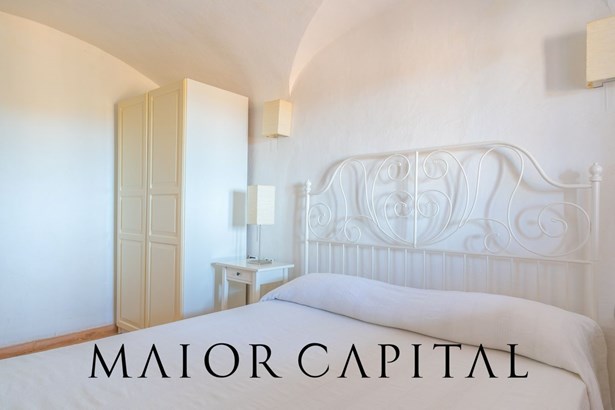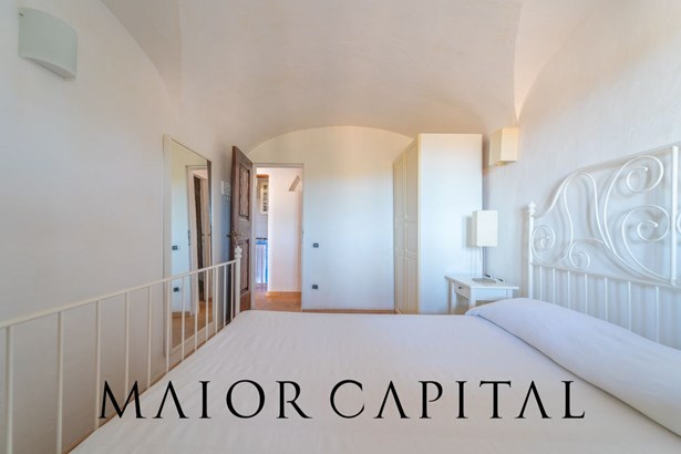 As soon as you cross the threshold, you will be greeted by a spectacular living room, where large windows framed by billowing white curtains open onto a dreamlike panorama. The architectural vaults and niches blend harmoniously with exposed wooden beams, creating a warm and cosy ambience that recalls the charm and authenticity of Sardinian design. This space, bathed in natural light and sea air, offers the perfect setting to create unforgettable memories, in total relaxation.
