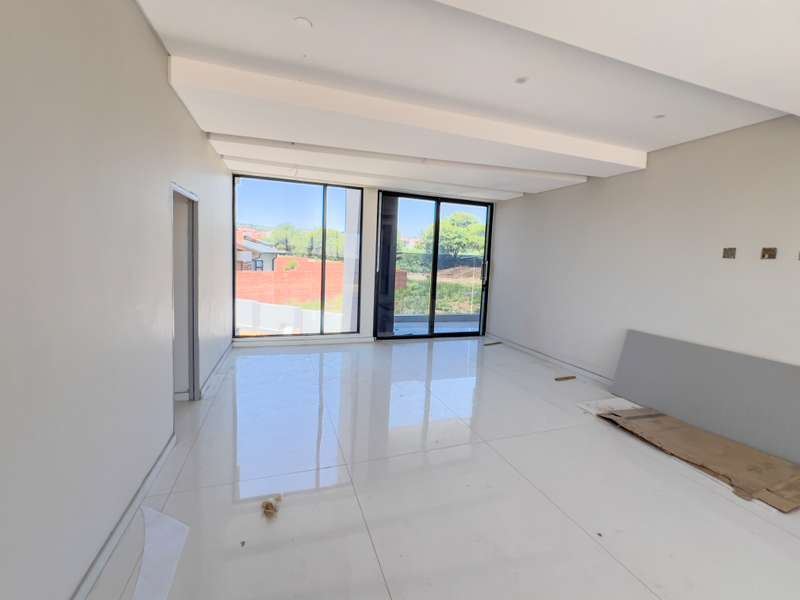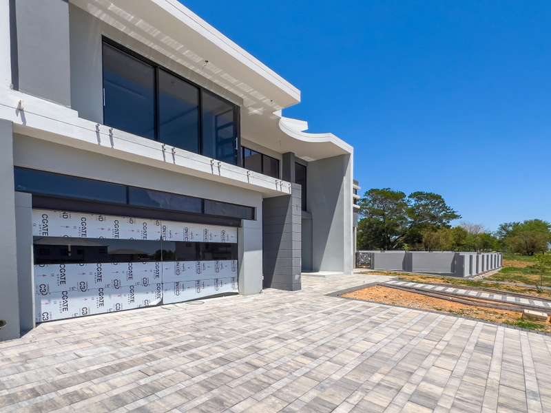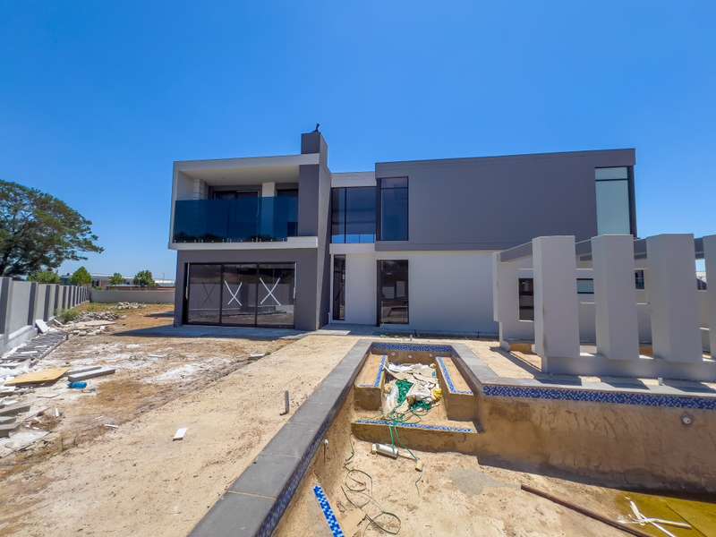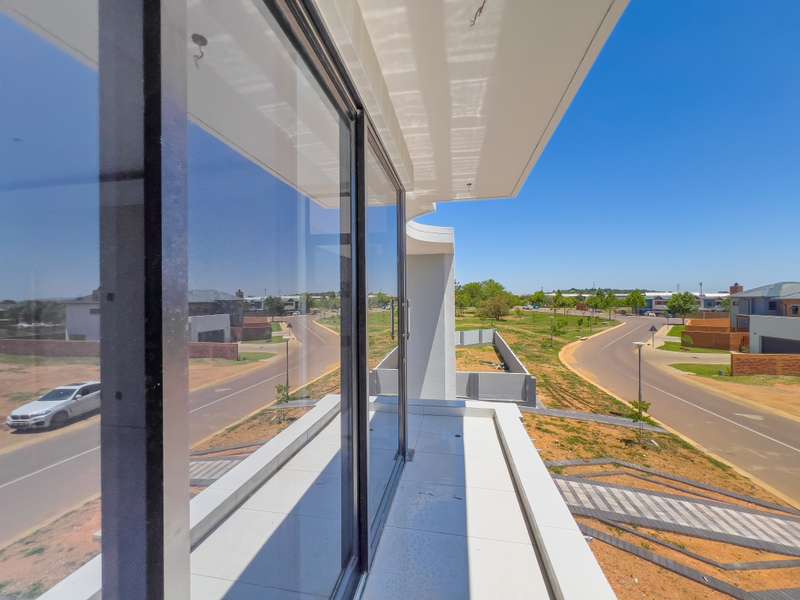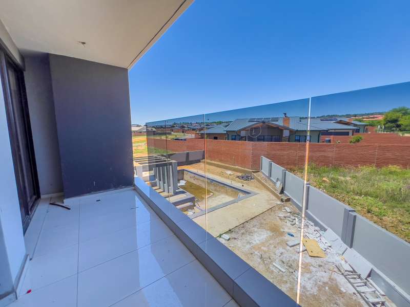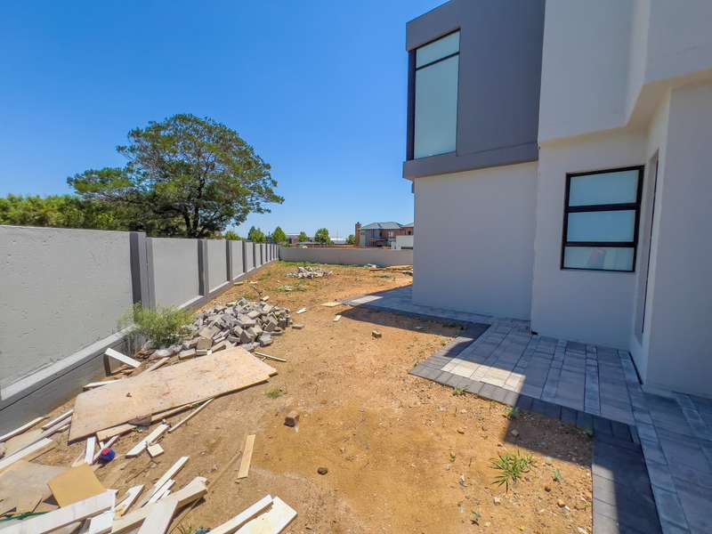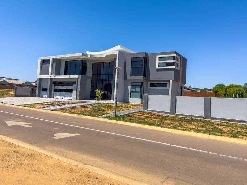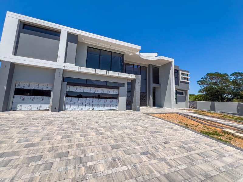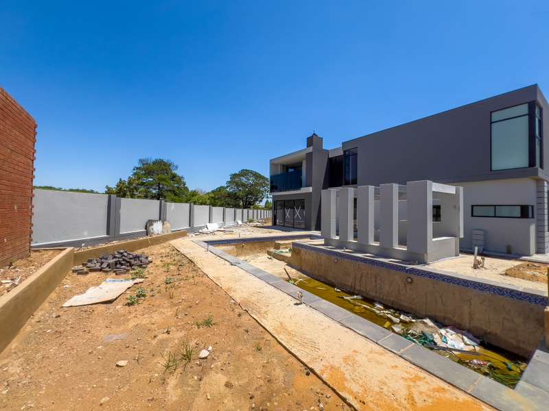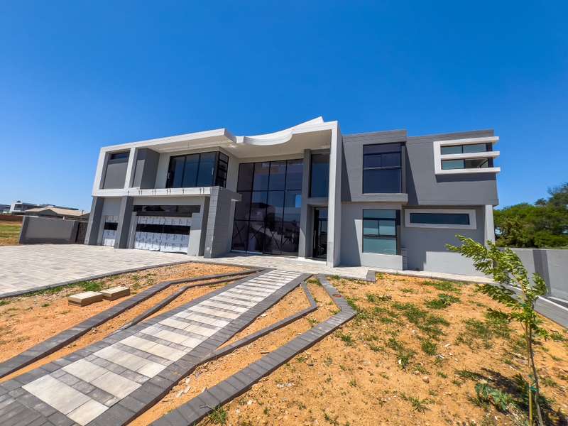 This exquisite newly built home offers contemporary living at its finest, with expansive spaces, high-end finishes, and thoughtful design throughout. Lower Level Features: A grand double-volume entrance hall with a striking spiral staircase. An ultra-modern kitchen equipped with a separate scullery, laundry area, walk-in pantry, and an island breakfast nook – perfect for family gatherings. Open-plan dining and formal lounge areas seamlessly flowing into a spacious family lounge. A private study ideal for remote work or personal projects. A guest toilet for added convenience. The fifth/guest bedroom with a full en-suite bathroom and sliding doors leading to the garden. Covered patio with a built-in braai, perfect for entertaining, opening up to the beautifully landscaped garden. Upper Level Features: A spacious pajama lounge with sliding doors opening to a balcony. Four luxurious bedrooms, each with en-suite bathrooms (three full, one with a shower). Two balconies providing tranquil views. The master suite features a private dressing room, a luxurious en-suite bathroom, and sliding doors opening to a private balcony. Outdoor Features: A sparkling pool and a cozy boma area, perfect for relaxing or entertaining. Domestic accommodation for added convenience. Three automated garages (double and single) with ample additional parking space. Solar geyser for energy efficiency. Additional Information: Transfer duties are included, ensuring a seamless purchase process.