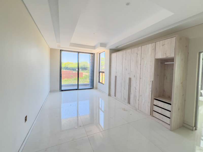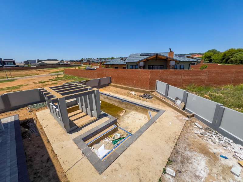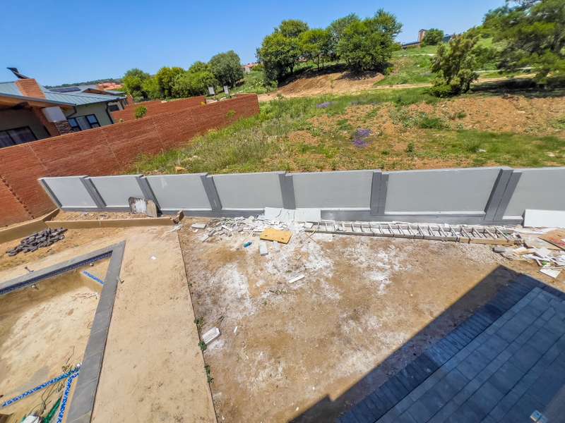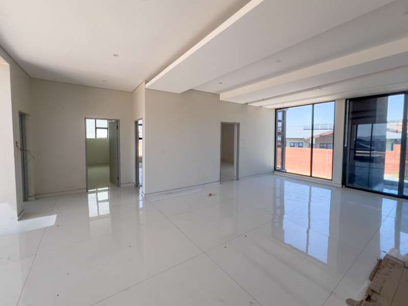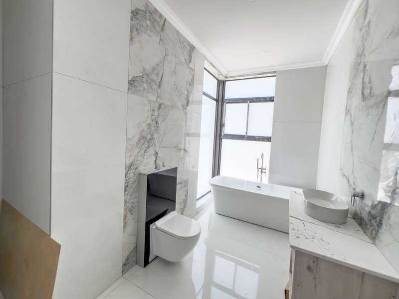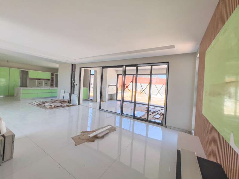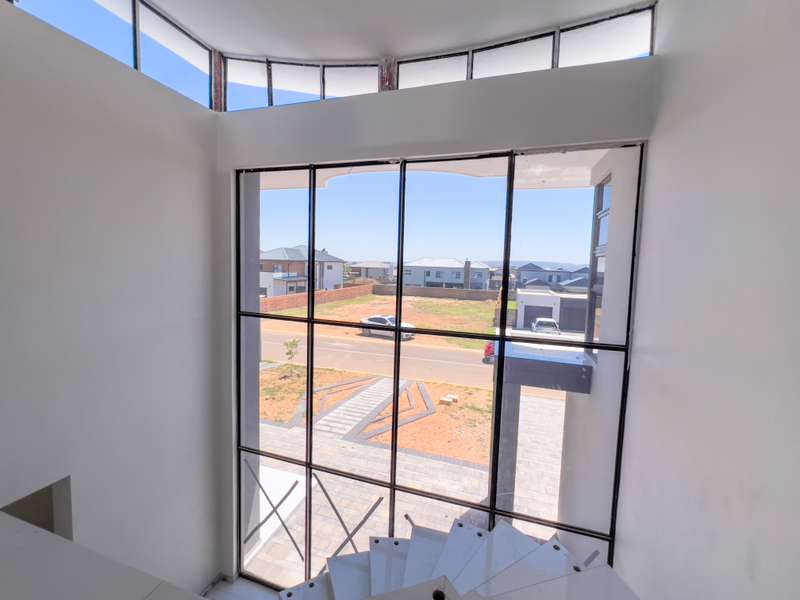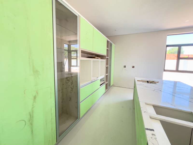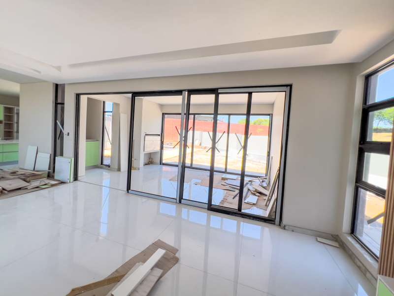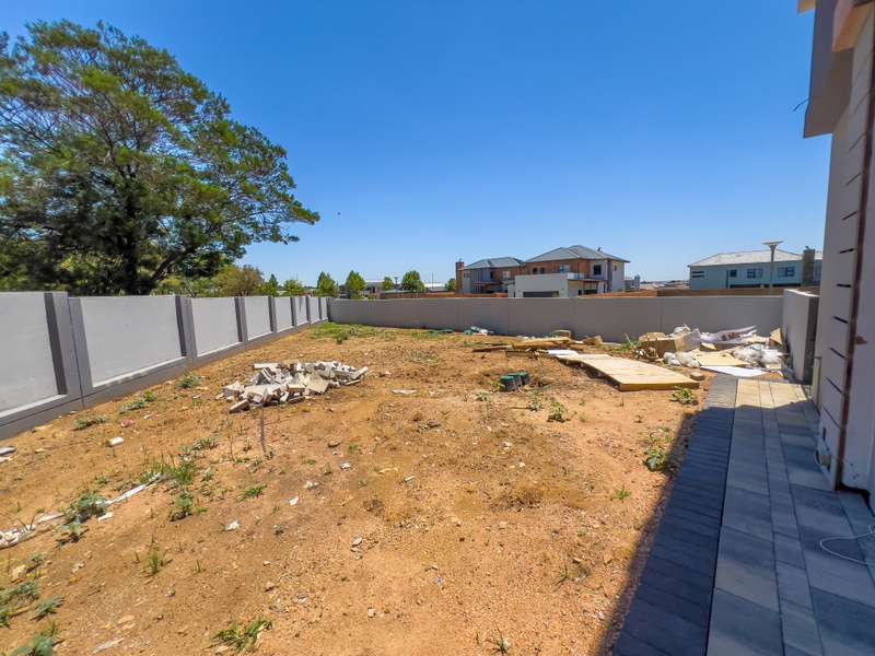 This exquisite newly built home offers contemporary living at its finest, with expansive spaces, high-end finishes, and thoughtful design throughout. Lower Level Features: A grand double-volume entrance hall with a striking spiral staircase. An ultra-modern kitchen equipped with a separate scullery, laundry area, walk-in pantry, and an island breakfast nook – perfect for family gatherings. Open-plan dining and formal lounge areas seamlessly flowing into a spacious family lounge. A private study ideal for remote work or personal projects. A guest toilet for added convenience. The fifth/guest bedroom with a full en-suite bathroom and sliding doors leading to the garden. Covered patio with a built-in braai, perfect for entertaining, opening up to the beautifully landscaped garden. Upper Level Features: A spacious pajama lounge with sliding doors opening to a balcony. Four luxurious bedrooms, each with en-suite bathrooms (three full, one with a shower). Two balconies providing tranquil views. The master suite features a private dressing room, a luxurious en-suite bathroom, and sliding doors opening to a private balcony. Outdoor Features: A sparkling pool and a cozy boma area, perfect for relaxing or entertaining. Domestic accommodation for added convenience. Three automated garages (double and single) with ample additional parking space. Solar geyser for energy efficiency. Additional Information: Transfer duties are included, ensuring a seamless purchase process.