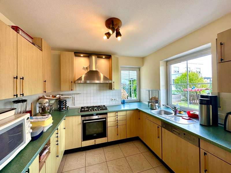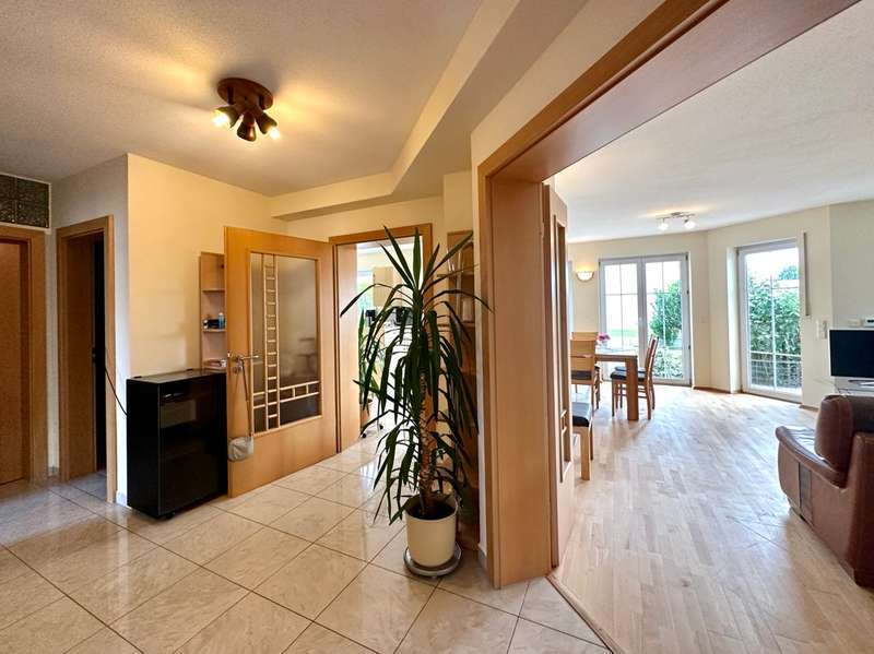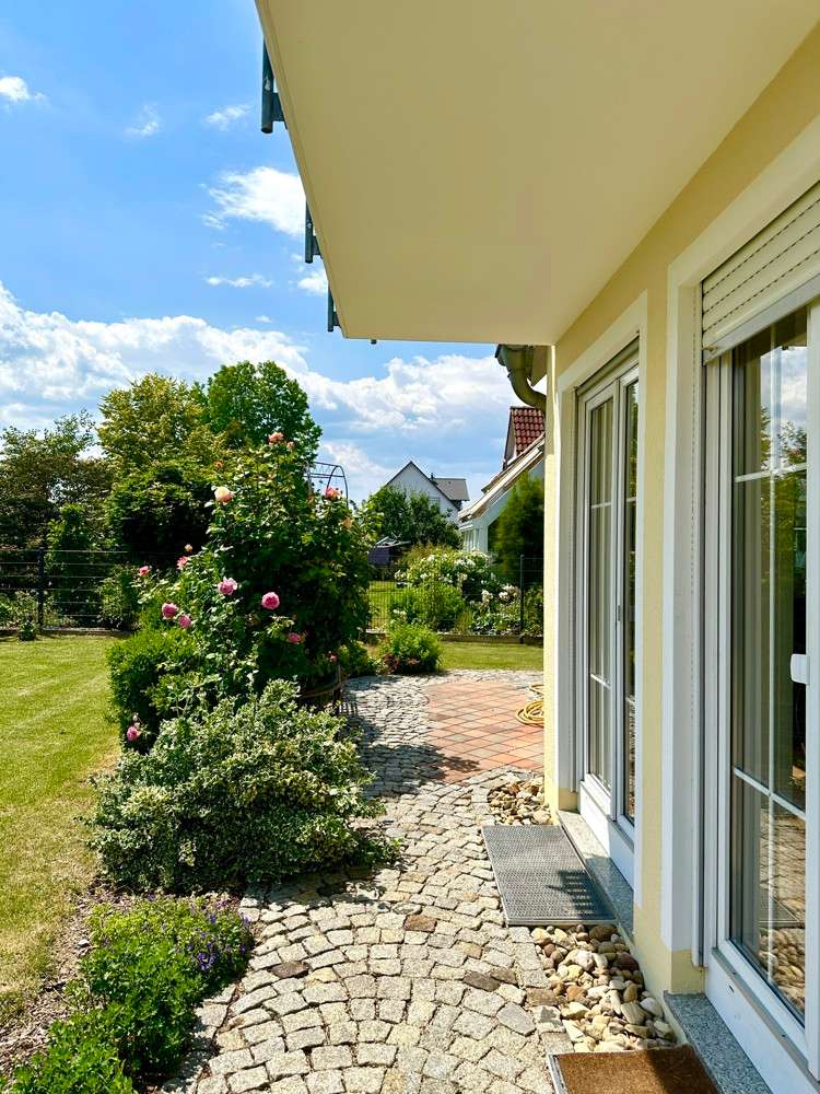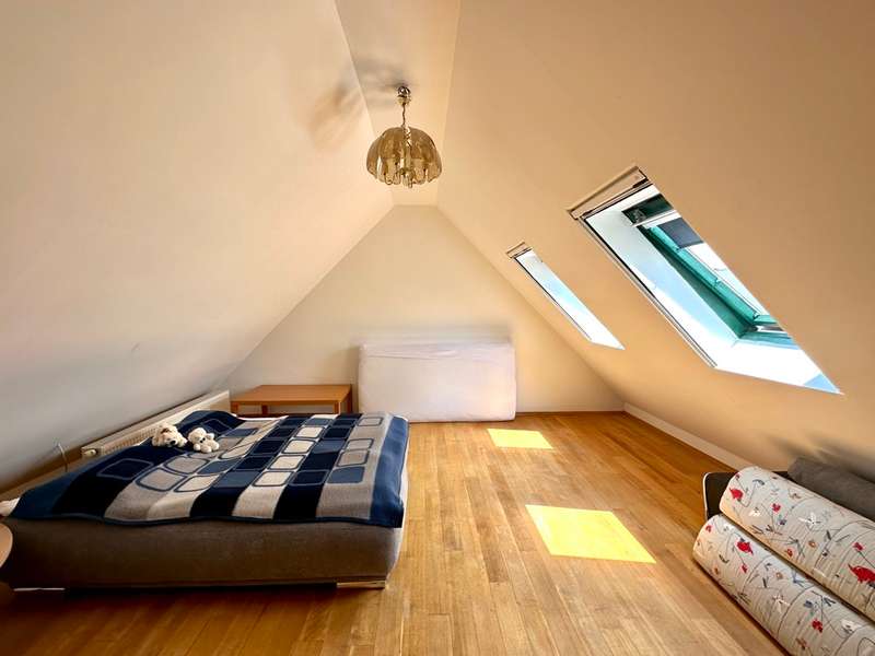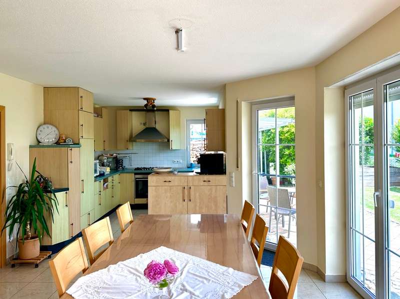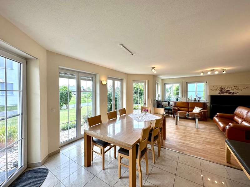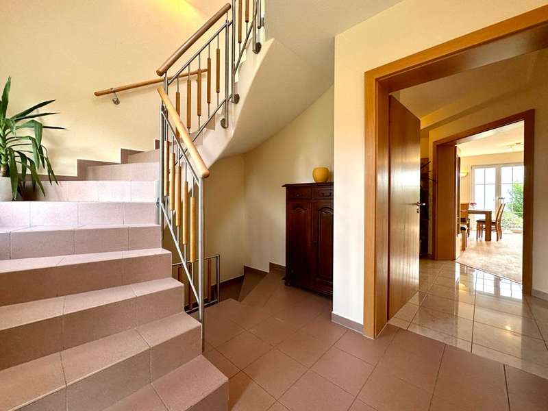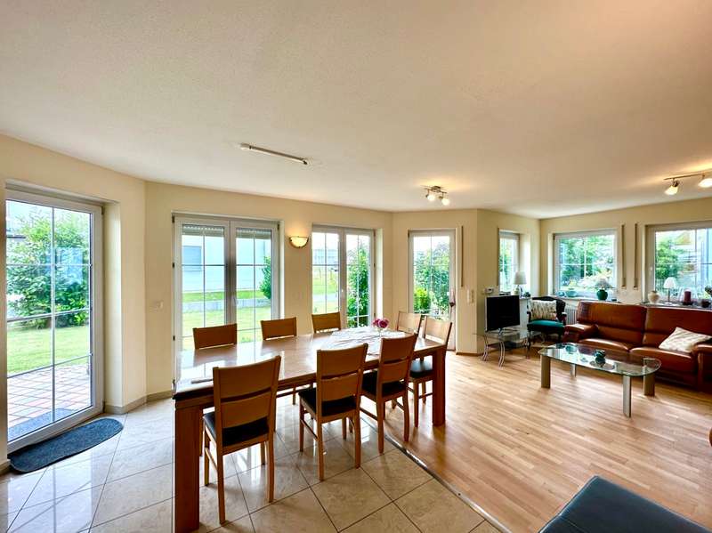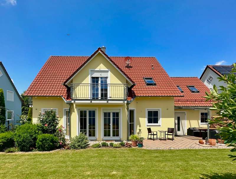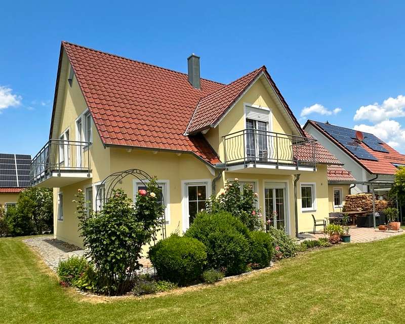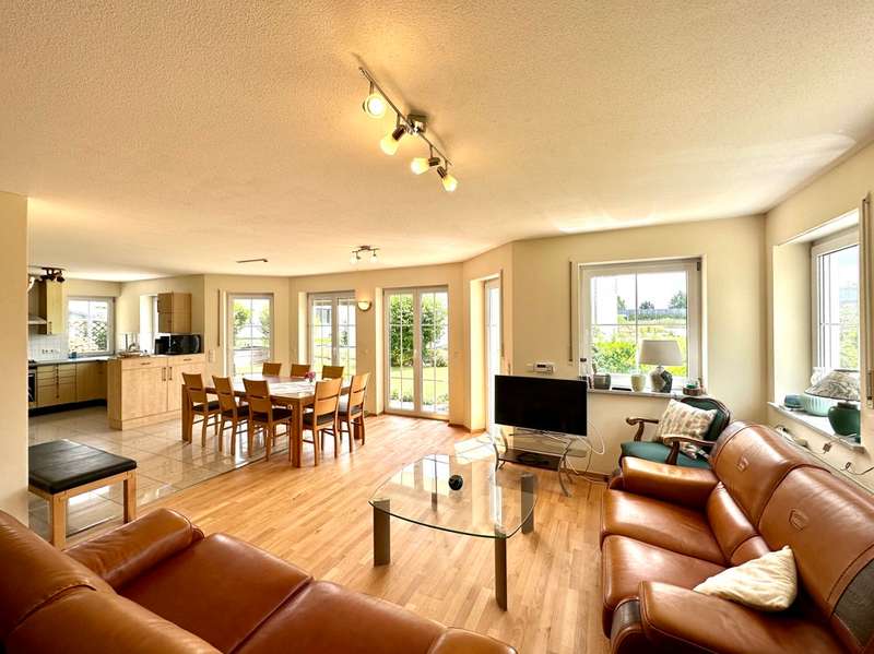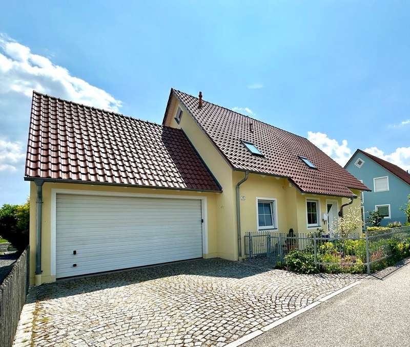 The single-family house offered here is located in a quiet and preferred residential area in the new residential area Birkenfeld in Neutraubling. The surrounding area is characterized by its pleasant atmosphere and a high quality of living. The location offers a good connection to the surrounding cities and the infrastructure of the region. The detached house presents itself in a very well-kept and as good as new condition. It extends over a generous living space of approx. 220 sqm, which is distributed over a total of 7 rooms. Another special feature of the house is the basement, which has two additional rooms for a guest room and a sauna wellness area with infrared cabin. The property covers 500 sqm and offers a beautifully landscaped and maintained garden with valuable plant life, and invites you to relax and linger outdoors, and further offers a covered terrace area. The house was designed with a family of three children in mind. As the children grow older, the physical layout of the house allows for separation between parents and teenagers over two levels. In addition, the house offers ample space for offices or multiple home offices, so there is also the possibility of accommodating business activities in one's own home. If necessary, a granny apartment can be separated with minimal effort to allow one's children to have a separate apartment. During the construction of the house, attention was paid to and met the standards for low-energy houses in force at the time. The house impresses with high-quality oiled parquet flooring and Italian porcelain stoneware tiles. Upon entering the house, one enters a spacious entrance area with a separate area for the wardrobe. From there you enter the hallway which leads to the living area on the first floor. The living area includes a very spacious living room with dining area and open kitchen. The kitchen is equipped with all technical appliances and has a counter area. Floor-to-ceiling windows provide plenty of natural light and offer a gorgeous view of the garden. On this level there is also a large bathroom with shower and bathtub and a guest toilet. A staircase with a noble stainless steel handrail leads to the 1st floor, which offers a lot of potential with numerous rooms and generous living space. Here, depending on your needs, children's rooms, study or guest room can be arranged. Practically, the attic space of the garage can be used as a hobby room. Two balconies in southern and western orientation offer a beautiful view. On this level there is also a large bathroom with guest toilet. A large dormer window provides a pleasant living feeling. In the basement, which was built in a watertight tub, there are more rooms with versatile usable space. Here you will find a wellness room with a small bathroom and sauna with infrared cabin, as well as a room for guests or usable as a hobby and game room. The large garage has an automatic roll-up door for a large car and offers plenty of storage space. The house has an excellent energy concept with a modern gas condensing heating system, which is practically installed in the roof area. There is also the possibility to switch to a modern air-heat pump heating concept or connection to district heating at any time. Empty tubes from the roof truss area to the electrical cabinets allow the installation of a photovoltaic system. This single-family house in Neutraubling offers a harmonious living ambience in a quiet and preferred location. With a generous living space, it offers enough room for a family with children. The high quality equipment, the possibility of spatial separation and the versatile usage possibilities make this house an attractive offer. The good energetic standard and the options for the use of renewable energies contribute to sustainability. We cordially invite you to personally visit this beautiful family home and convince yourself of its charm and advantages. Do not hesitate to contact us for more information or to arrange a viewing appointment.