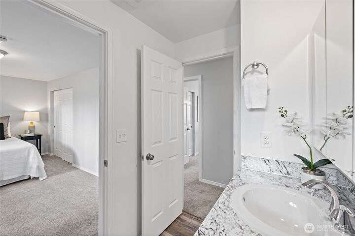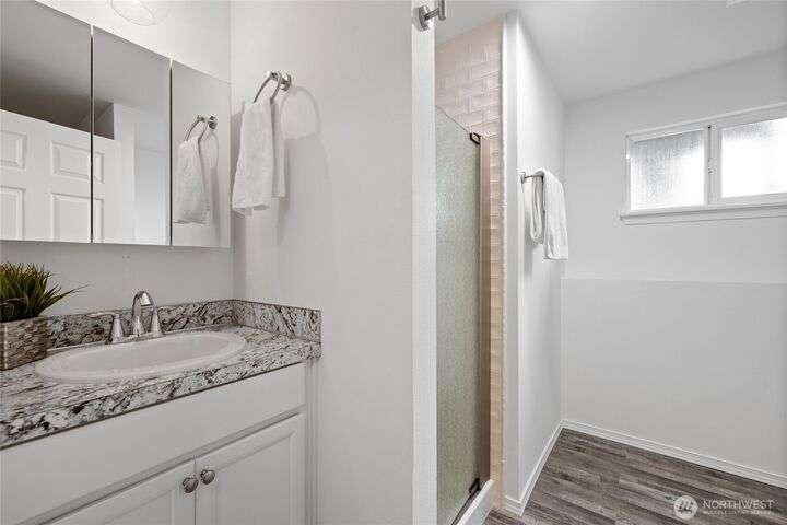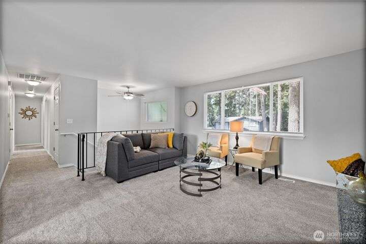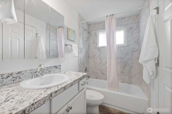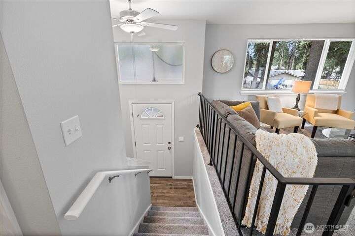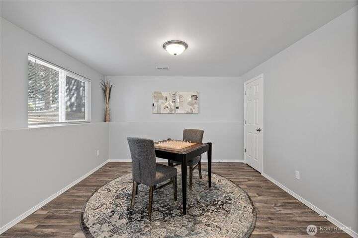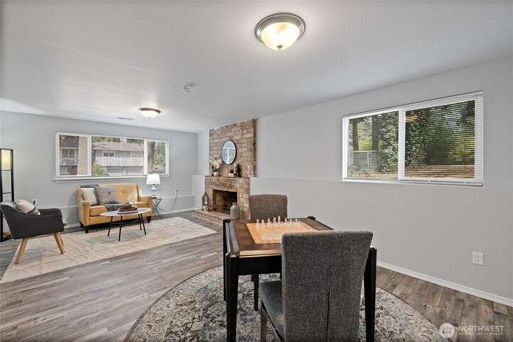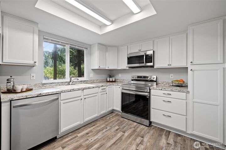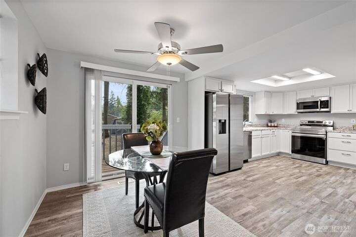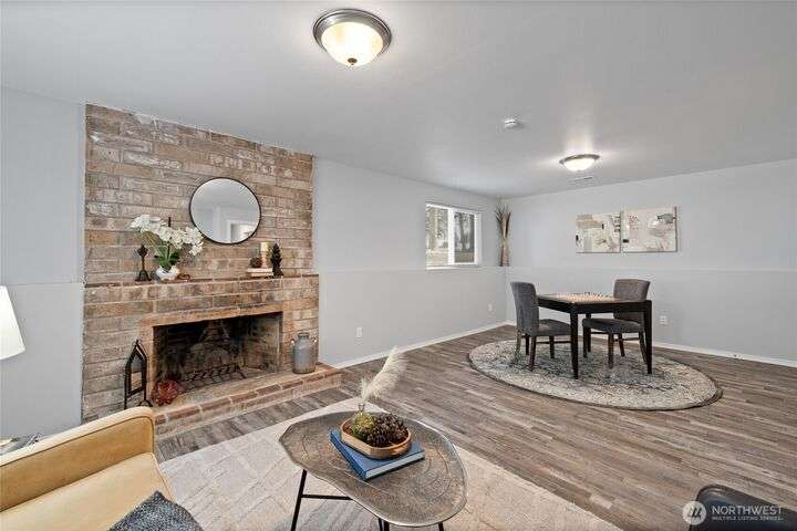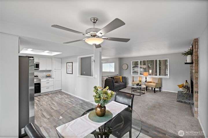 As you step inside this tastefully “down to the studs” remodeled Fredrickson home you'll be swooned by the attractive finishes throughout + a NEW ROOF, NEW HEAT PUMP, H20 HEATER & FRESH EXTERIOR PAINT! On the upper level this almost new abode features an all NEW kitchen w/SS APPLIANCES & adjoining eating area, the primary bedroom w/ adjoining continental full/main bath, 2 add’l bedrooms + living room with a cozy fireplace. On the lower level you’ll find a spacious family room with a 2nd fireplace, LVP flooring plus a ¾ bathroom/utility room combo w/custom tile shower & access to the 2 car garage. The ¼ acre corner lot offers a huge fenced backyard with plenty of room to roam complete w/ a deck & garden shed! Easy access to JBLM!
