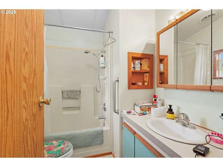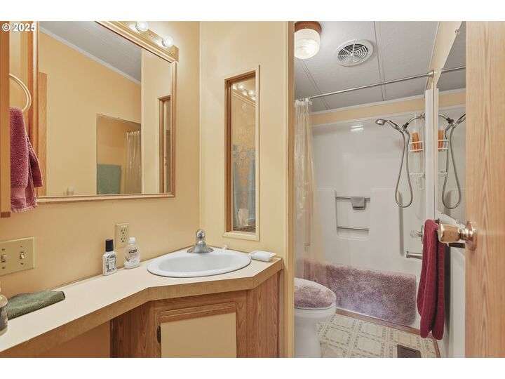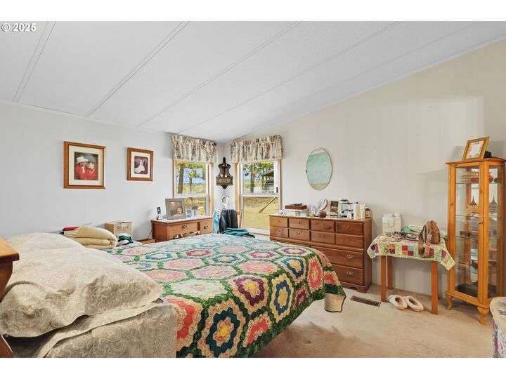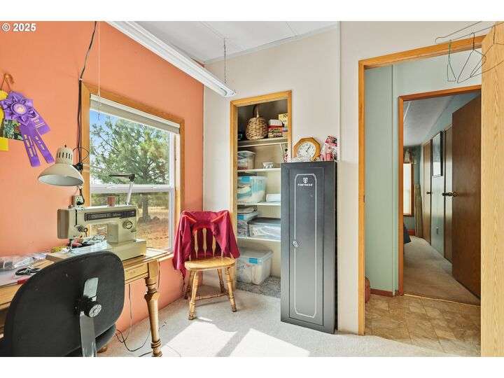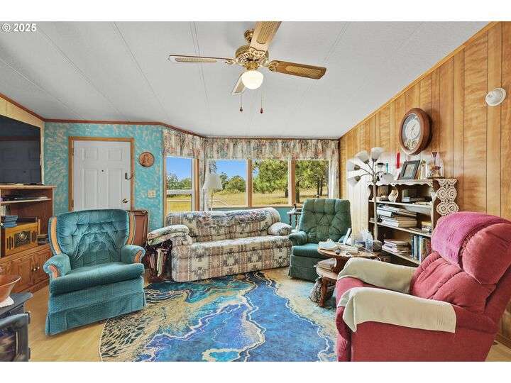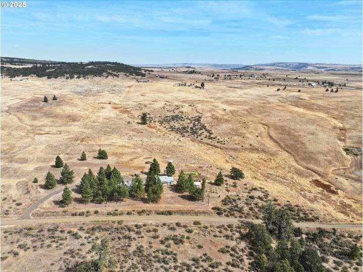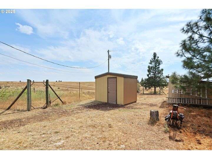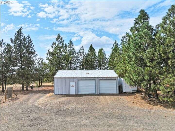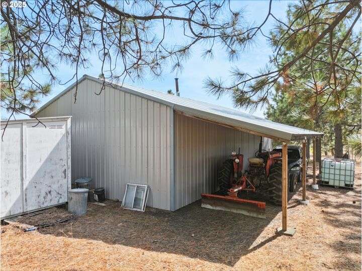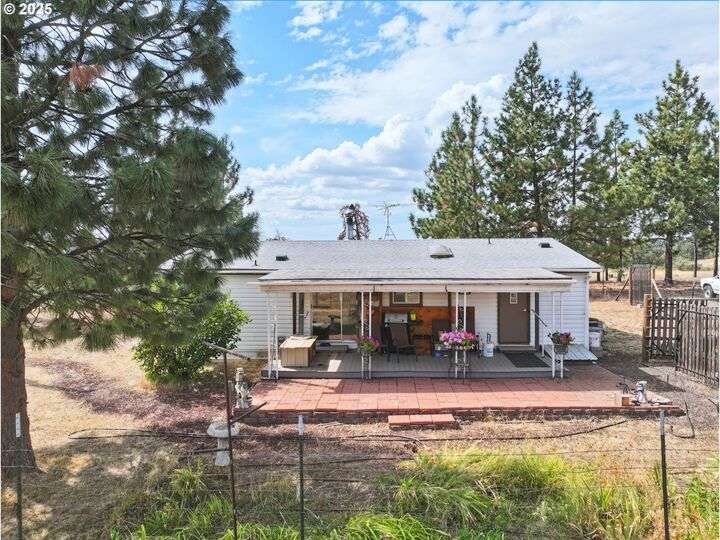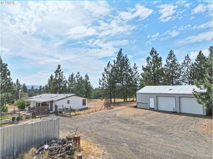 Charming 3-bedroom home on 20 acres with a stunning Mt. Hood view. Enjoy the perfect blend of privacy and convenience with this well-maintained 3-bedroom, 2-bathroom manufactured home situated on 20 acres-just minutes from town! With 1,068 sq. ft/of comfortable living space, this turn-key property offers a peaceful country setting without sacrificing access to amenities. Step inside to find custom Knotty Pine kitchen cabinets, a large pantry, eat-at bar, and all kitchen appliances included. Laminate flooring runs through the main living areas, and a cozy wood stove keeps the home warm during chilly winter months. A heat pump ensures year-round comfort with efficient heating and cooling. Two of the three bedrooms are generously sized, while the third is ideal for a home office or guest room. The dining area features a sliding glass door that leads to a covered back porch-perfect for relaxing or entertaining --while the living room offers breathtaking views of Mt Hood. Outside, you'll love the fenced yard, drip-irrigated garden area, and mature fruit trees. The pump house is super-insulated and enlarged for ample cold storage. A heated 24' x 36' detached metal shop/garage features a wood stove, concrete floor, two overhead doors, a man door, and 110/220power--ideal for hobbies, storage, or a home business. Recent updates include a newer roof (2021) and newer well pump and wiring (2016). Whether youre a first-time home buyer, downsizing for retirement, or just looking for space to spread out, this property offers exceptional value and comfort. Don't miss your chance to own this slice of paradise--call your agent today to schedule a showing!